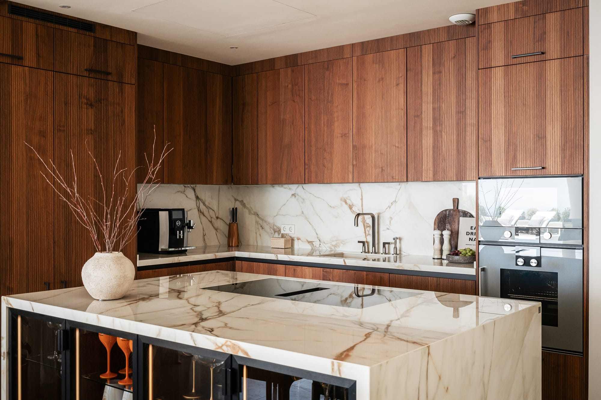 At the heart of the home lies an open-plan space that blends the living room, dining area, and a state-of-the-art kitchen equipped with Gaggenau and Miele appliances, as well as a floor-to-ceiling wine display. Fully automated windows open to seamlessly connect the indoors with the exterior, creating a bright, modern, and inviting atmosphere.