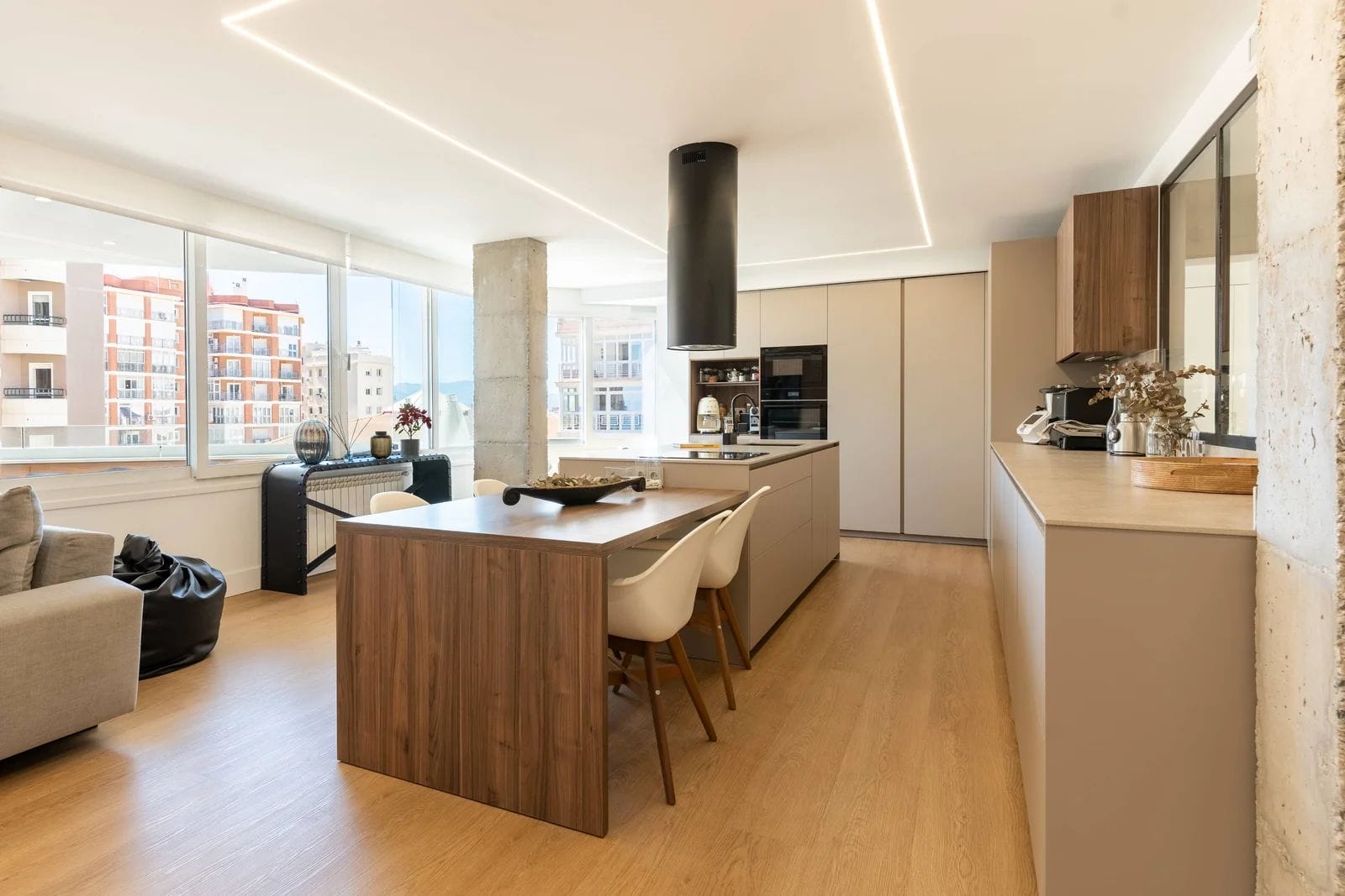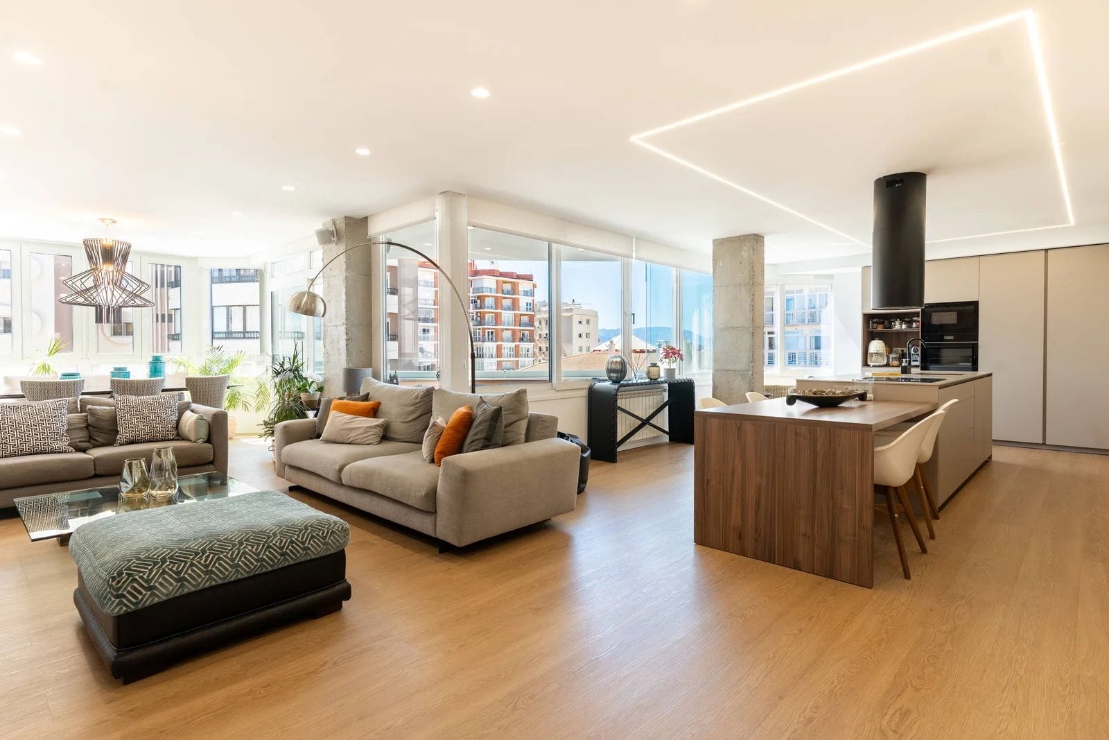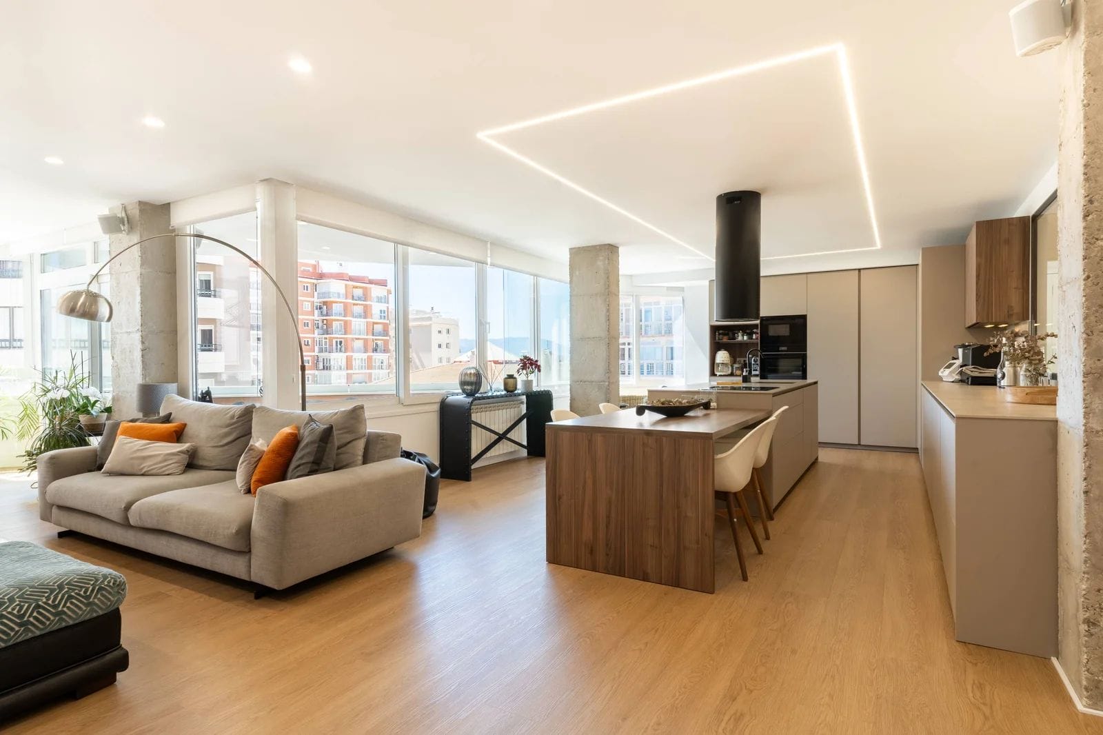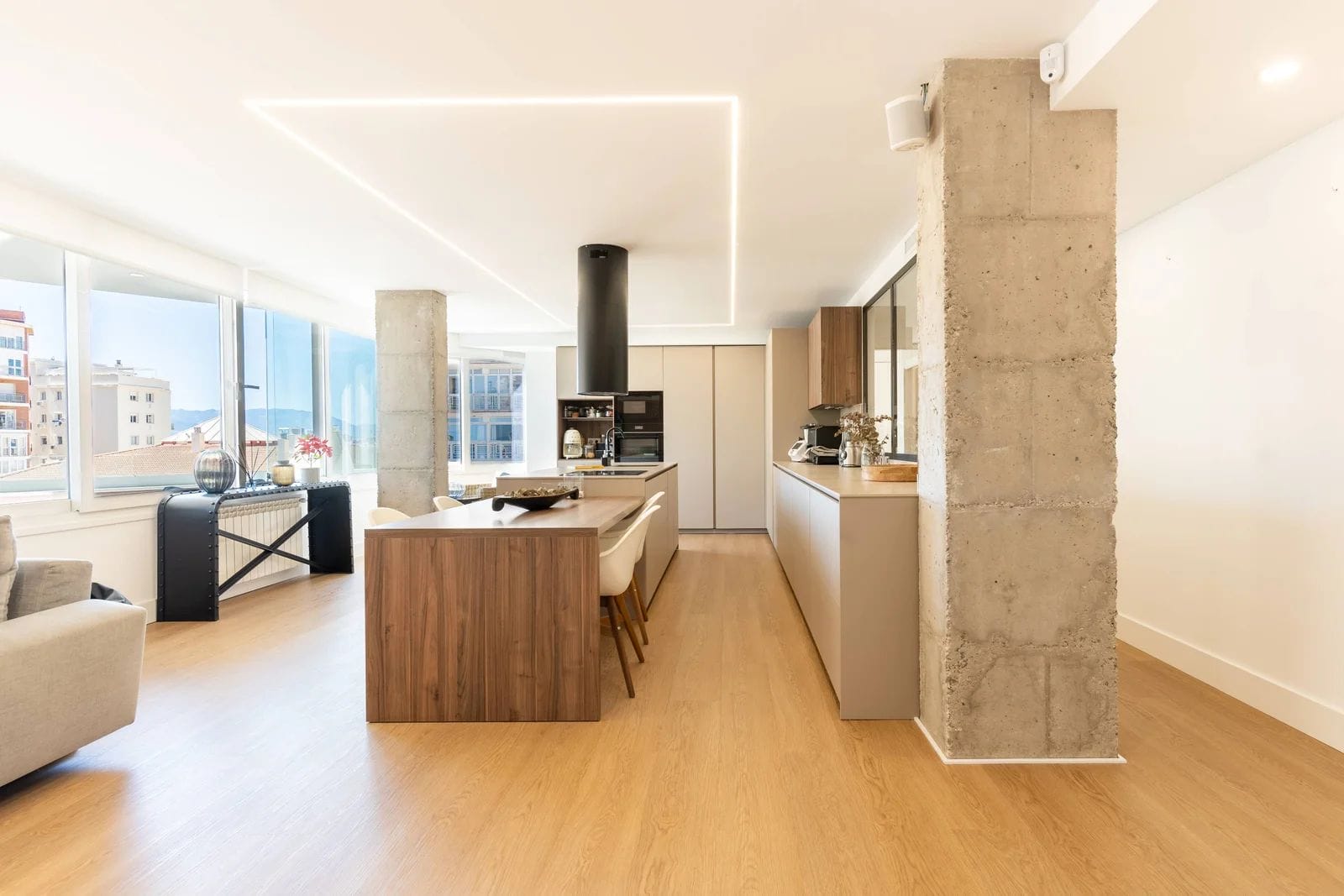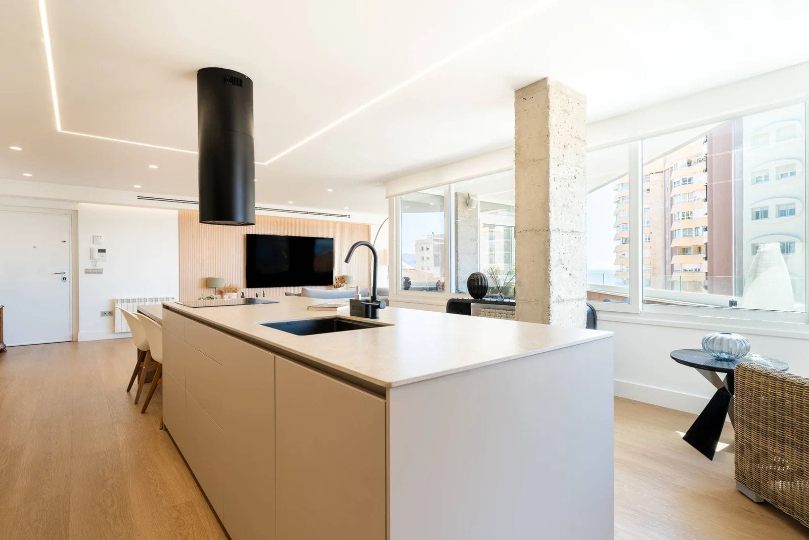 The property has been recently refurbished with top-quality materials, presenting a sleek, modern aesthetic and a thoughtfully designed layout, designed to maximize natural light. The main living area unfolds into a spacious open-plan environment, where the lounge, dining area, and fully equipped kitchen coexist in perfect harmony an ideal setting for both relaxed living and social gatherings.