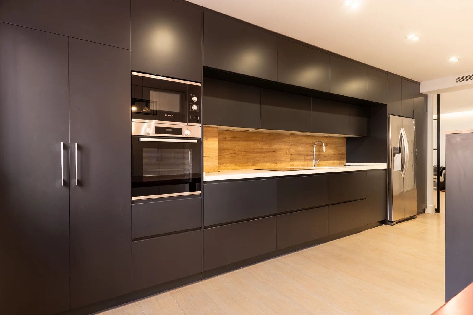 From the main living room, a striking industrial-style sliding door in glass and iron opens onto a fully equipped kitchen, thoughtfully designed to combine elegance with everyday functionality.