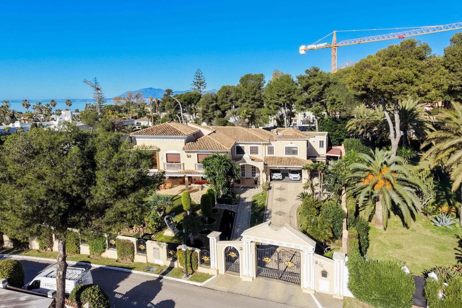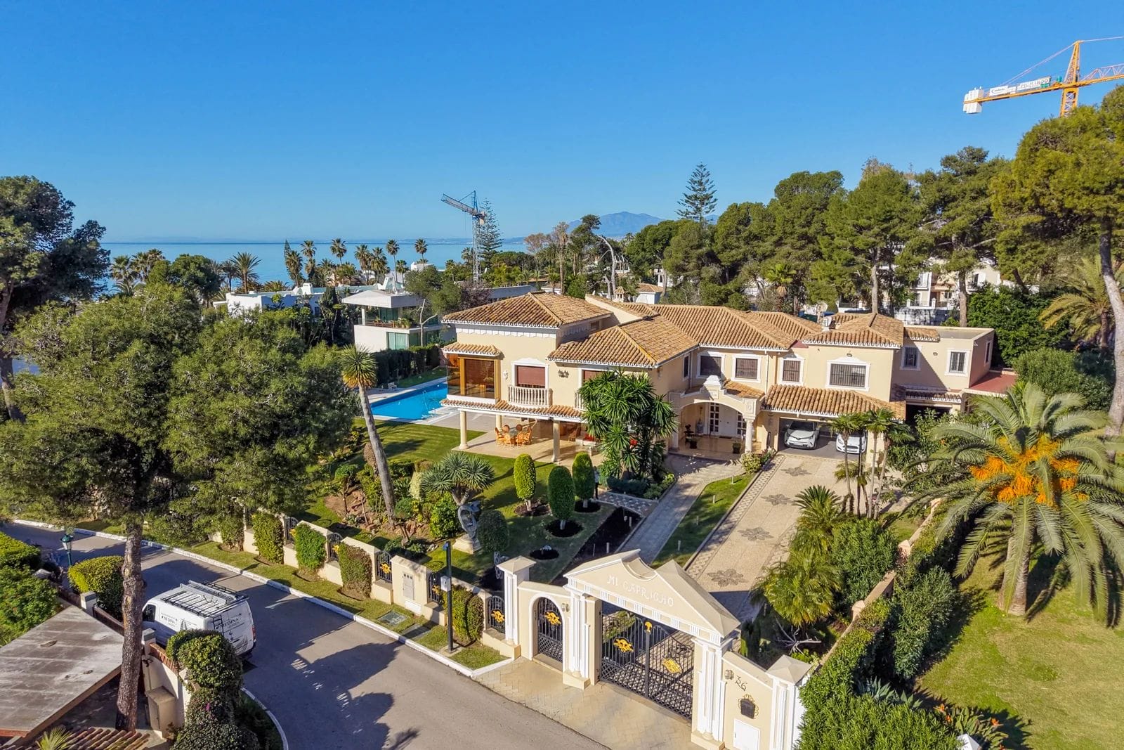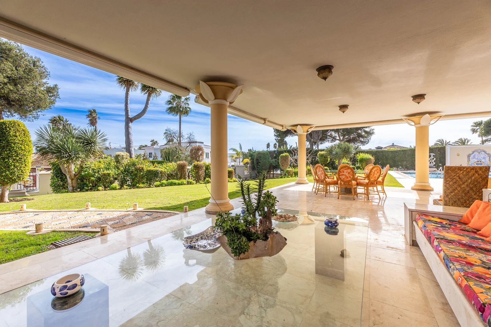 Set on a generous 2,058 m² plot with 852 m² built, the villa presents timeless architecture and expansive living areas designed for both family living and entertaining. The interior layout is defined by light-filled spaces, multiple lounge and dining areas, and a fully equipped kitchen, all visually connected to the landscaped gardens. Large windows and terraces enhance the indoor outdoor flow, while the mature greenery provides privacy and a tranquil residential atmosphere rarely found so close to the coastline.