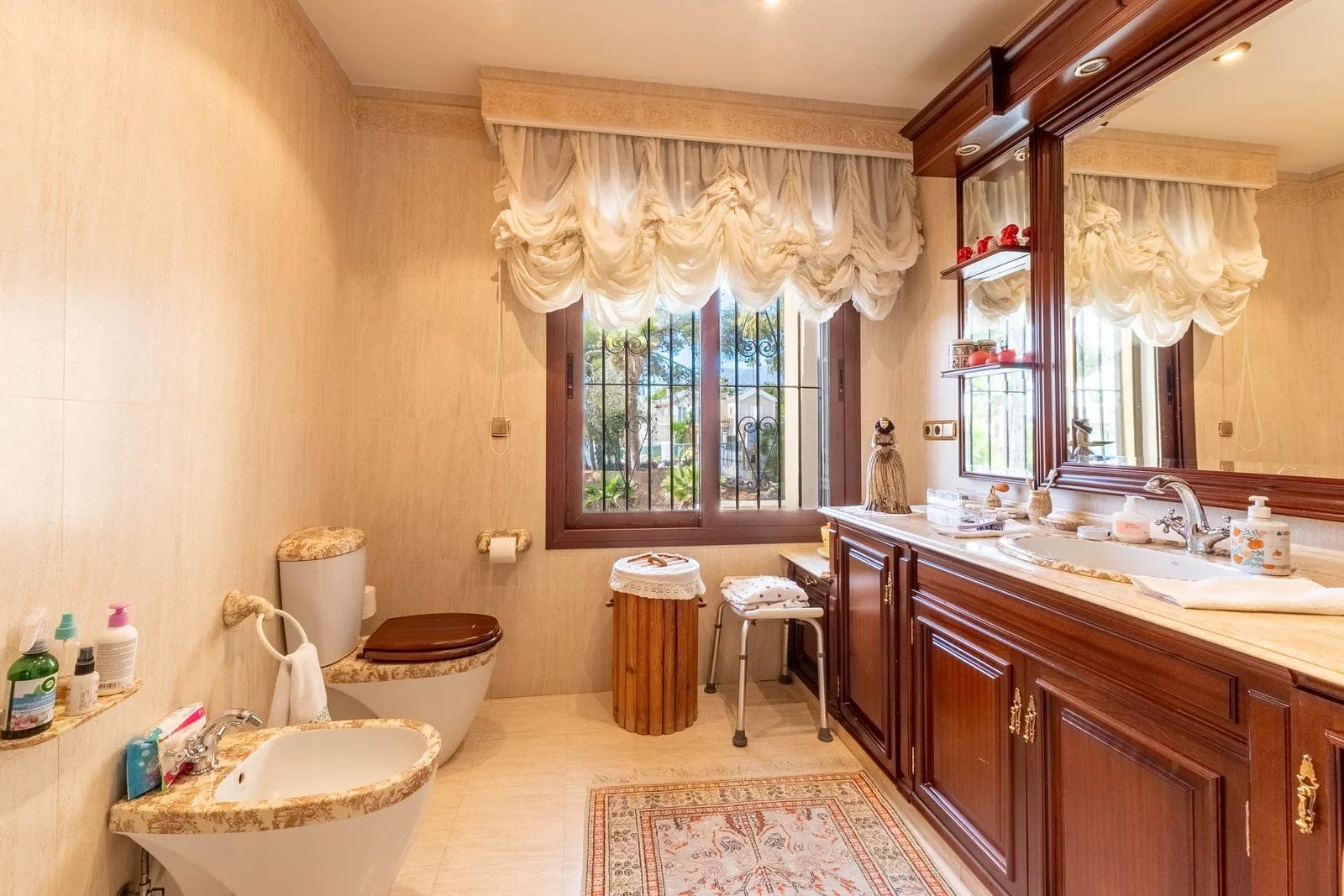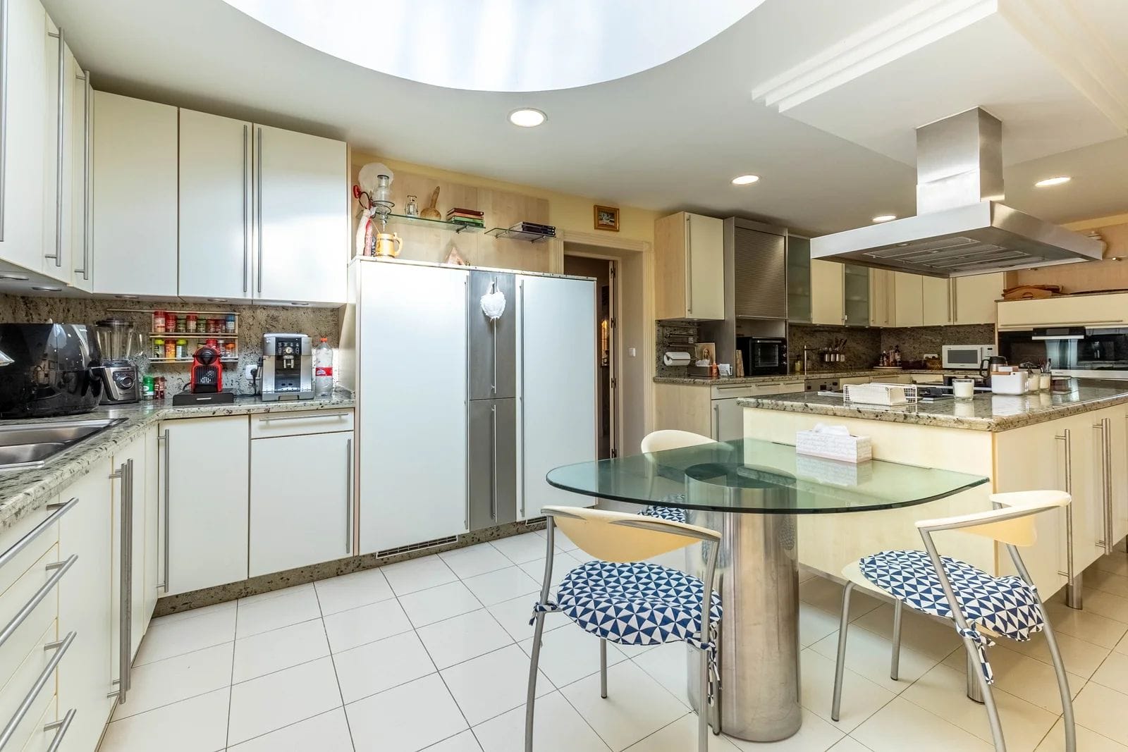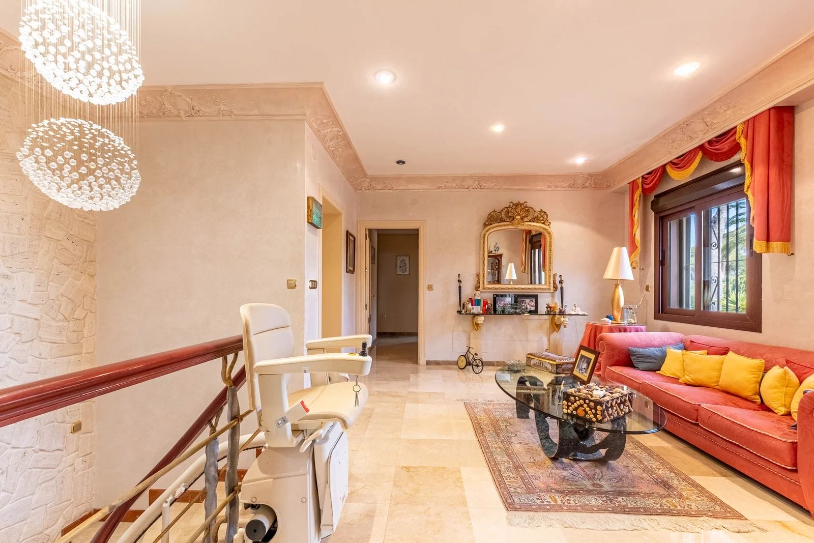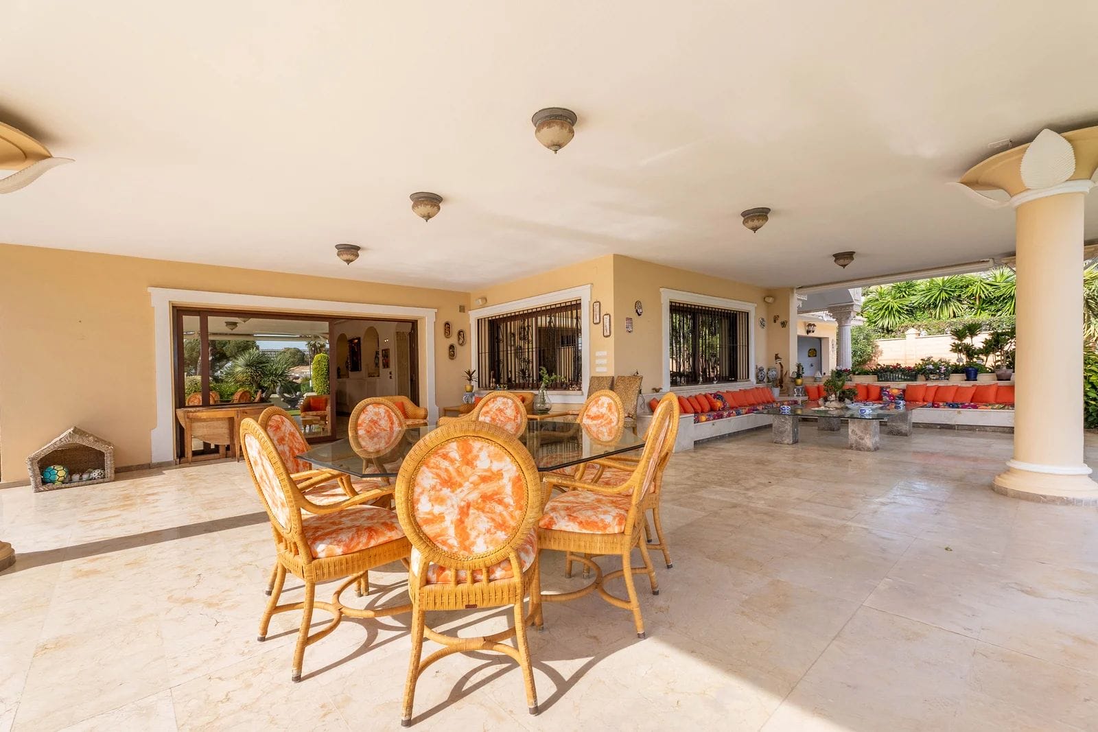 Set on a generous 2,058 m² plot with 852 m² built, the villa presents timeless architecture and expansive living areas designed for both family living and entertaining. The interior layout is defined by light-filled spaces, multiple lounge and dining areas, and a fully equipped kitchen, all visually connected to the landscaped gardens. Large windows and terraces enhance the indoor outdoor flow, while the mature greenery provides privacy and a tranquil residential atmosphere rarely found so close to the coastline.