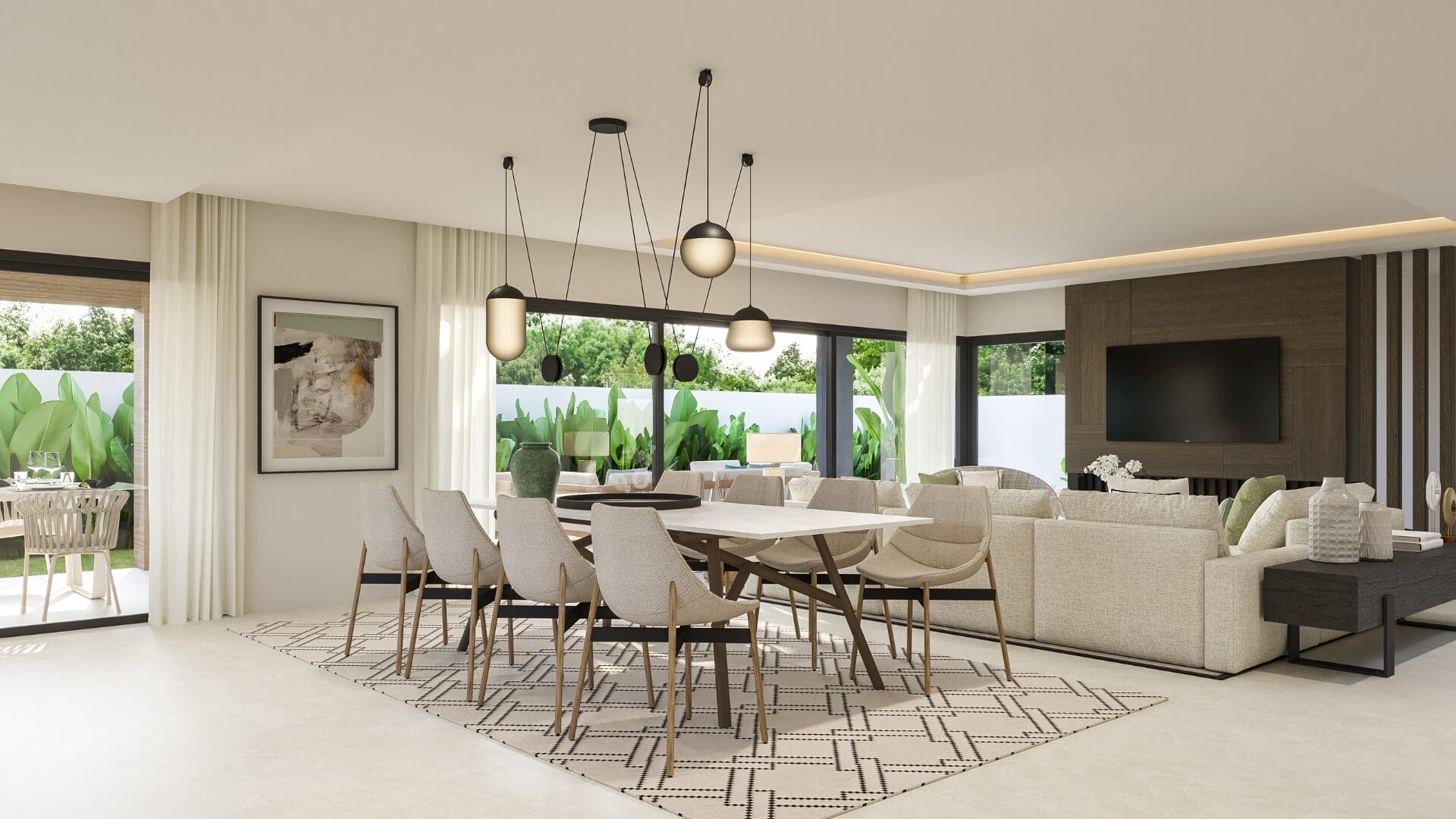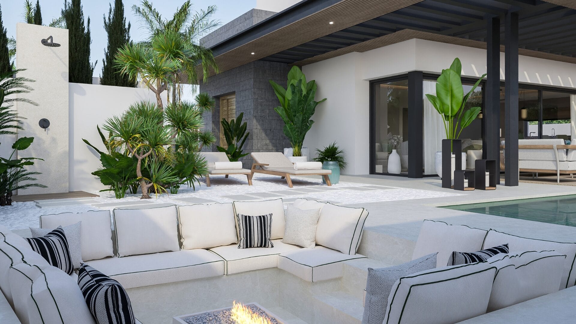 The property is well distributed over 4 levels, a basement, ground floor, first floor and rooftop with solarium. It has a private swimming pool and outdoor shower. On the other hand, the outdoor area has a covered dining area, plus another terrace area for sofas and chill-out area which in this villa is more spacious than in the rest. The shaded and sunny areas have been well planned, all framed by a large garden. The villa is surrounded by lush landscaped gardens and the rooms have large windows to let in natural light and to allow the beauty of the garden to be a constant part of the home.