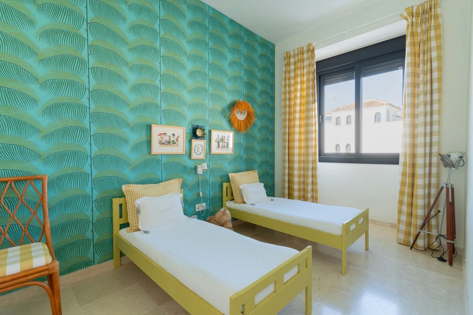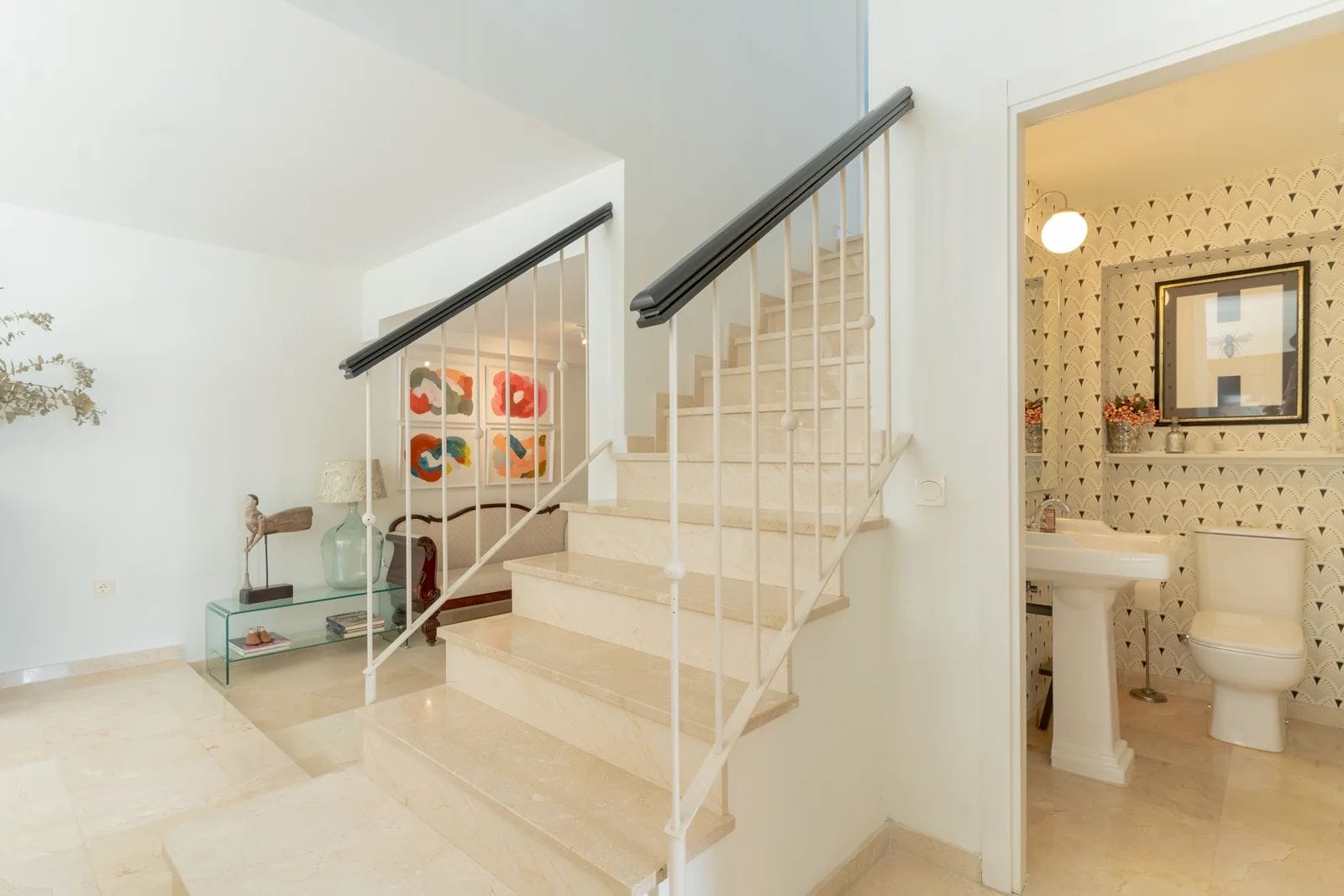 Discover a unique property that redefines the concept of a family home east of Málaga. Situated within a quiet residential urbanization right on the golf course, this townhouse stands out for its full renovation that prioritizes space, natural light, and a curated aesthetic. From the elegant hallway decorated with designer wallpaper to the soaring high ceilings, every detail has been thoughtfully chosen to create a cozy, modern atmosphere that feels like home the moment you enter.
