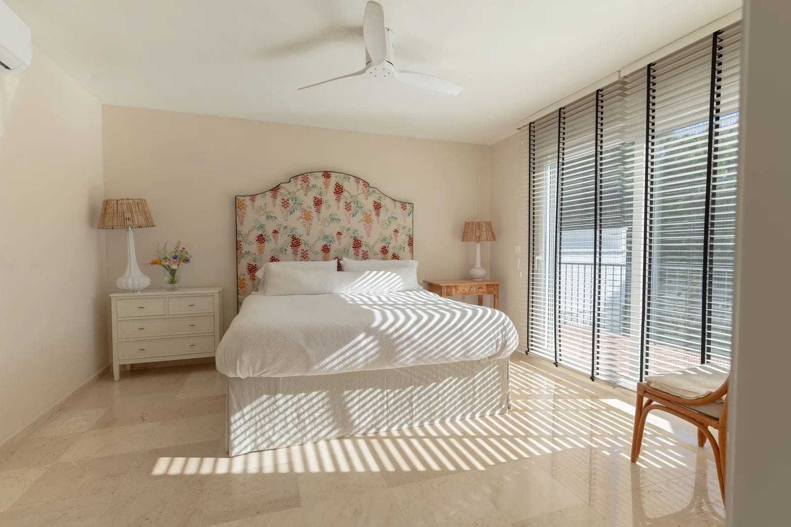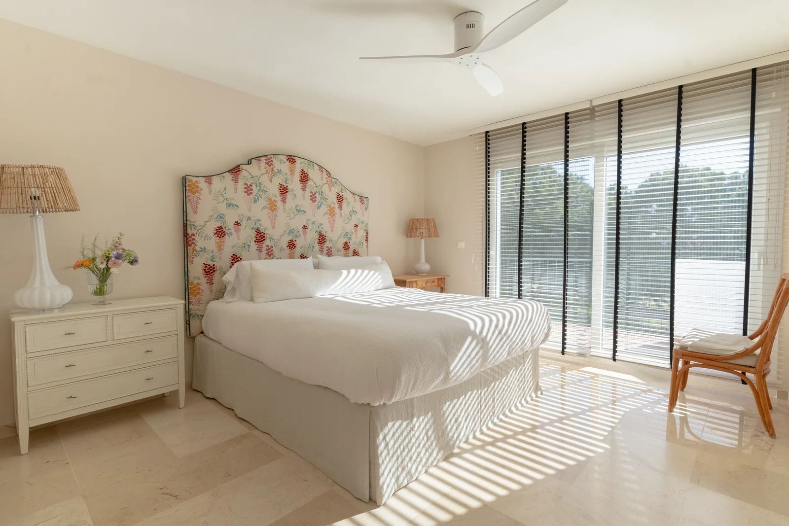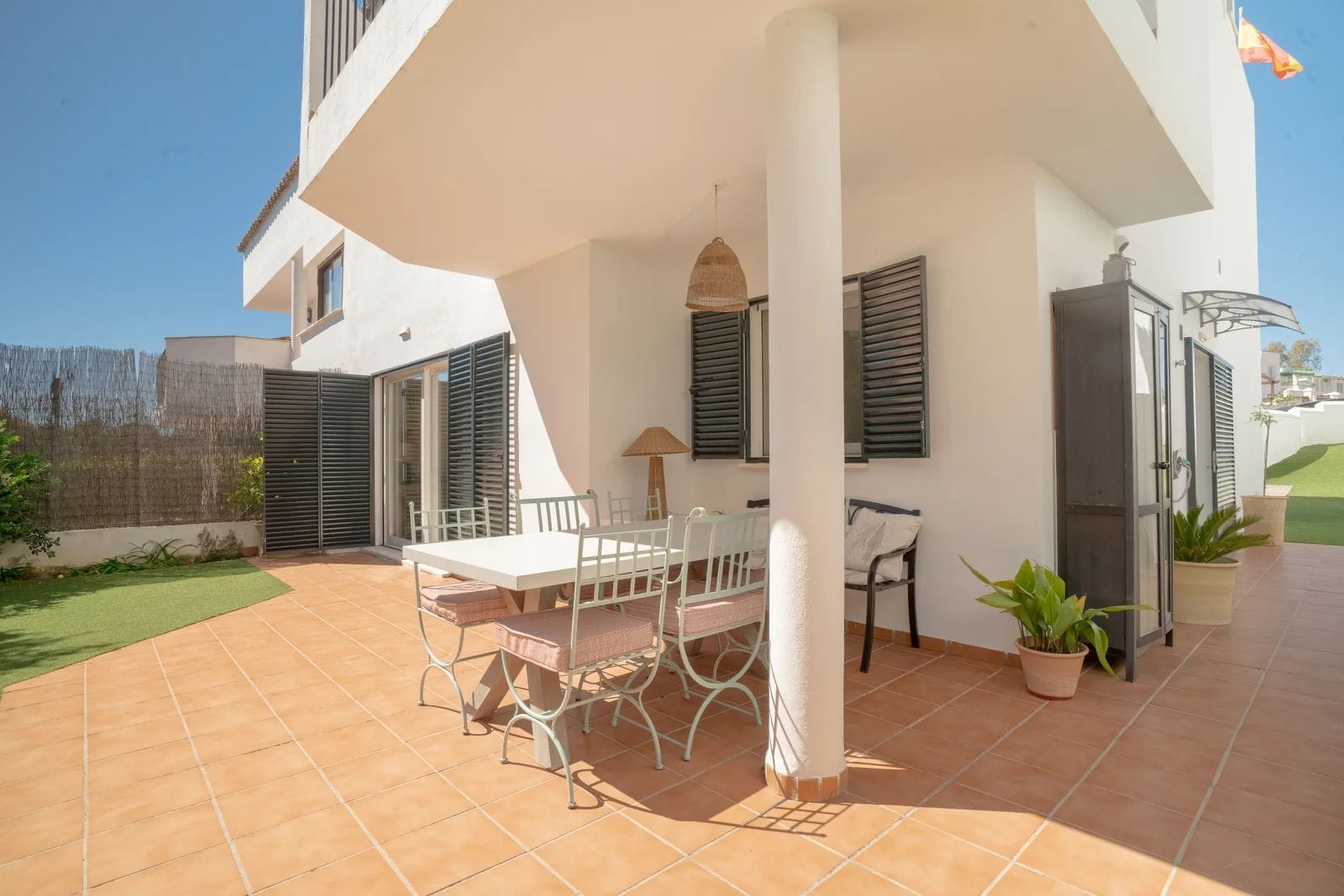 The main floor flows seamlessly into the outdoor terrace and a private, enclosed garden that wraps around the house, creating a secure oasis where children can play freely and you can even enjoy fresh almonds from your own backyard tree. Featuring four spacious bedrooms and four bathrooms, the layout guarantees privacy by dedicating the upper levels to the sleeping quarters. From the first and second floors, the home offers pleasant sea views and vistas of the green fairways, providing the perfect setting for a peaceful home office or a tranquil retreat.