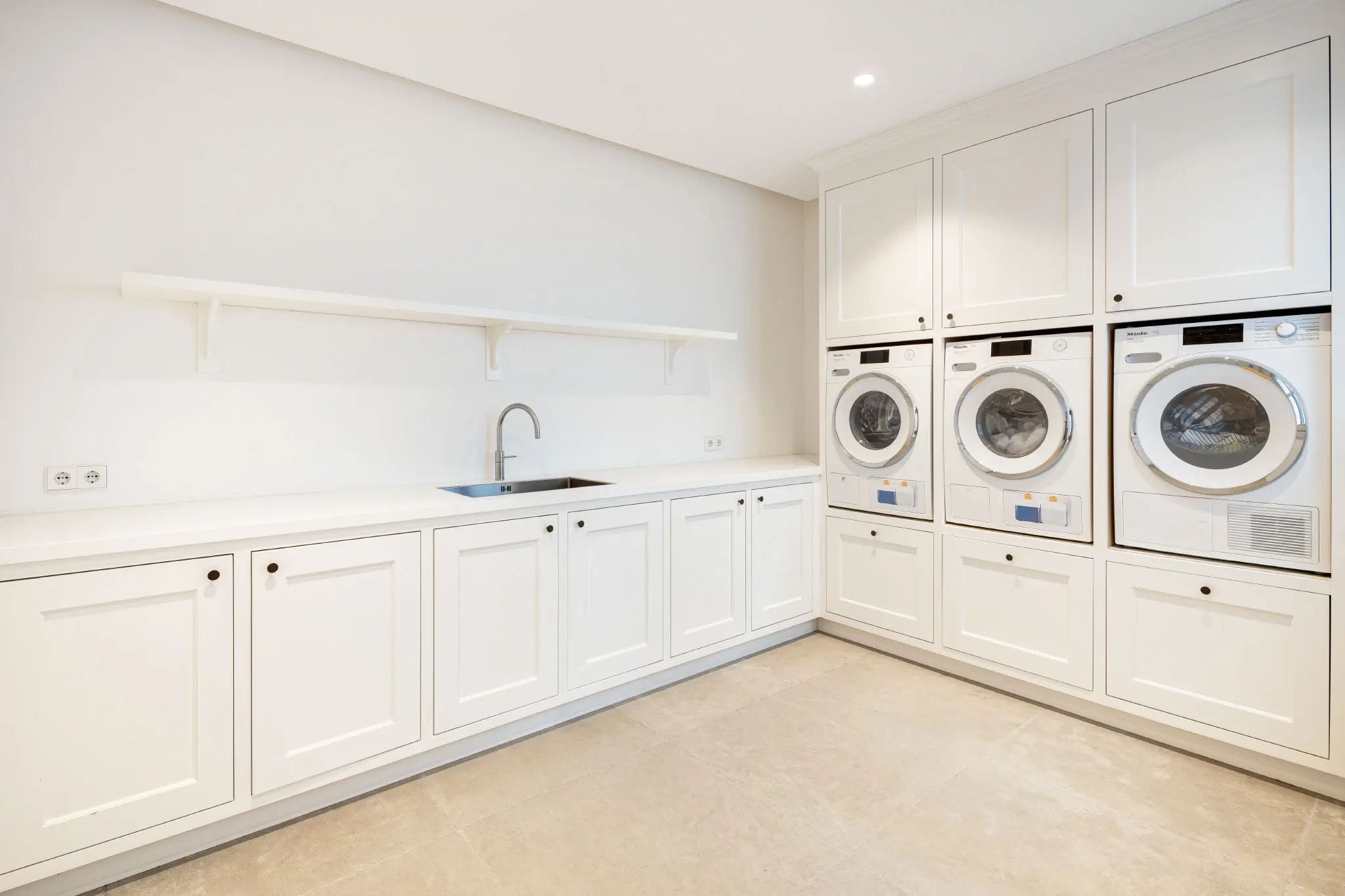 This floor also features two generously sized en-suite bedrooms, both with direct access to the gardens, decorated with natural stone elements that create a relaxing atmosphere. The modern open-plan kitchen, fitted with high-end Gaggenau appliances, blends elegant Scandinavian aesthetics with professional-grade performance, making it perfect for both everyday living and social events.
