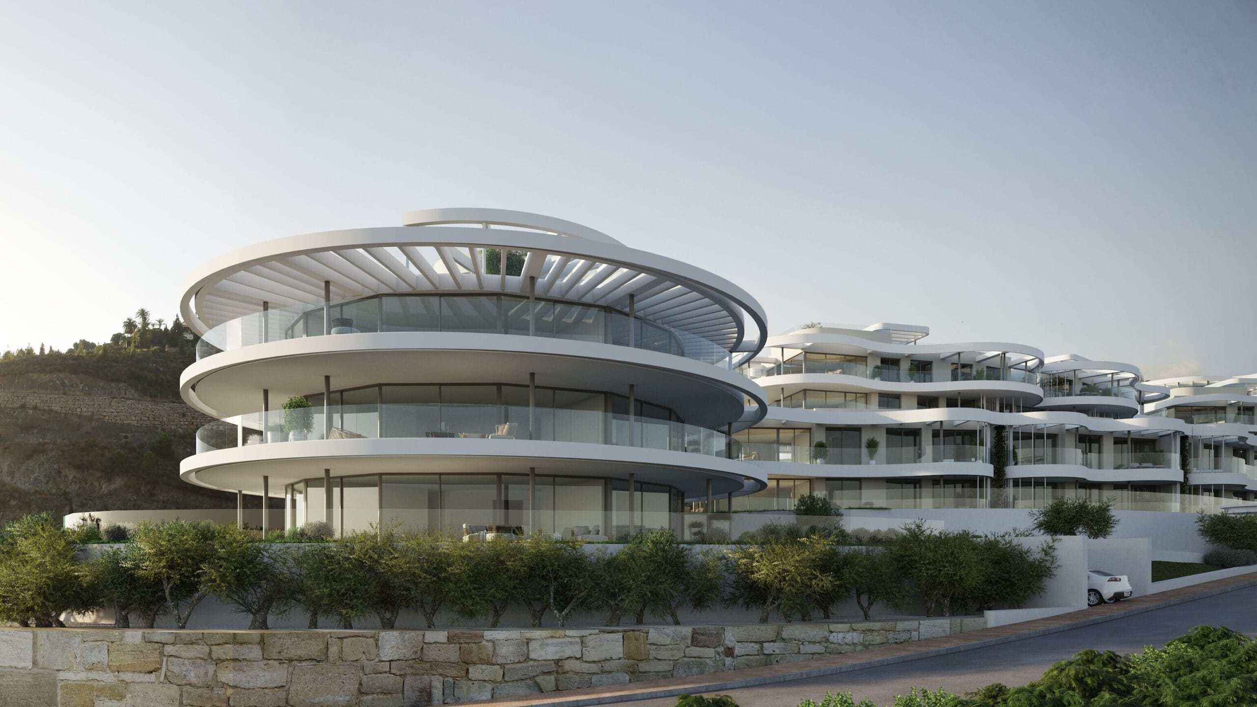 The penthouse has been conceived to make the most of its orientation and views, with its circular design allowing for panoramic views from every angle. It forms part of one of seven boutique complexes within a new development, offering a tranquil and exclusive living experience, surrounded by stunning natural surroundings and luxury properties in the area.