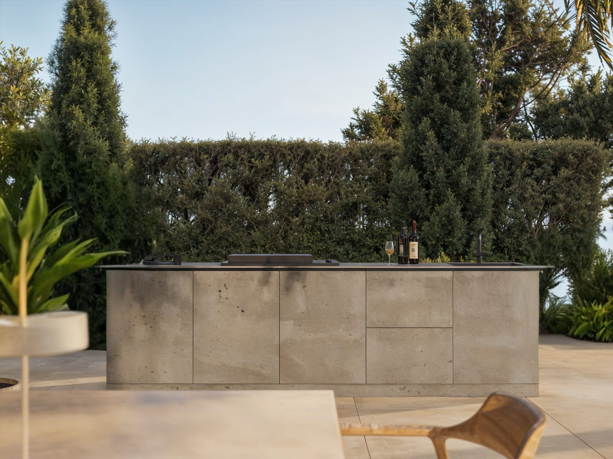 The interior has been conceived to offer a superior level of comfort and sophistication in every detail. Its open-plan layout seamlessly connects the living room, the modern Italian Poliform kitchen with Gaggenau and Bora appliances, and the spacious terraces, creating a harmonious living space. The villa has six bedrooms, each with top-quality finishes. The master suite, a luxurious retreat, is distinguished by stunning sea views and an en-suite bathroom that has been designed to the highest standards of comfort and style.