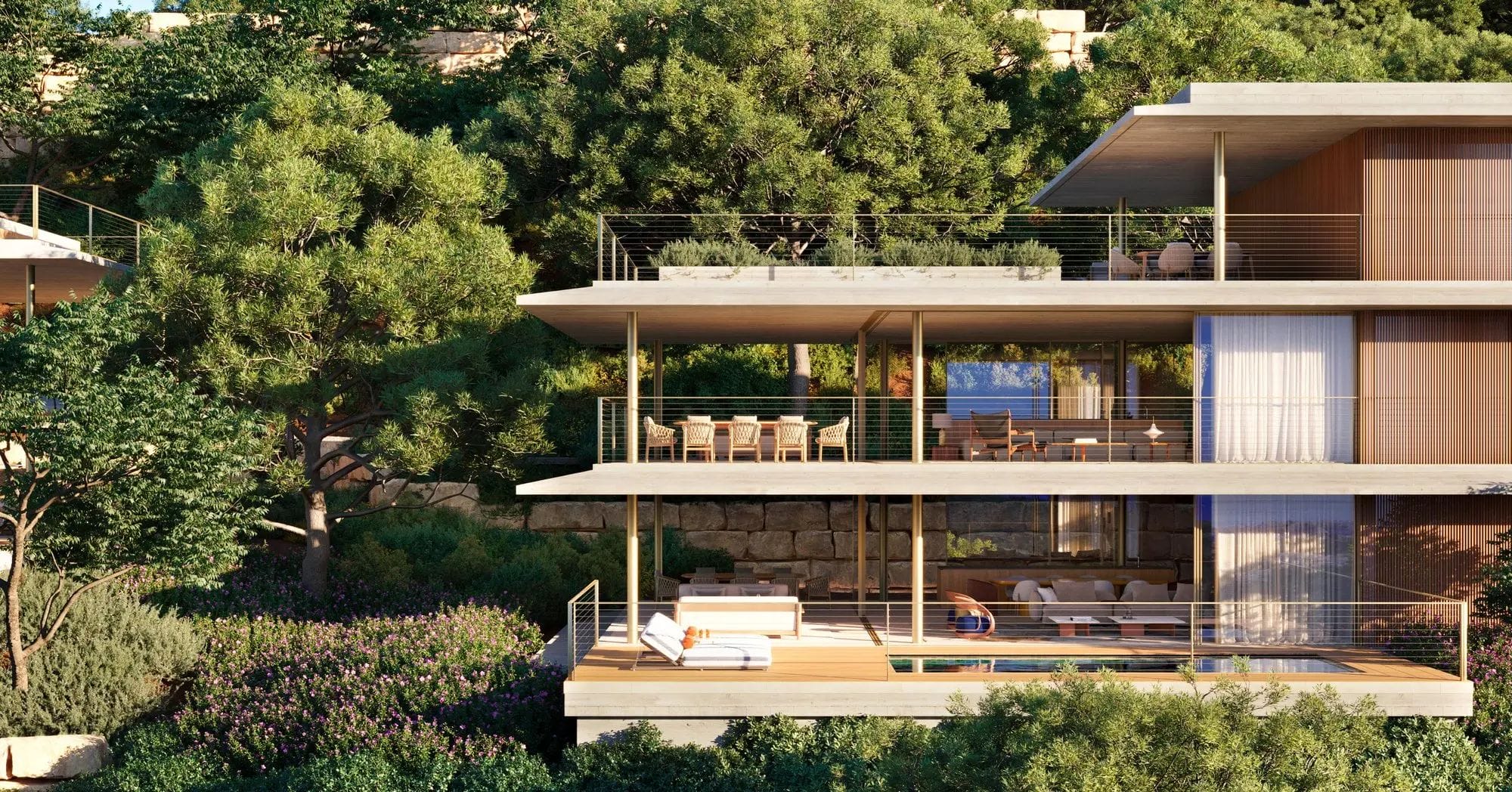 The private exterior space offers an oasis to enjoy the Mediterranean lifestyle. Ideal for outdoor dining, moments of relaxation, or social gatherings, the terrace integrates perfectly with the interiors, enhancing the sense of spaciousness and connection with the environment. All of this is surrounded by gardens and landscapes that evoke the tranquility of an exclusive retreat, combined with customization options ranging from individual heated infinity pools to bespoke gardens designed by Isabel Duprat.