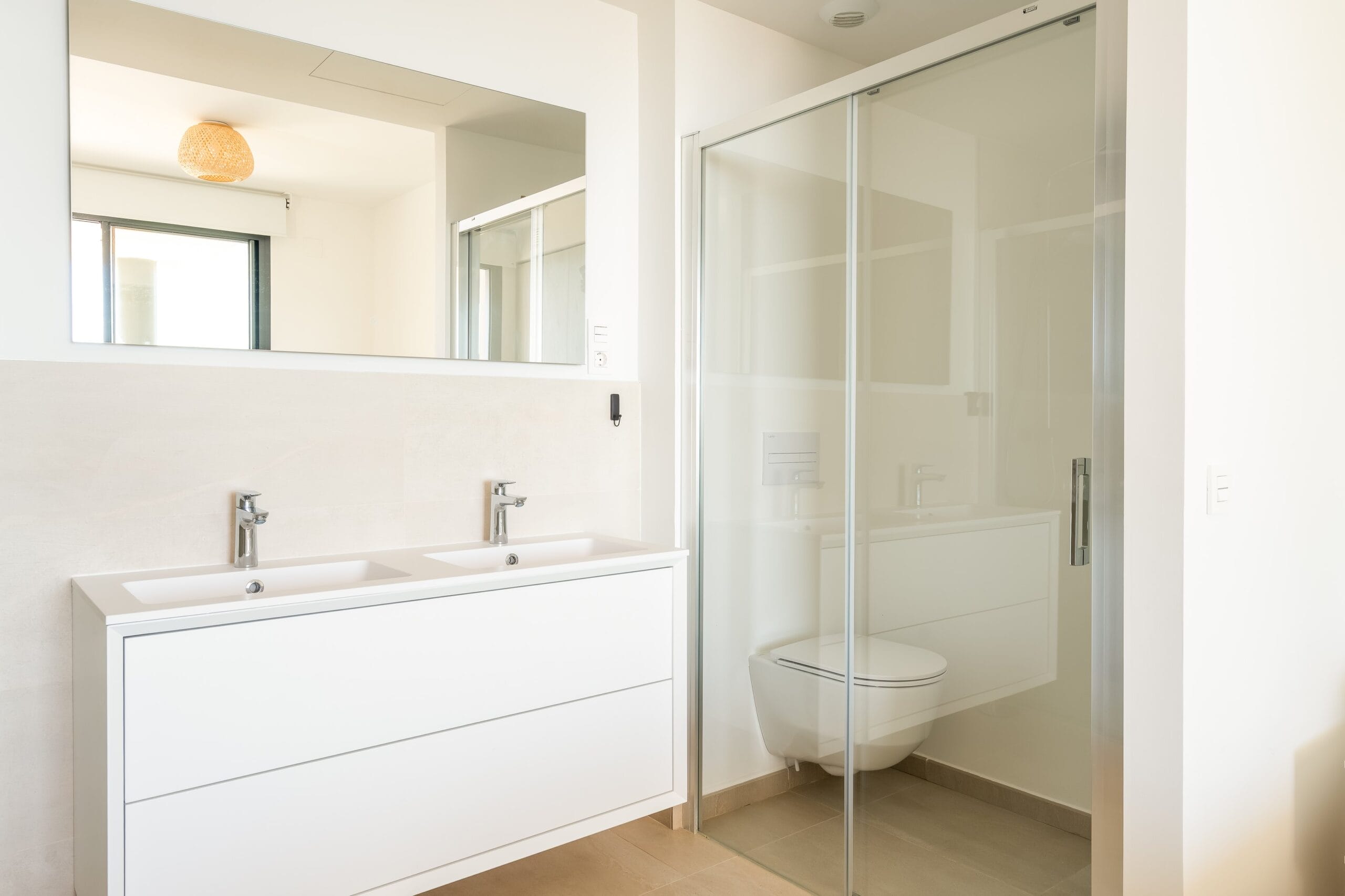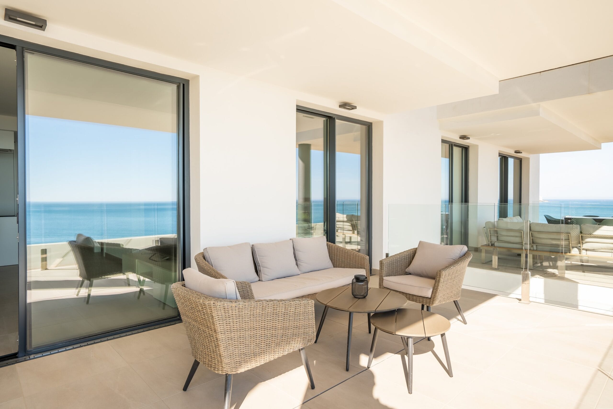 The apartment features a bright open-plan living and dining area with direct access to a spacious terrace showcasing panoramic views of the Mediterranean. The contemporary kitchen is fully equipped, and both bedrooms are generously sized, with the master suite offering an en-suite bathroom and built-in wardrobes. The finishes are of high quality throughout, making this a move-in-ready home.