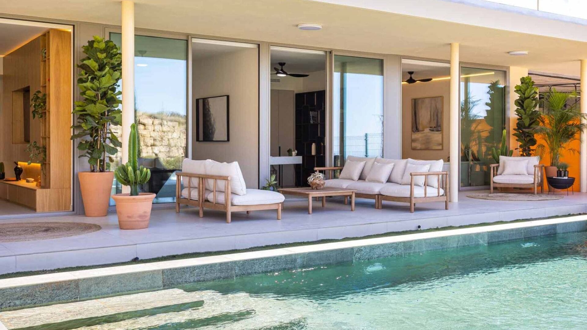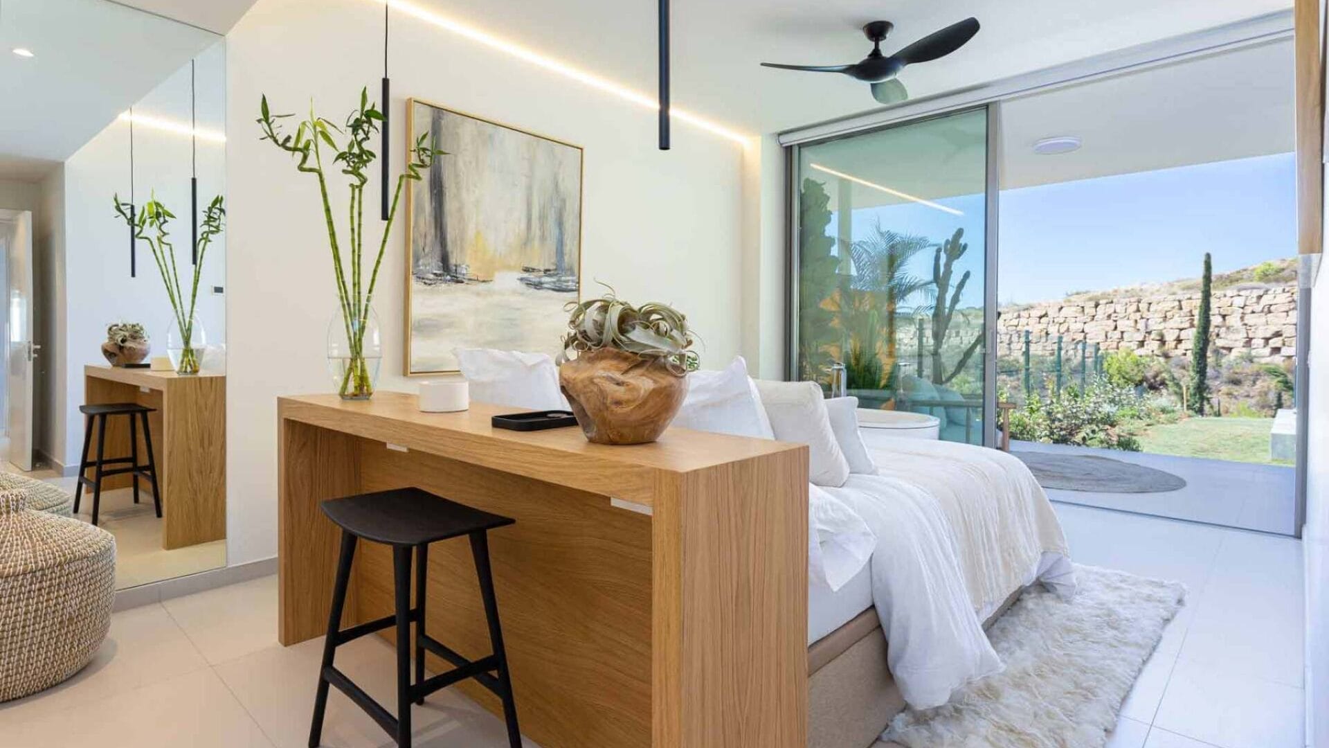The architectural design of the building stands out for its contemporary elegance, blending seamlessly and respectfully with the native vegetation that surrounds it, creating a serene and vibrant setting. The outdoor areas of this home —with over 400 m² of terraces, gardens, and a 23-metre water feature that brings freshness and movement— are conceived as a natural extension of the living space. They offer intimate corners for rest, open spaces to gather with friends, and a constant connection with light, sky, and the privileged Mediterranean climate. A perfect setting to enjoy time slowly, in harmony with nature.