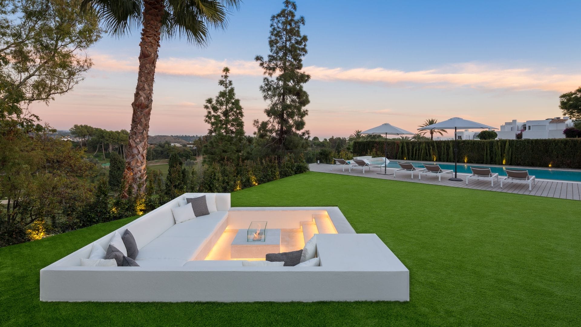 The outdoor space redefines the concept of outdoor living. The property has a large patio with an al fresco dining area ideal for celebrations, an exclusive chill-out area with a built-in fire pit for relaxing at sunset, and a solarium area perfect for enjoying the Mediterranean climate all year round.