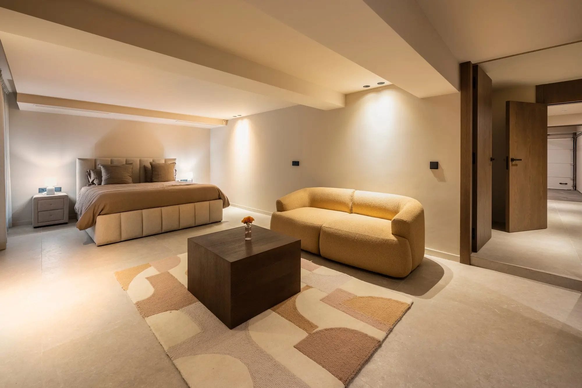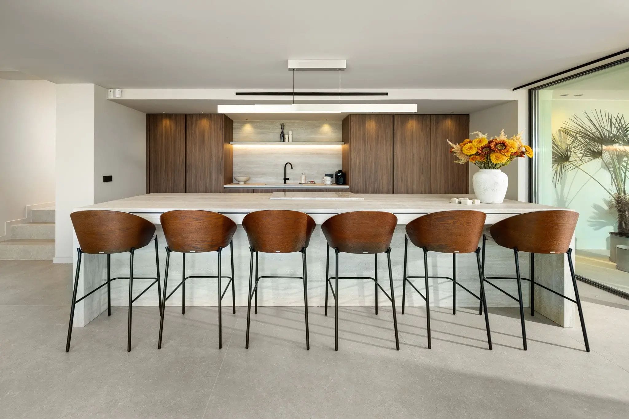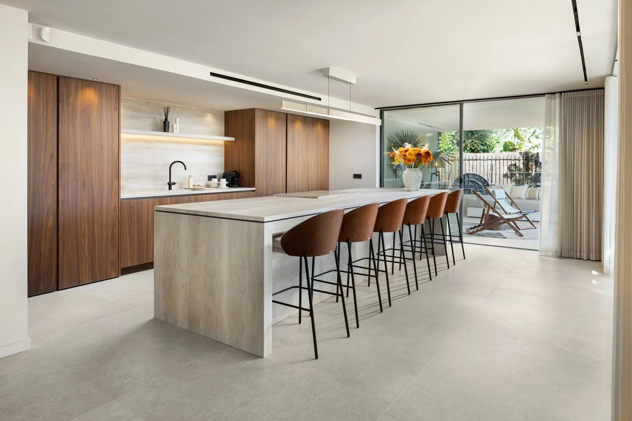 The sloping ceilings and large windows flood the spaces with natural light. The interior design combines clean lines and natural finishes in neutral tones with noble materials, creating an atmosphere of serene elegance. The architectural layout favours a perfect integration between the interior and exterior spaces. Upon entering the property, you will find spacious, bright, and welcoming living areas with high ceilings, which share the limelight with the fully equipped kitchen.