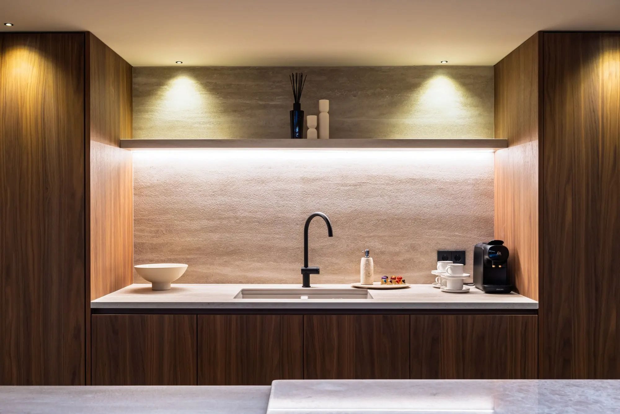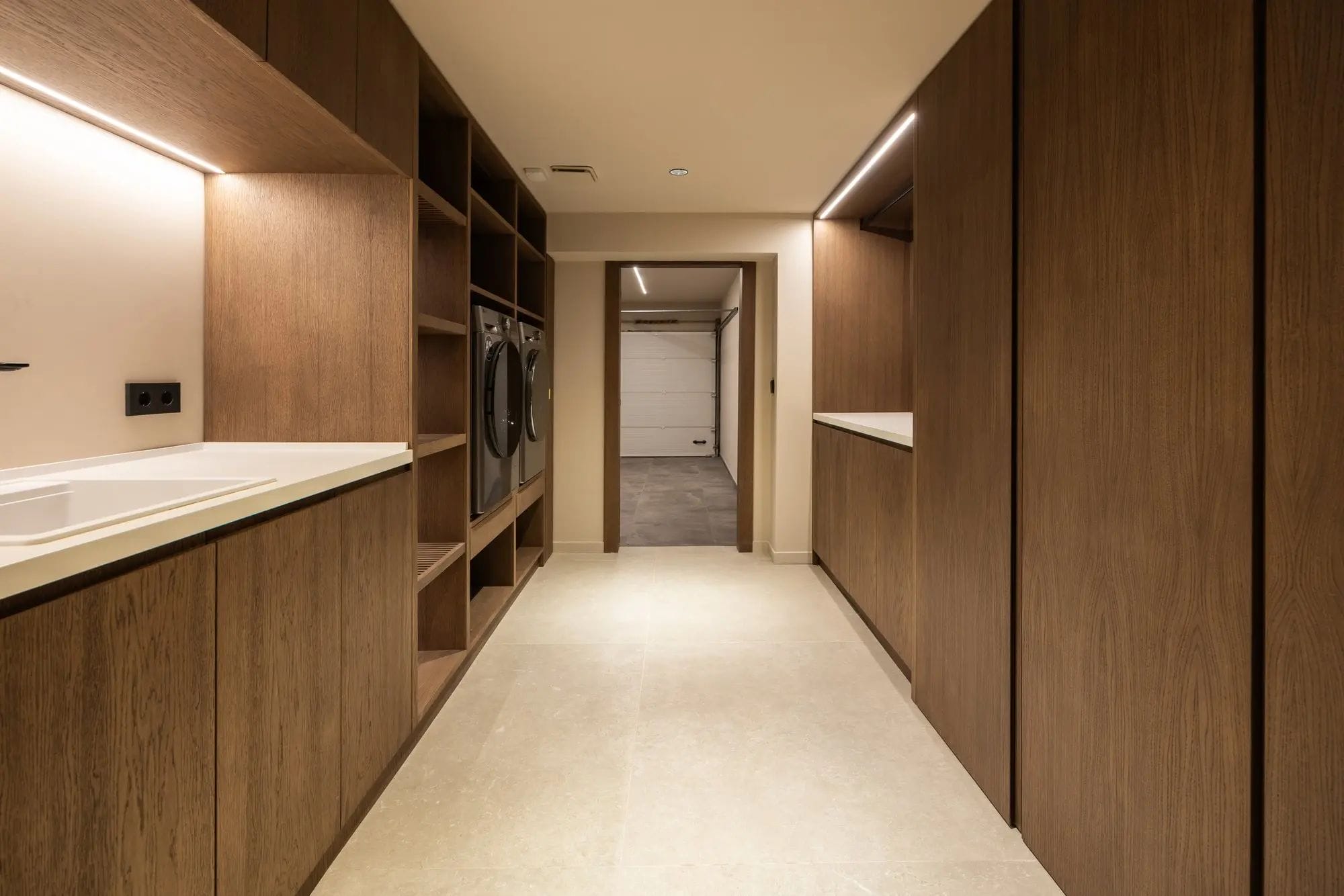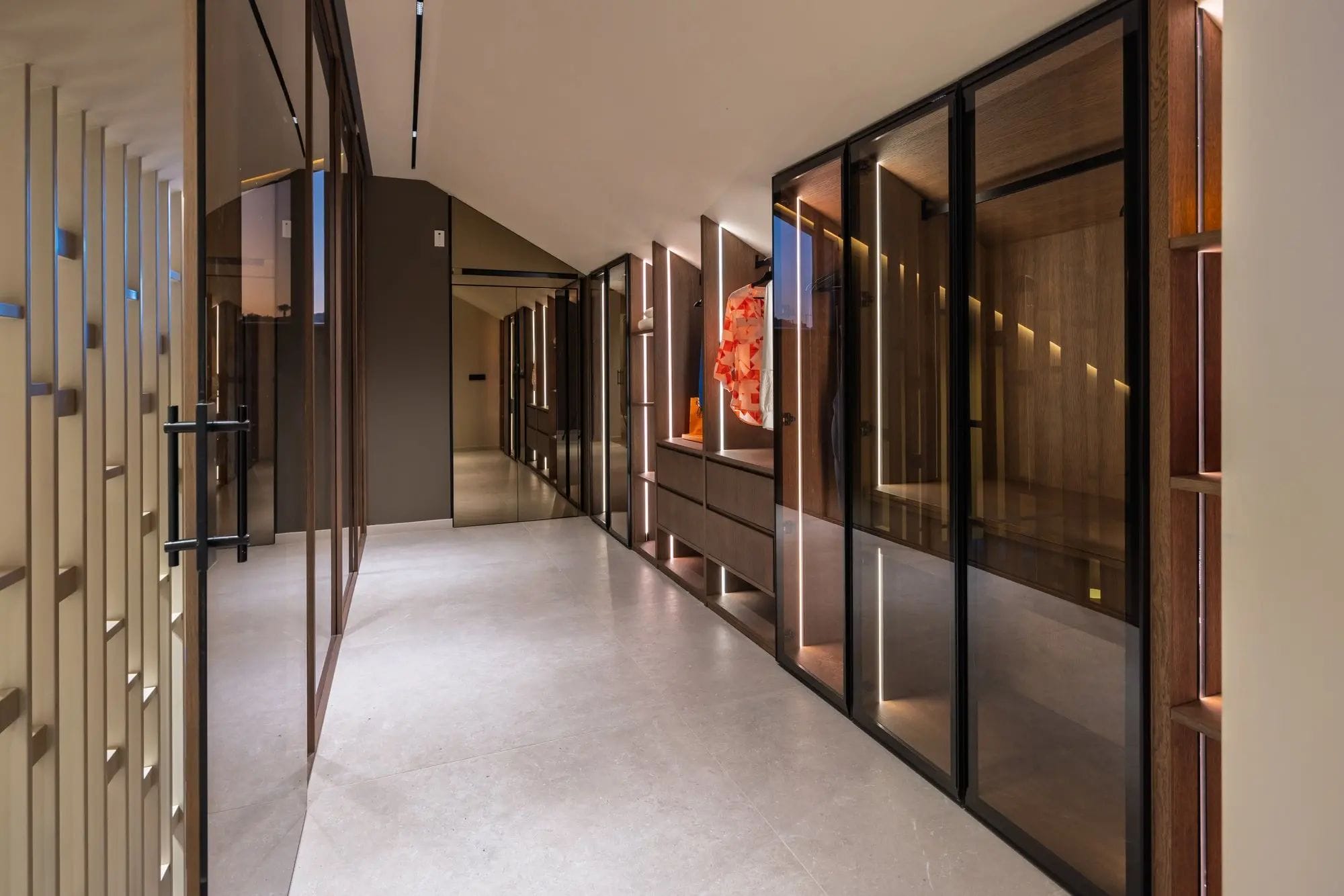 The sloping ceilings and large windows flood the spaces with natural light. The interior design combines clean lines and natural finishes in neutral tones with noble materials, creating an atmosphere of serene elegance. The architectural layout favours a perfect integration between the interior and exterior spaces. Upon entering the property, you will find spacious, bright, and welcoming living areas with high ceilings, which share the limelight with the fully equipped kitchen.