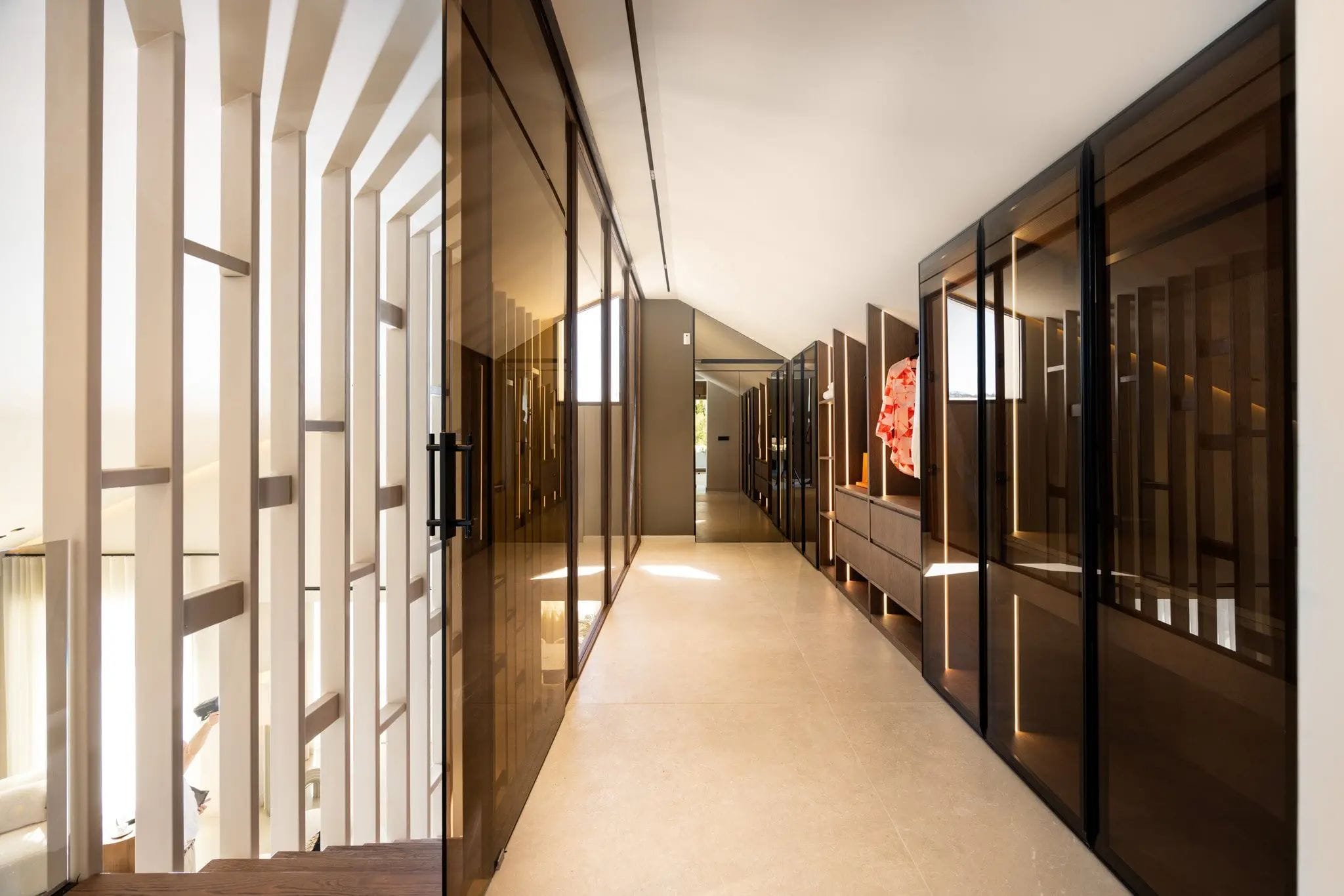 The villa features five carefully decorated bedrooms and six modern bathrooms, five of which are en suite. On the upper floor, the impressive master suite is a private retreat with a spacious wooden walk-in closet, glass doors, and windows that offer open views of the golf valley.