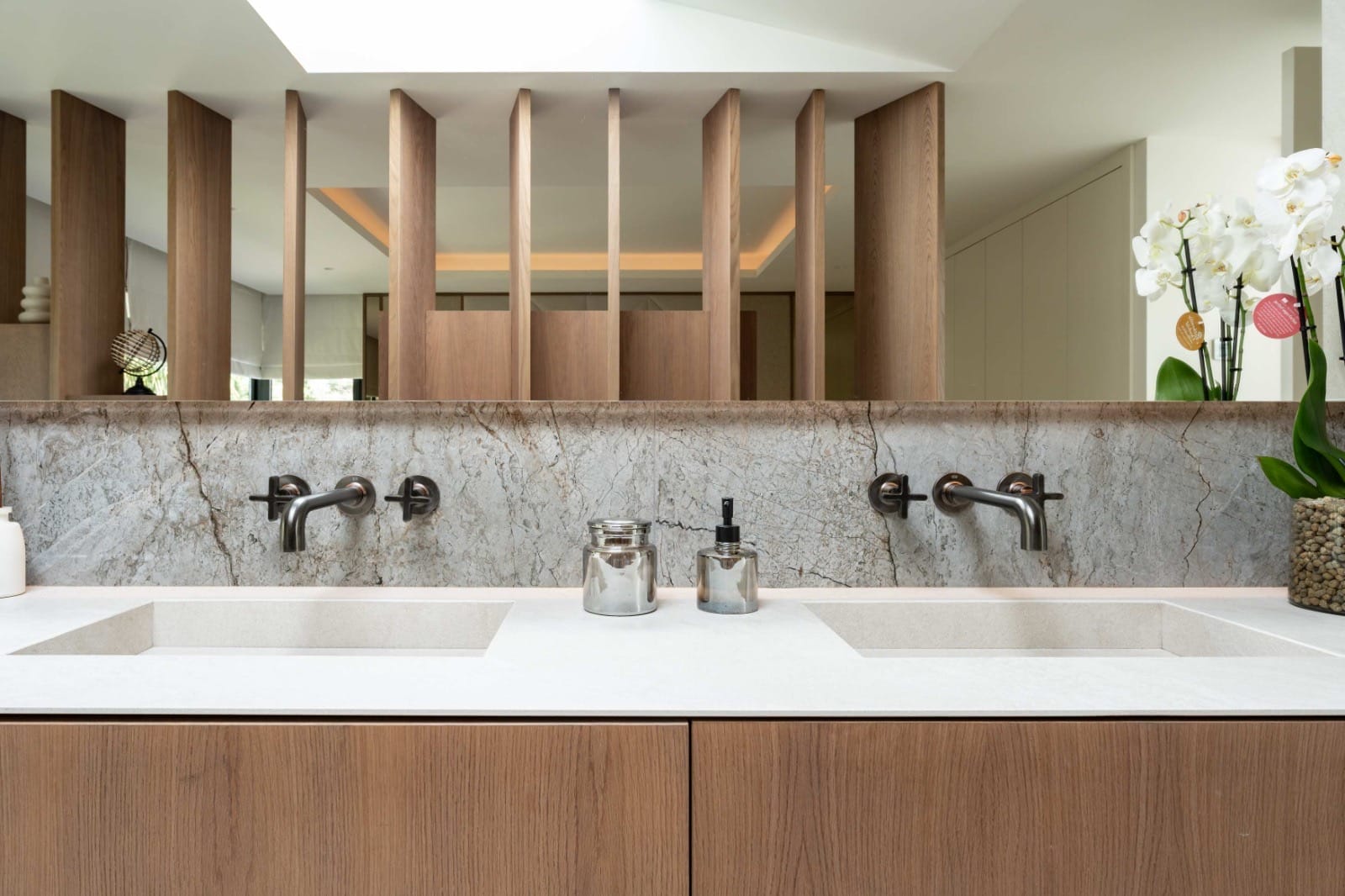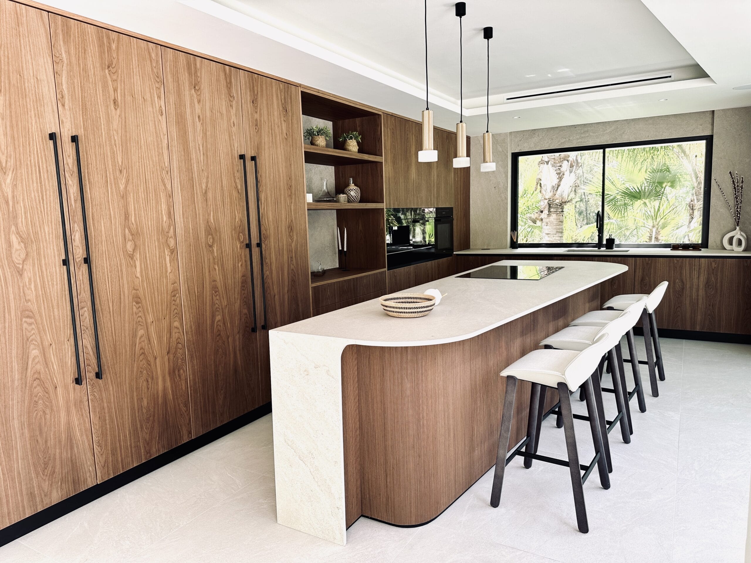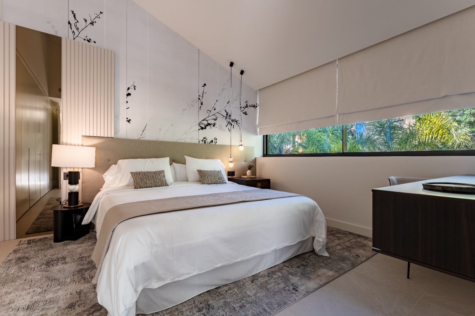 With a large landscaped plot of over 1,500 m² and more than 50 palm trees, the villa stands out for its 717 m² of elegant living space, creating a perfect retreat for lovers of luxury and privacy. The villa's exterior design is designed for maximum privacy and comfort. The generous plot is surrounded by lush vegetation and features a heated swimming pool that reaches up to 35° C in winter, creating an oasis of relaxation. In addition, the spacious terraces with elegant bioclimatic electric pergolas offer perfect spaces to enjoy the Mediterranean climate, while the large floor-to-ceiling windows allow for a seamless connection with the natural surroundings.
