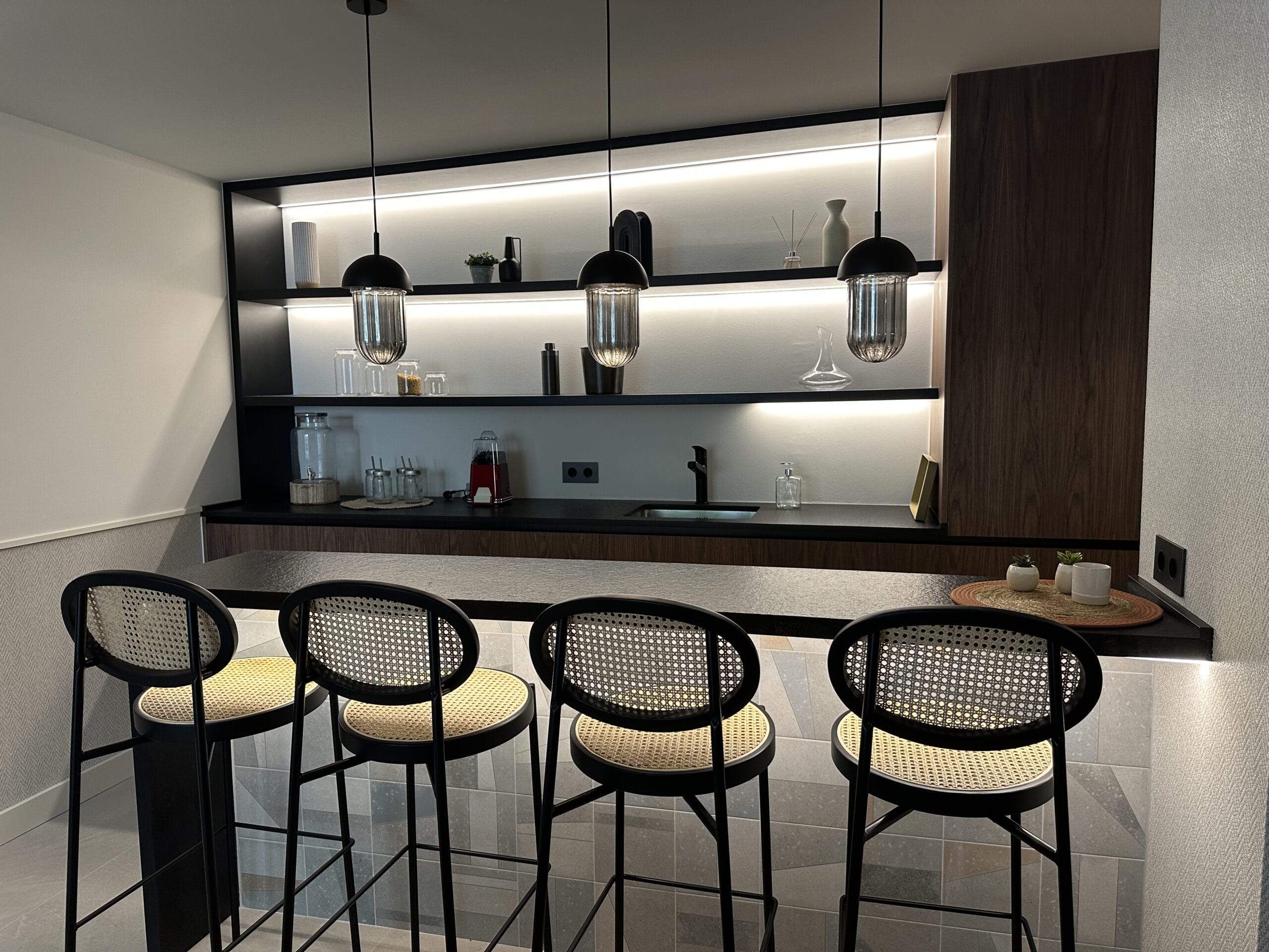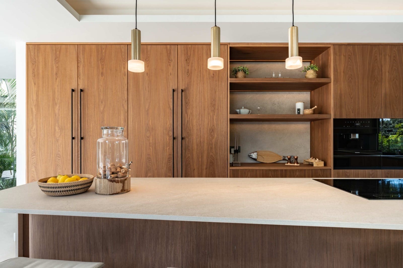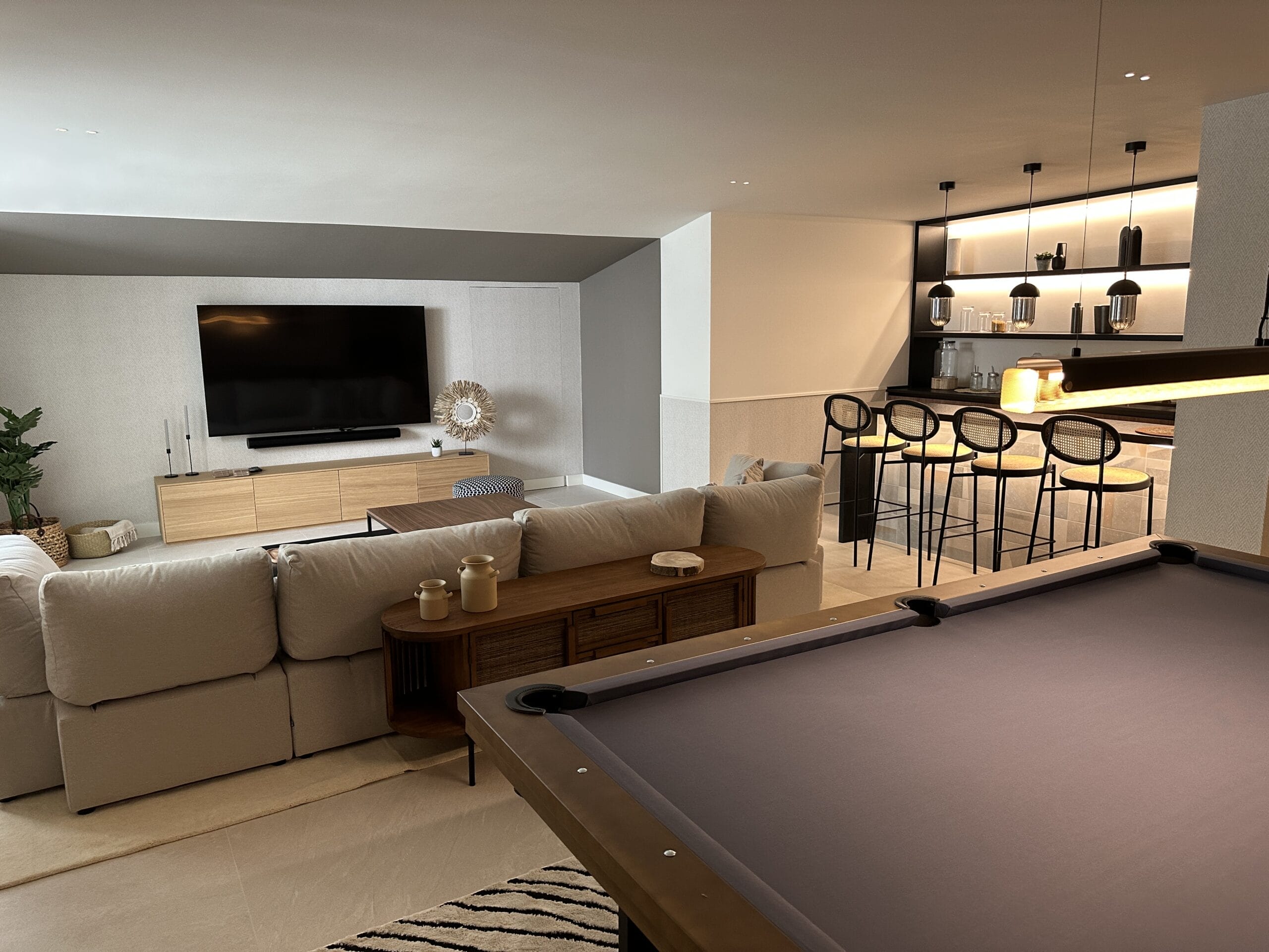 With a large landscaped plot of over 1,500 m² and more than 50 palm trees, the villa stands out for its 717 m² of elegant living space, creating a perfect retreat for lovers of luxury and privacy. The villa's exterior design is designed for maximum privacy and comfort. The generous plot is surrounded by lush vegetation and features a heated swimming pool that reaches up to 35° C in winter, creating an oasis of relaxation. In addition, the spacious terraces with elegant bioclimatic electric pergolas offer perfect spaces to enjoy the Mediterranean climate, while the large floor-to-ceiling windows allow for a seamless connection with the natural surroundings.