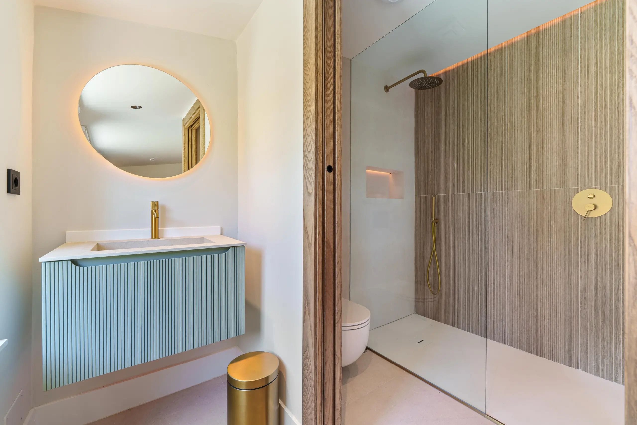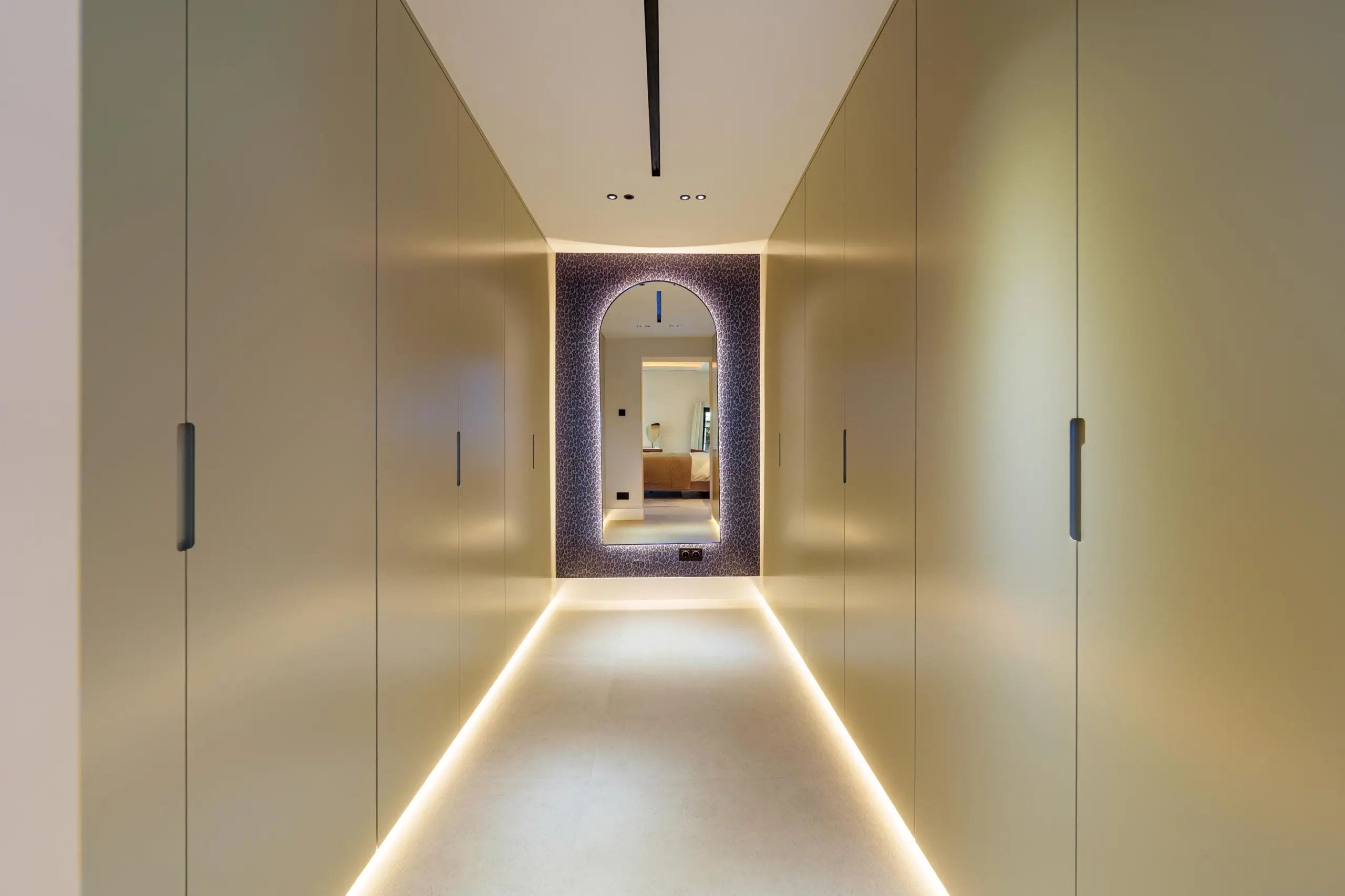 The interiors reflect a soft, minimalist aesthetic with warm natural tones and open-plan living. A fully equipped kitchen with central island flows effortlessly into a spacious dining area and cozy living room, complete with fireplace and bespoke cabinetry. The architectural design emphasizes fluidity and light, creating a serene ambiance throughout. The primary suite features direct access to the pool terrace and boasts a luxurious en-suite bathroom with a freestanding bathtub and walk-in shower. Each of the five bedrooms is generously sized, offering comfort, style, and privacy.