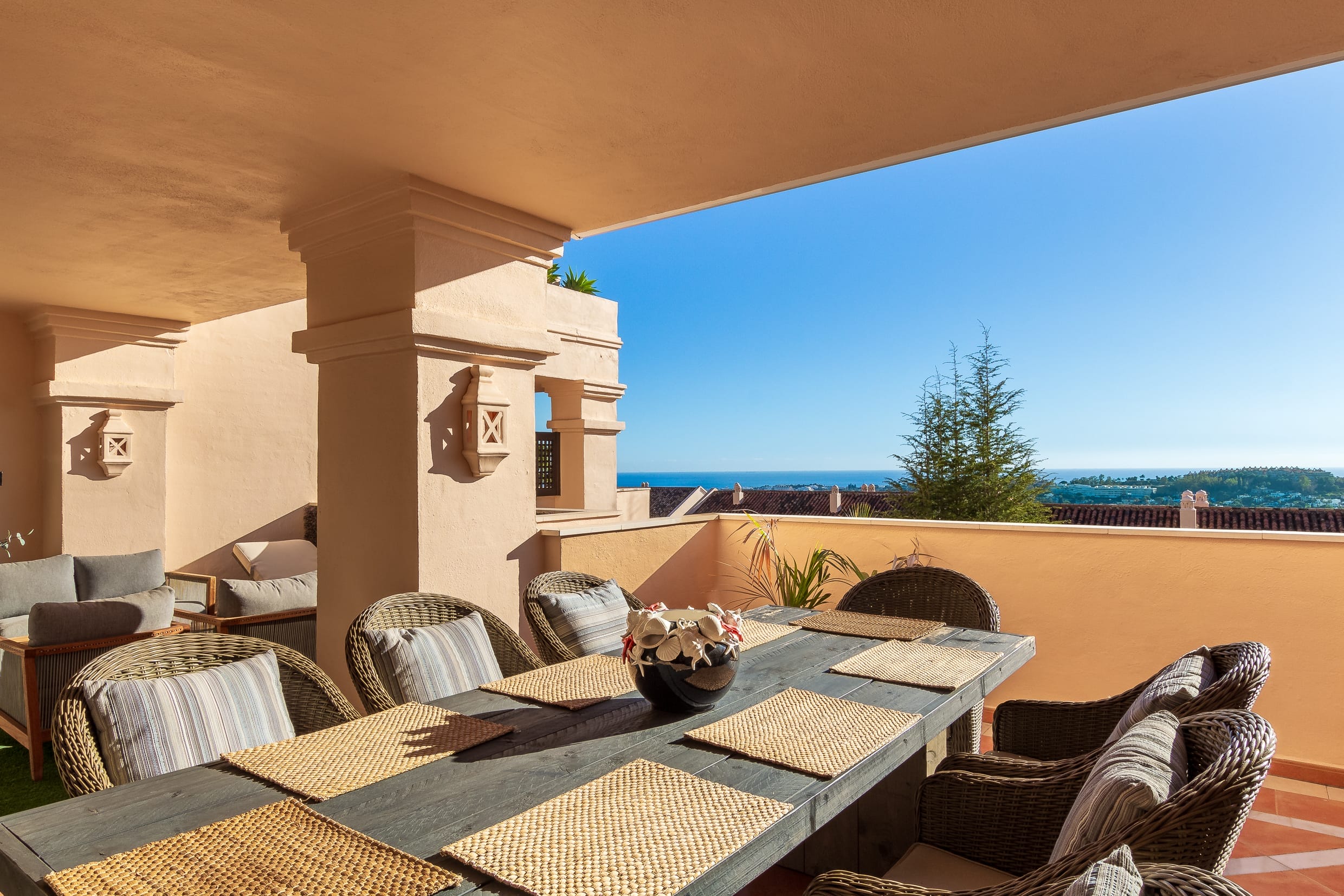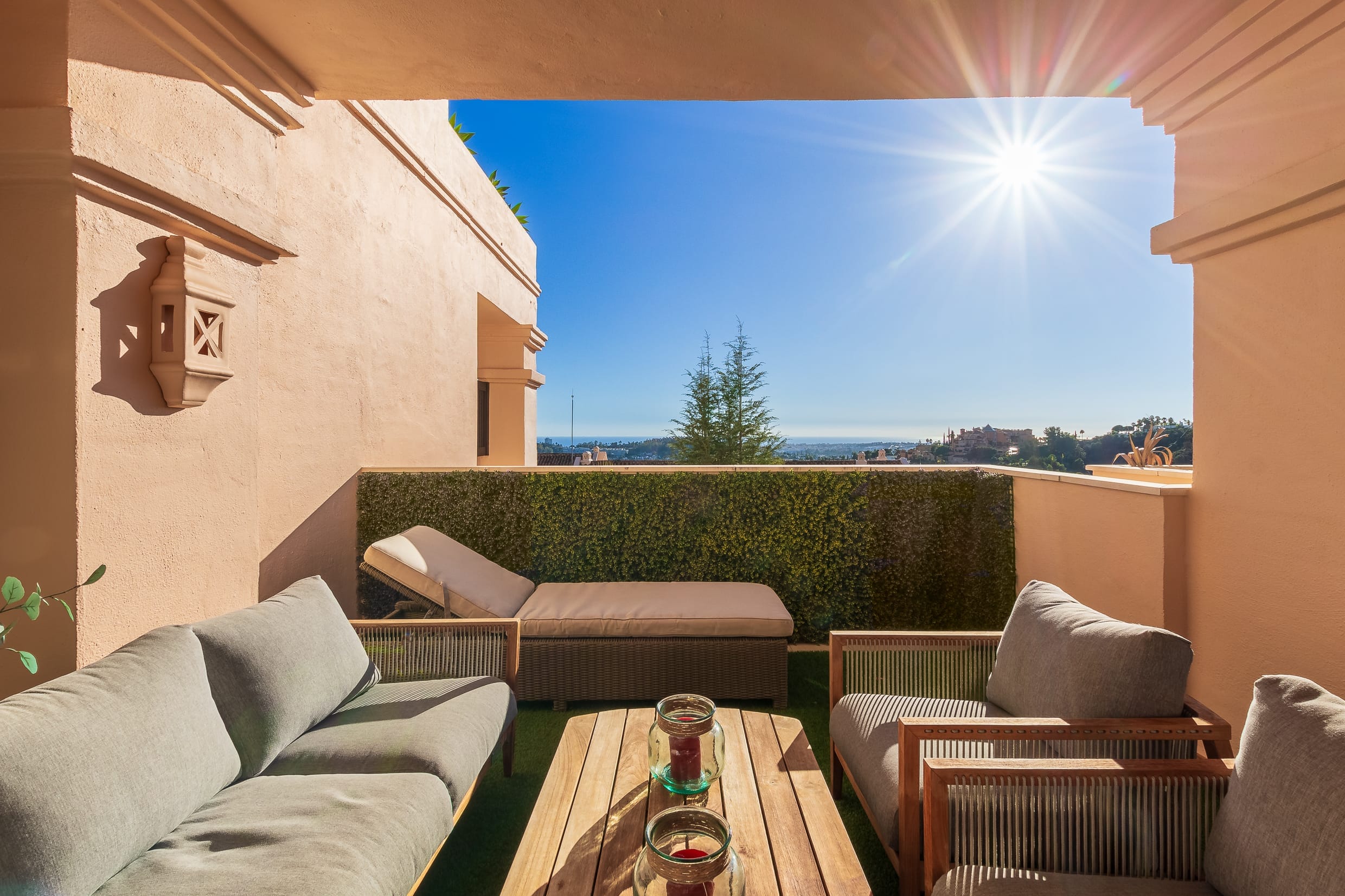 This elegant hillside apartment is a true retreat of luxury with panoramic views over the Golf Valley and the Mediterranean Sea. Nestled in a privileged location in Nueva Andalucía, the property is ideal for those seeking to enjoy the Costa del Sol lifestyle in an atmosphere of sophistication and comfort. Its combination of space, location, and breathtaking scenery, makes it an exceptional opportunity.