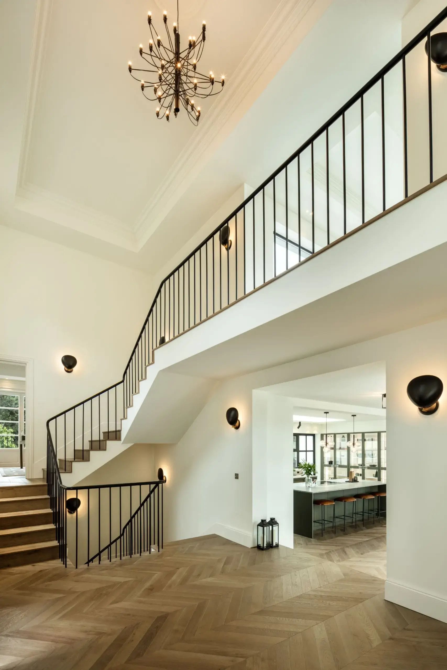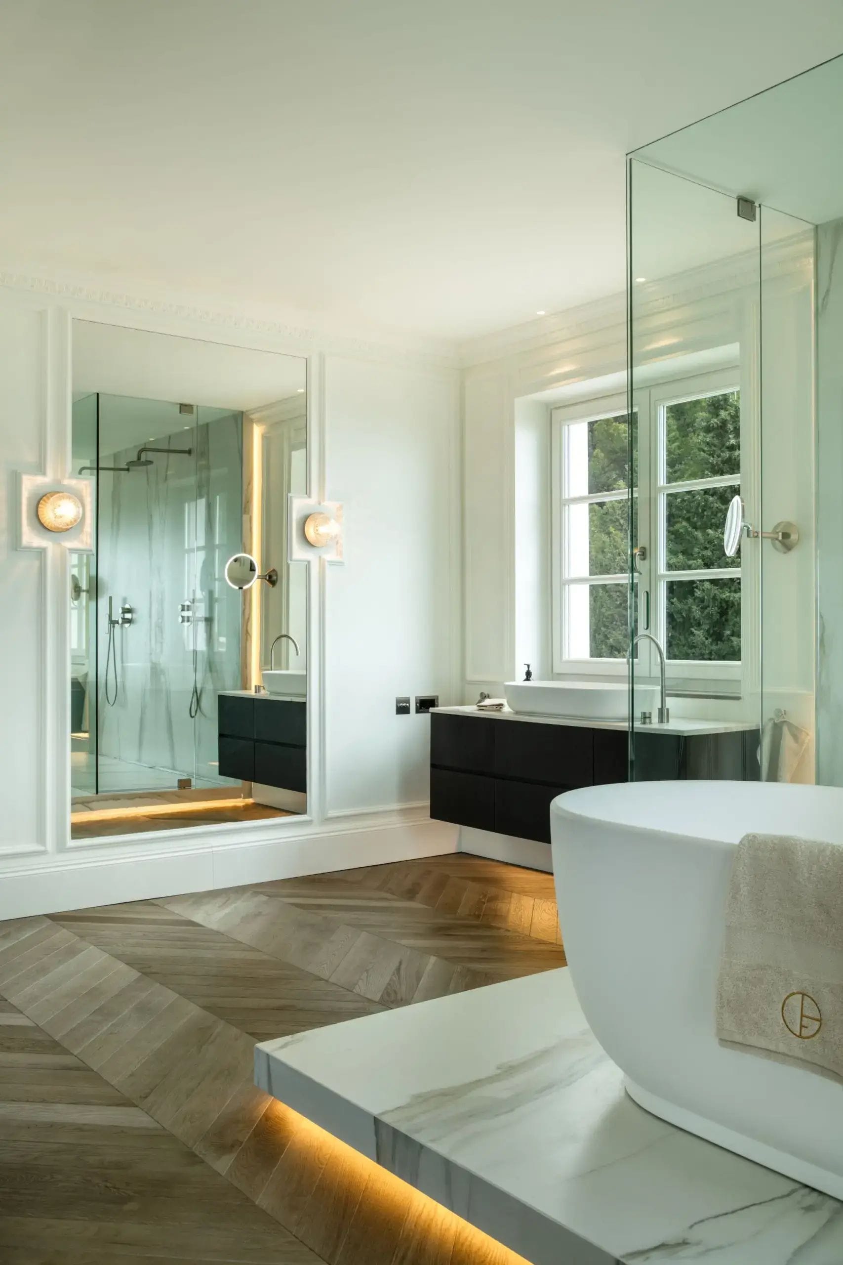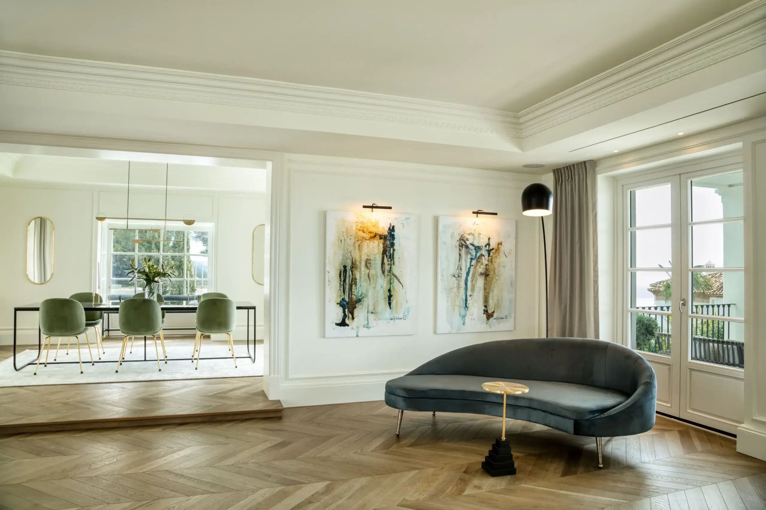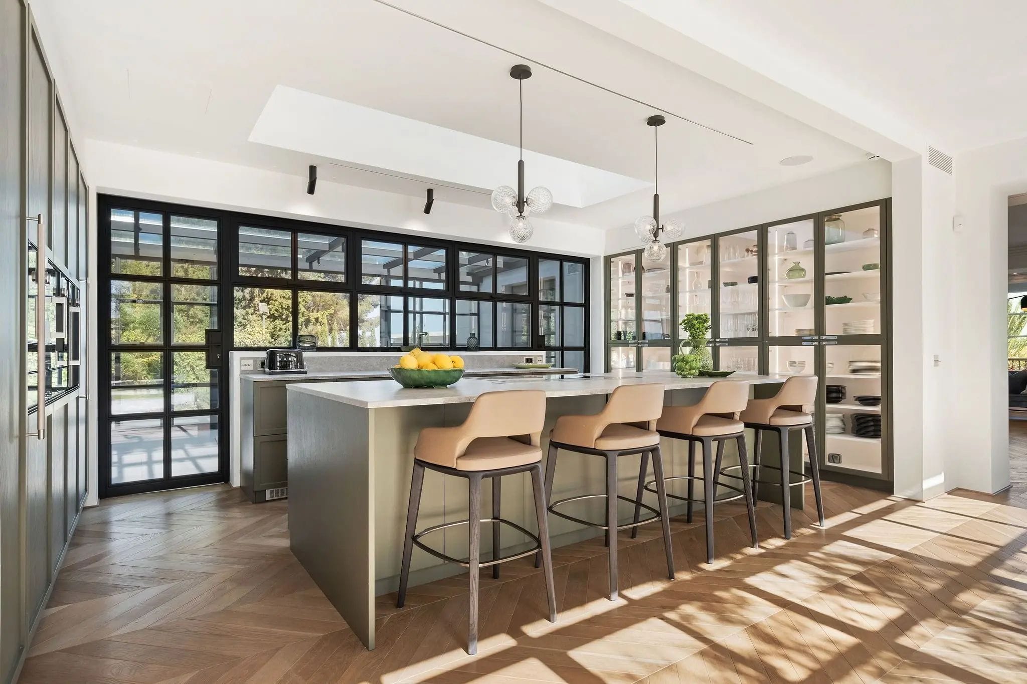 The villa offers a warm welcome through a majestic entrance, surrounded by meticulously manicured gardens that convey a real sense of peace and serenity. Each space has been designed to the highest standards of quality, incorporating natural elements and sophisticated furnishings. Italian herringbone oak floors complement the neutral color palette of this luxurious home.