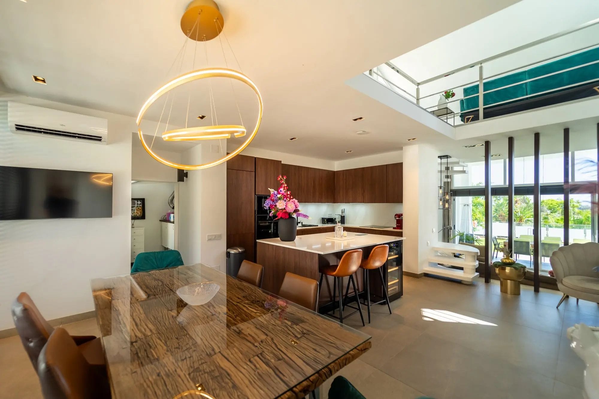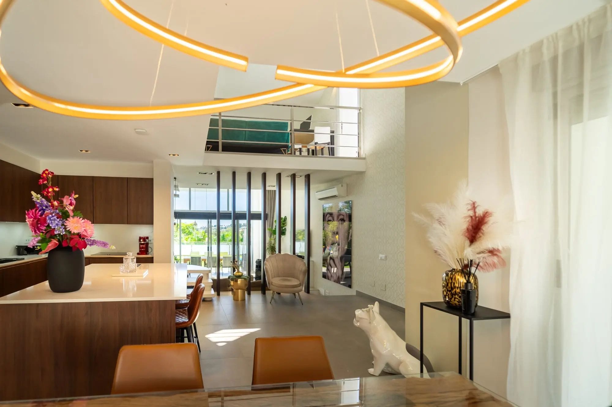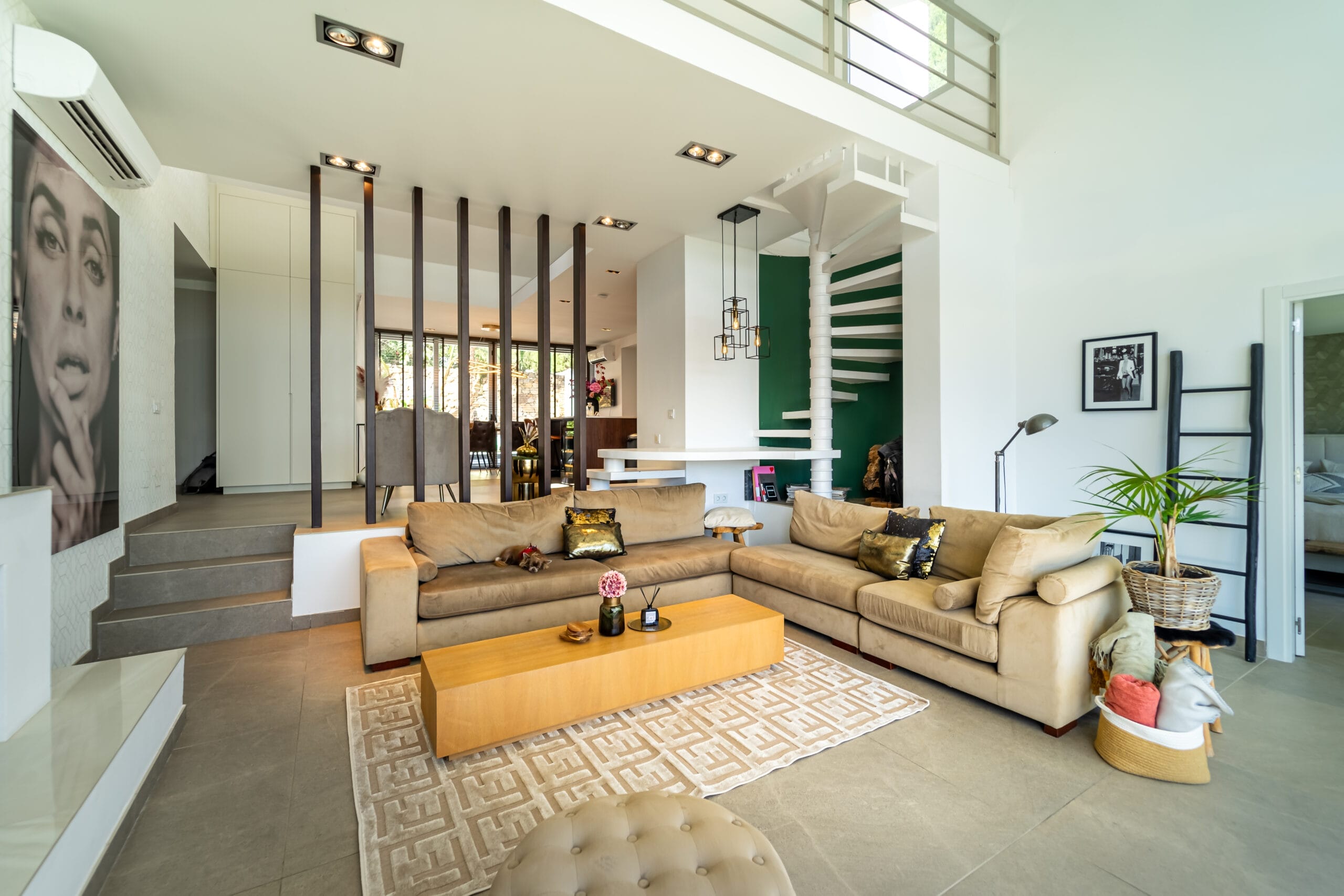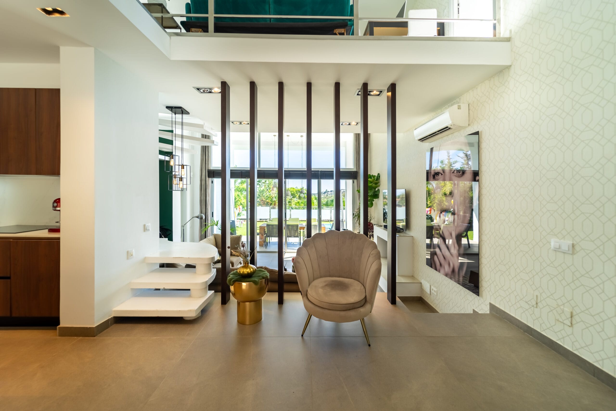 The interiors stand out for their double-height ceilings, contemporary design, and abundant natural light streaming through large glass doors. The kitchen is completely new and fully equipped with high-end appliances. The villa offers four spacious bedrooms, two of which feature en-suite bathrooms. In addition, the mezzanine has been arranged as an office, with an extra sofa—perfect for relaxing or enjoying a good book.