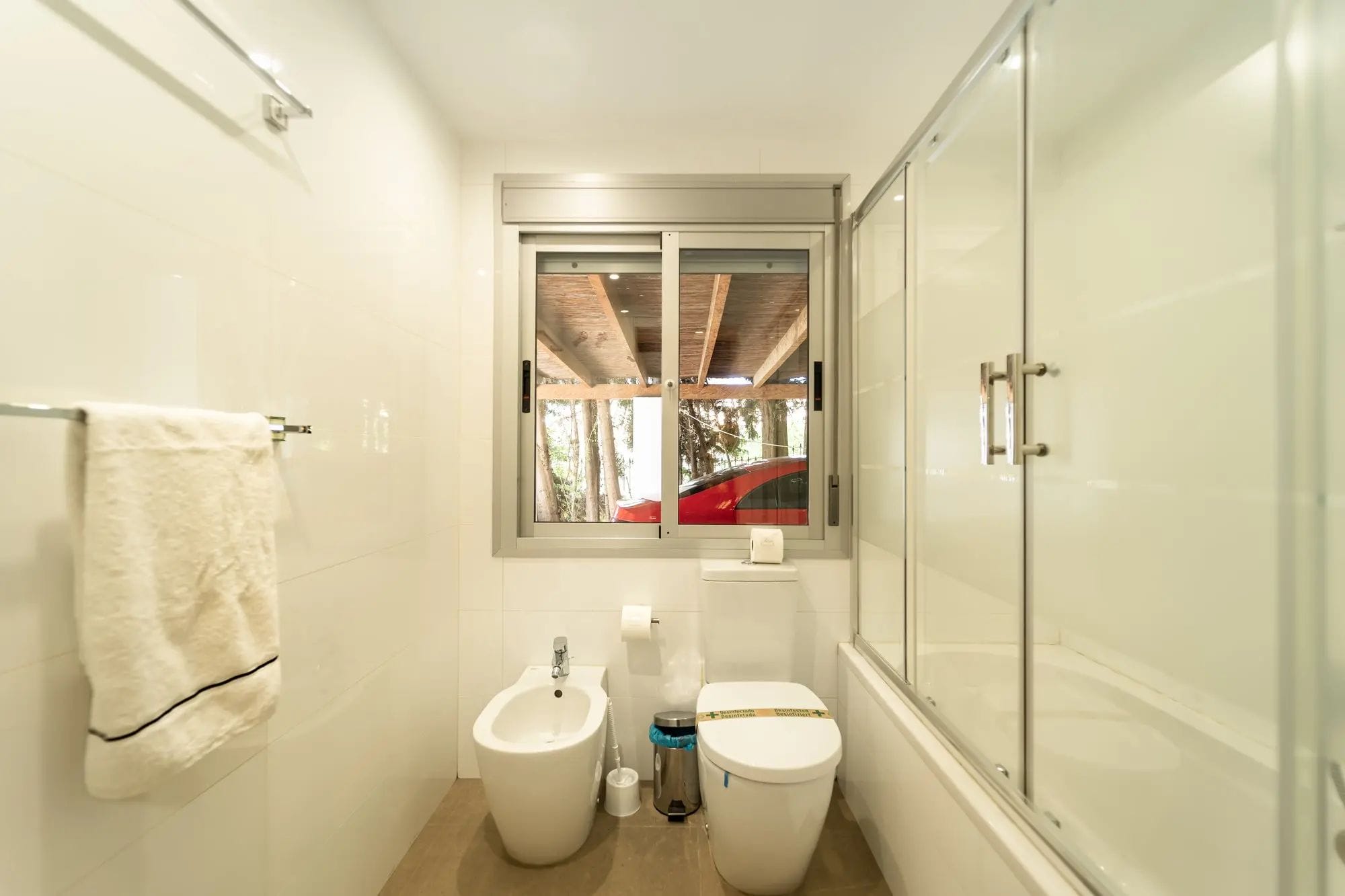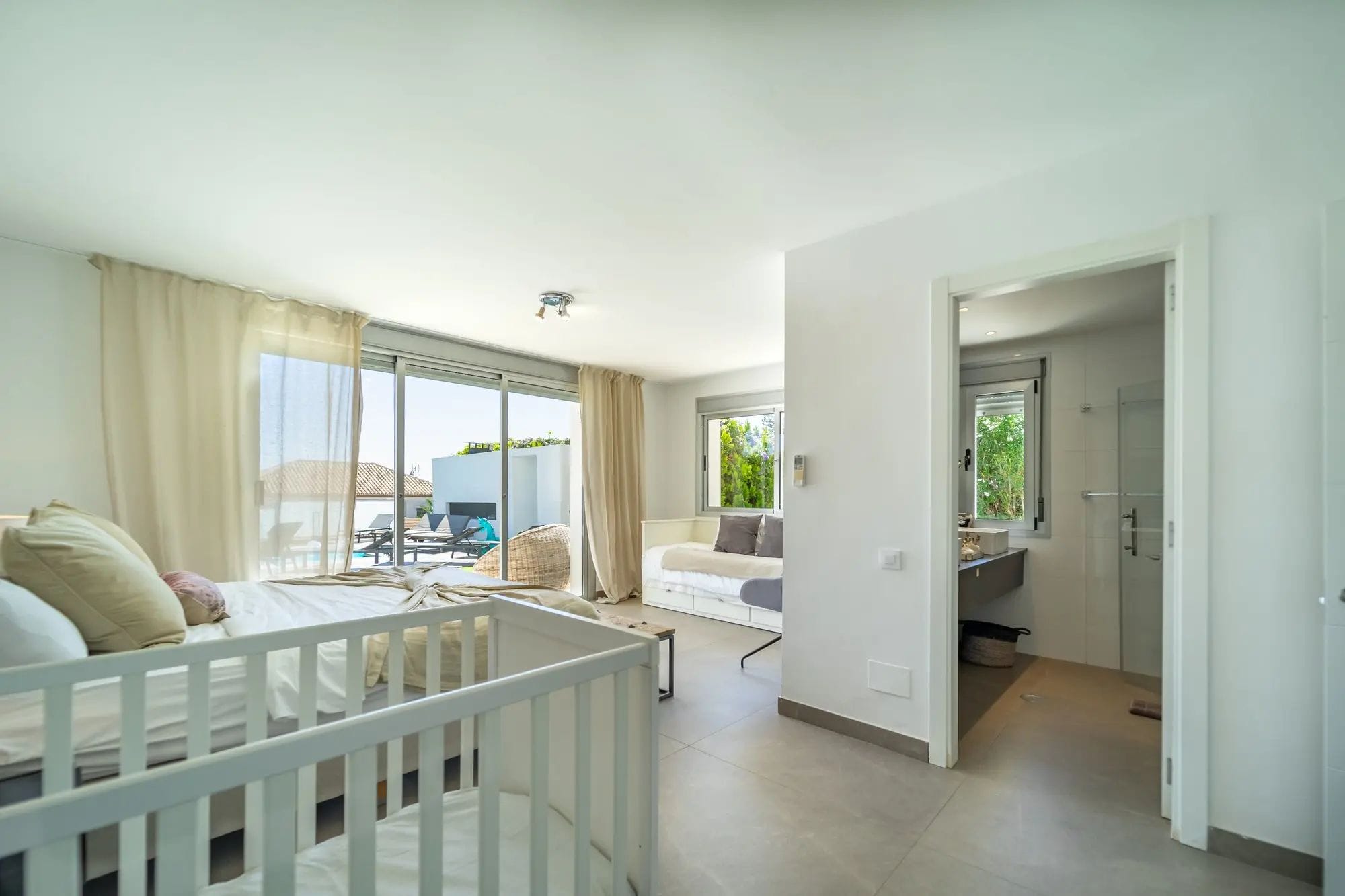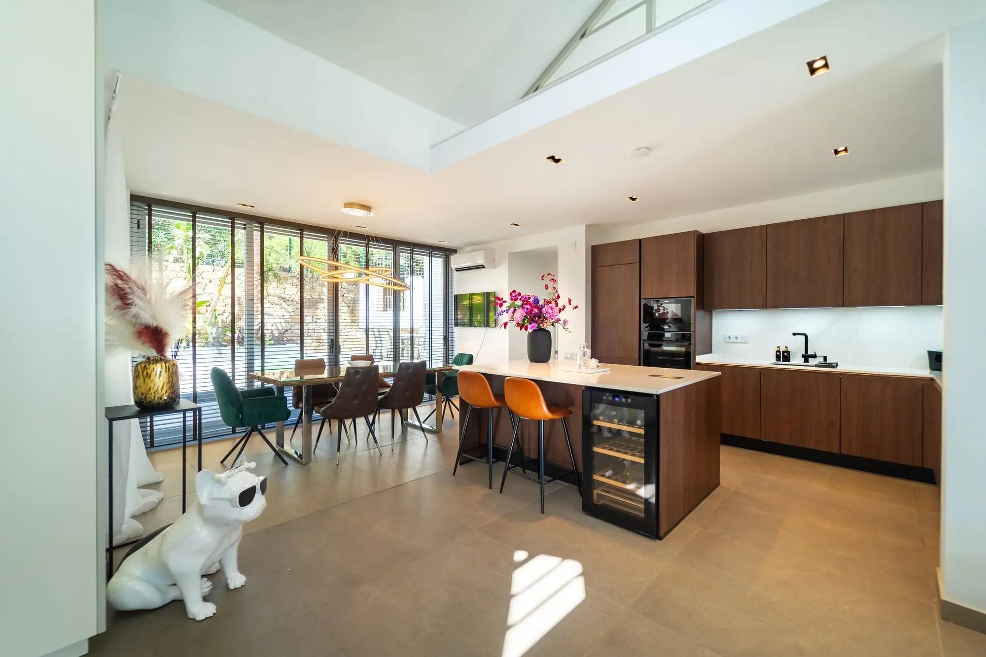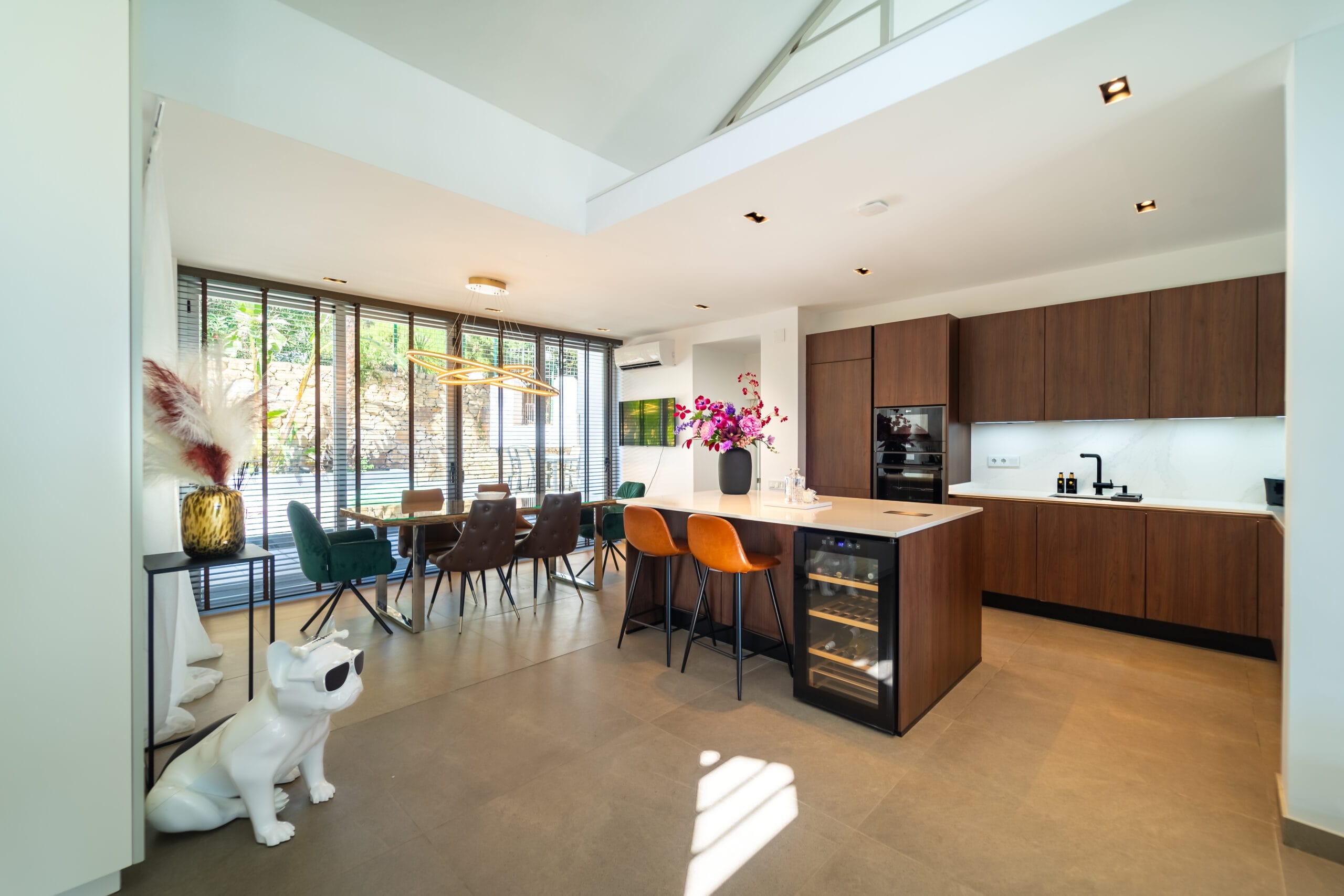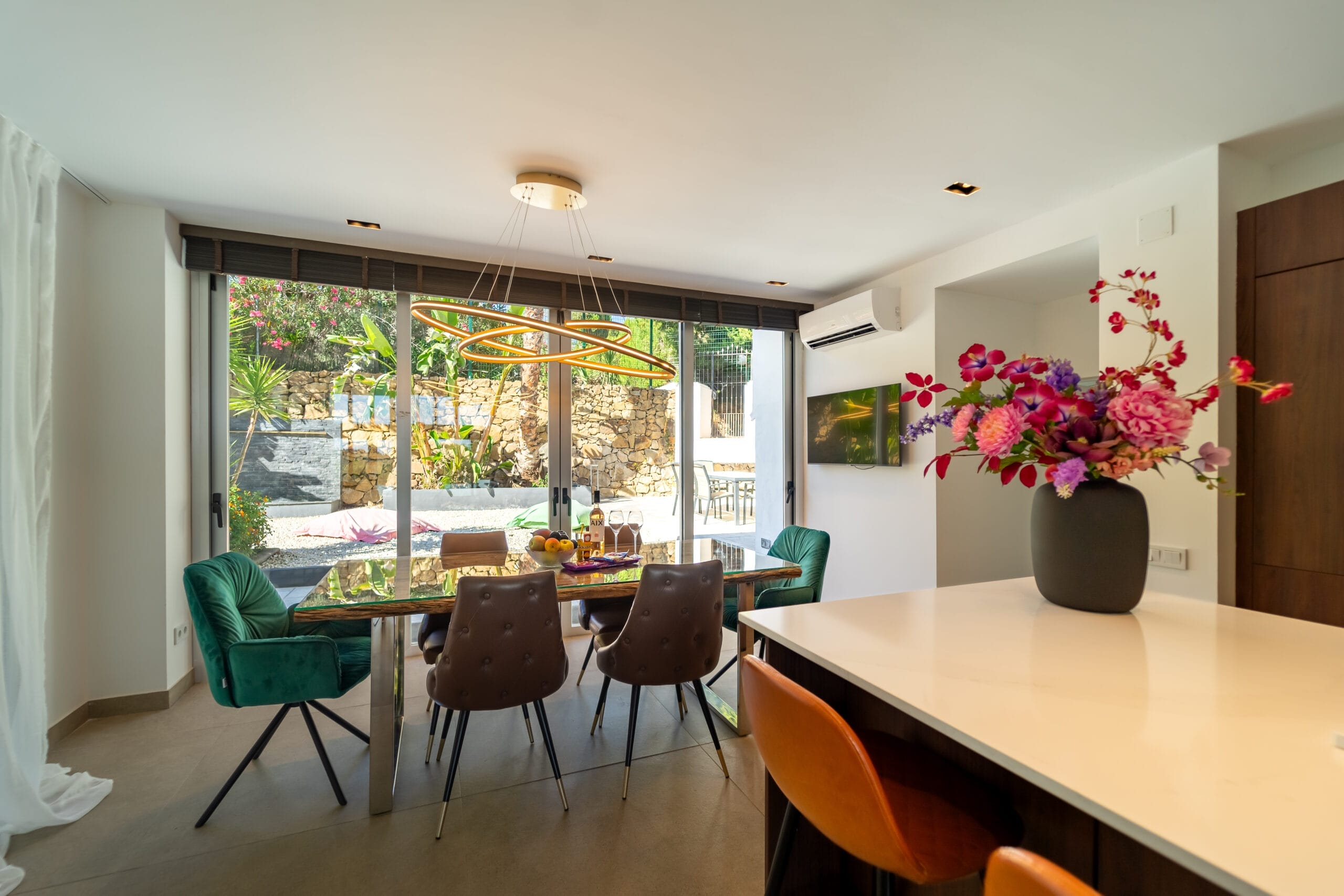 The interiors stand out for their double-height ceilings, contemporary design, and abundant natural light streaming through large glass doors. The kitchen is completely new and fully equipped with high-end appliances. The villa offers four spacious bedrooms, two of which feature en-suite bathrooms. In addition, the mezzanine has been arranged as an office, with an extra sofa—perfect for relaxing or enjoying a good book.