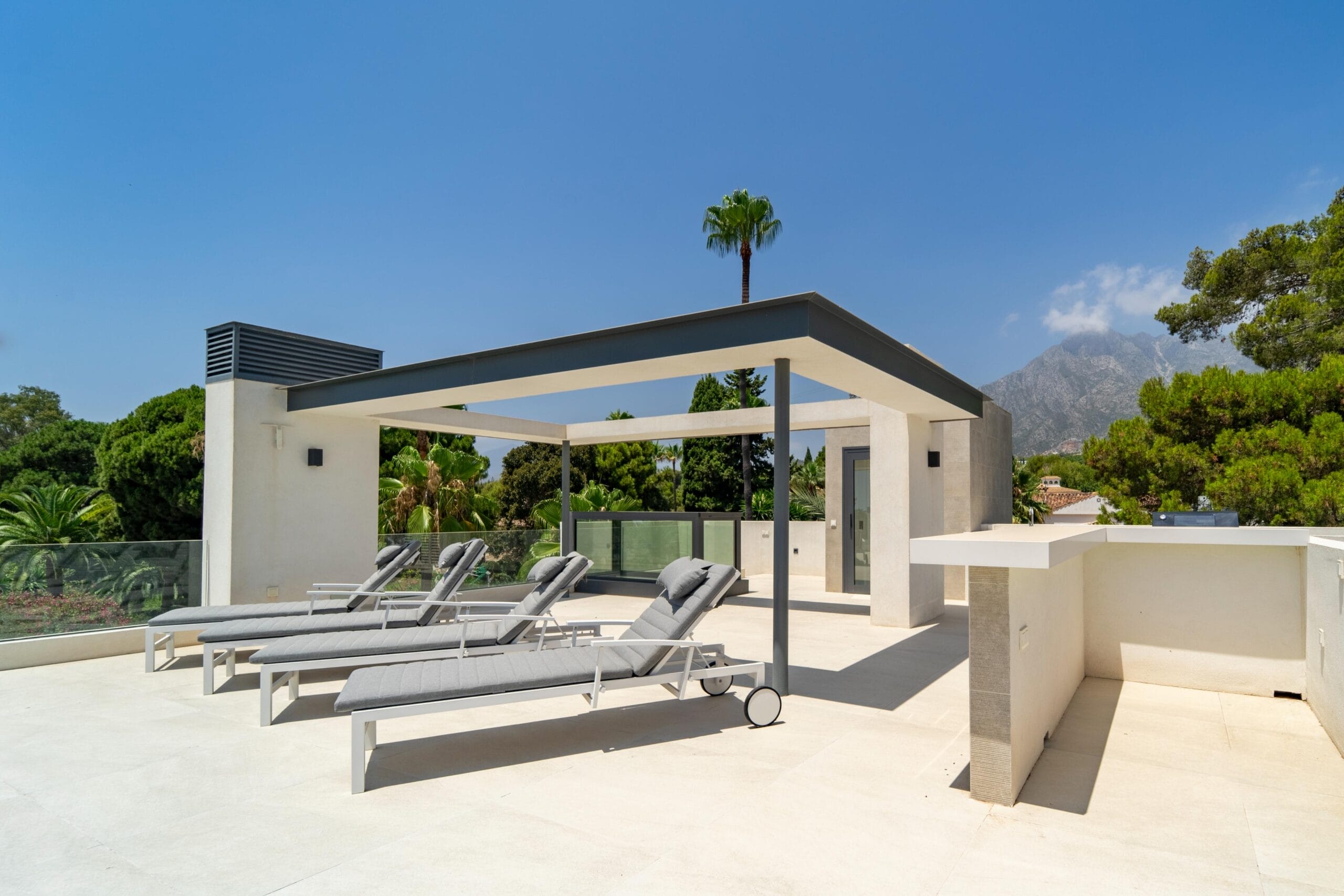 Multiple terraces and a spectacular rooftop solarium elevate this home's outdoor experience. The rooftop includes a bar, kitchenette, additional barbecue area, and breathtaking 360º panoramic views over the neighborhood, the iconic La Concha Mountain, and the Mediterranean Sea. It's the perfect setting for sunset drinks, stargazing, or summer entertaining.
