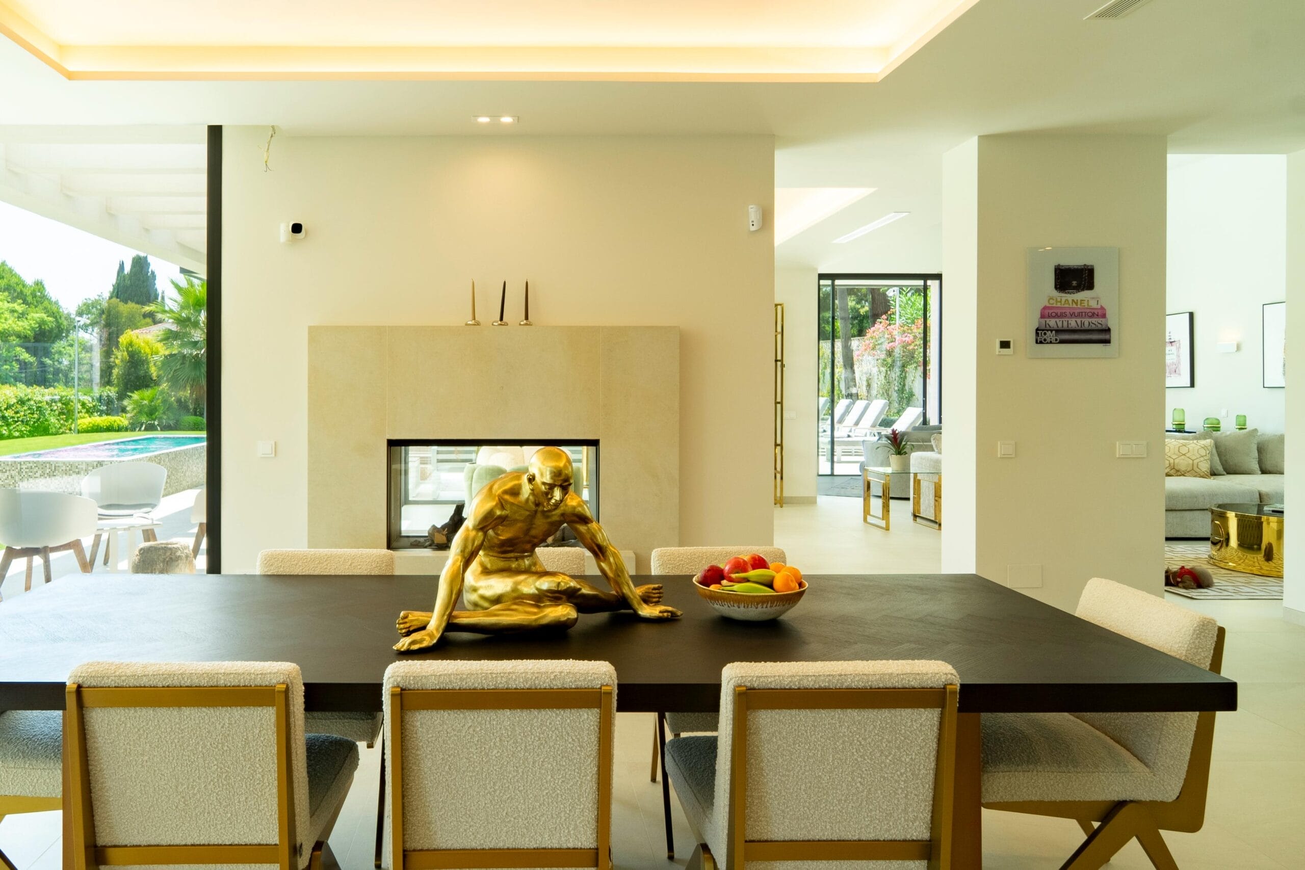 Once you enter, a bright, open-plan living space is flooded with natural light. The furniture is in a sleek, elegant style. A fully equipped state-of-the-art kitchen comes with a central island, breakfast bar, and a professional Italian espresso machine, ideal for morning rituals and entertaining alike. The open living and dining areas seamlessly flow to the pool terrace, designed for effortless indoor-outdoor living.