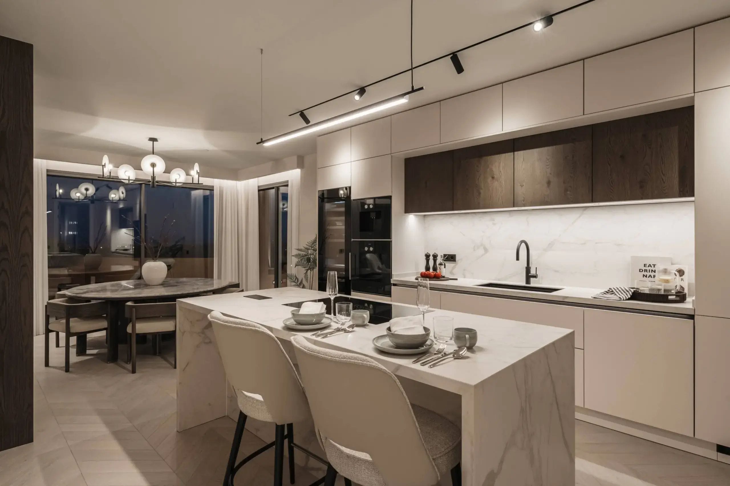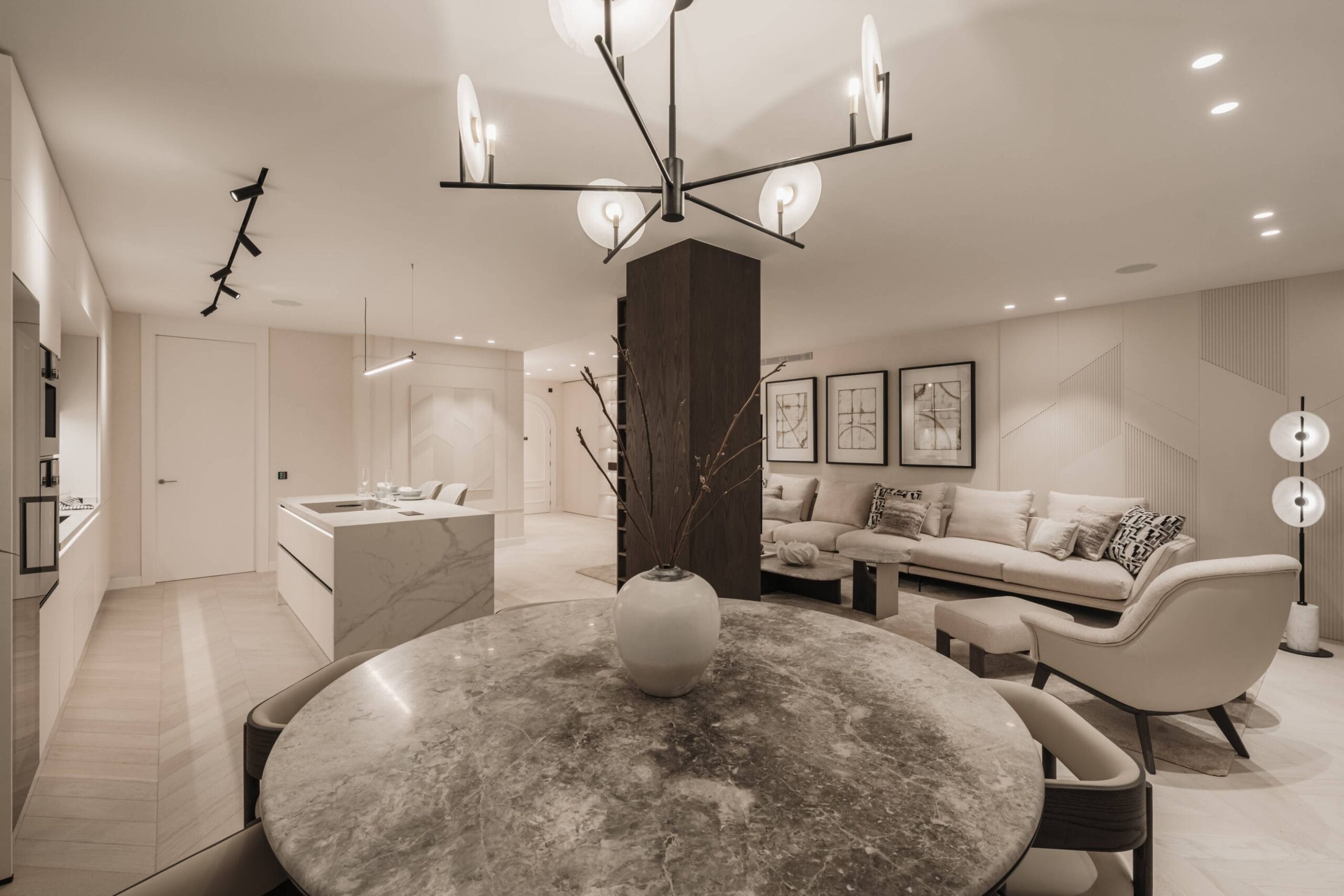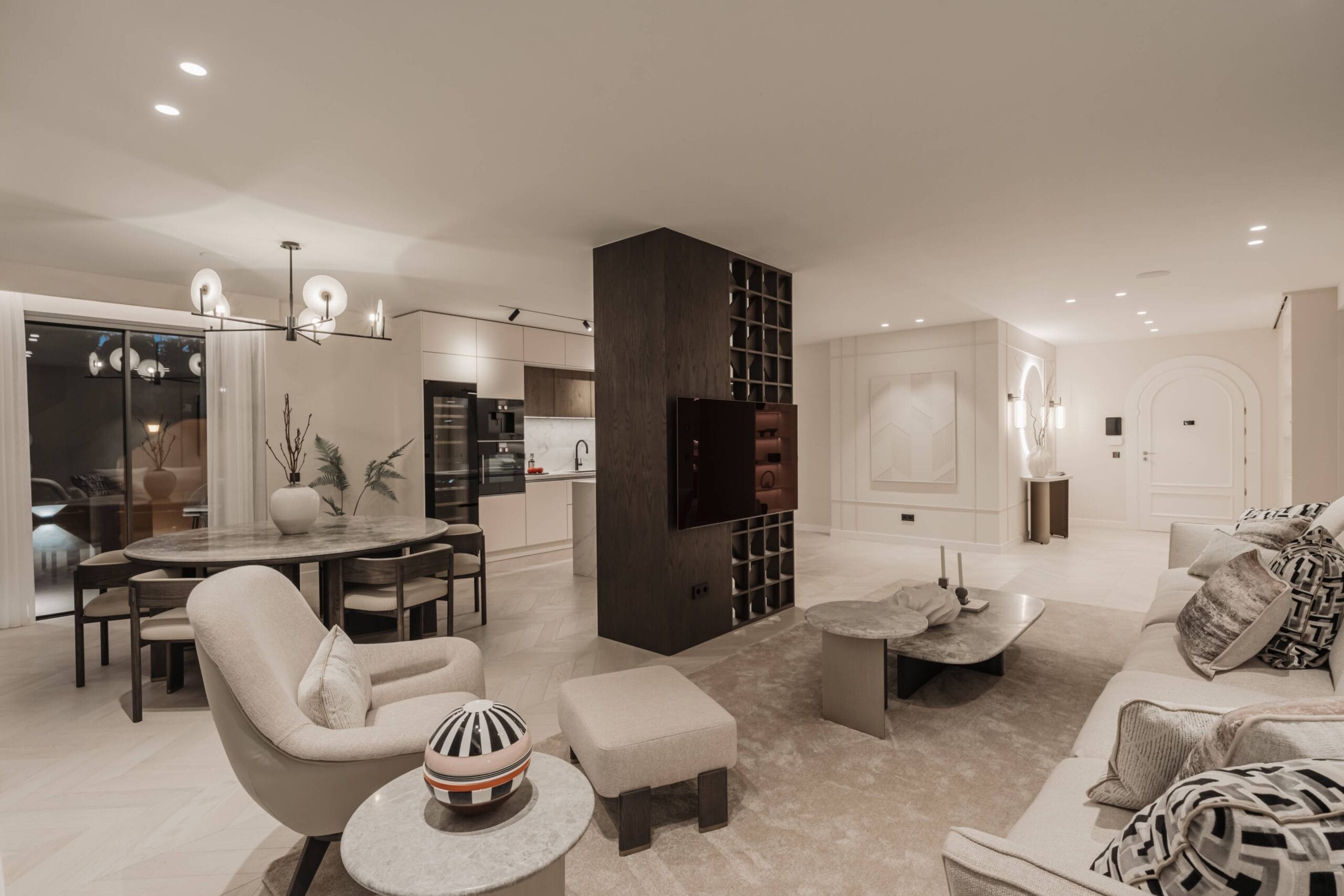 Laid out on a single floor, the apartment includes four spacious bedrooms, each with its en-suite bathroom, as well as a guest toilet. The open-plan living and dining area seamlessly flows into the designer kitchen, equipped with state-of-the-art Gaggenau appliances. The natural oak flooring and bespoke finishes, such as Gessi taps and furniture from the Alexandra Collection, give the space an exclusive and sophisticated character.