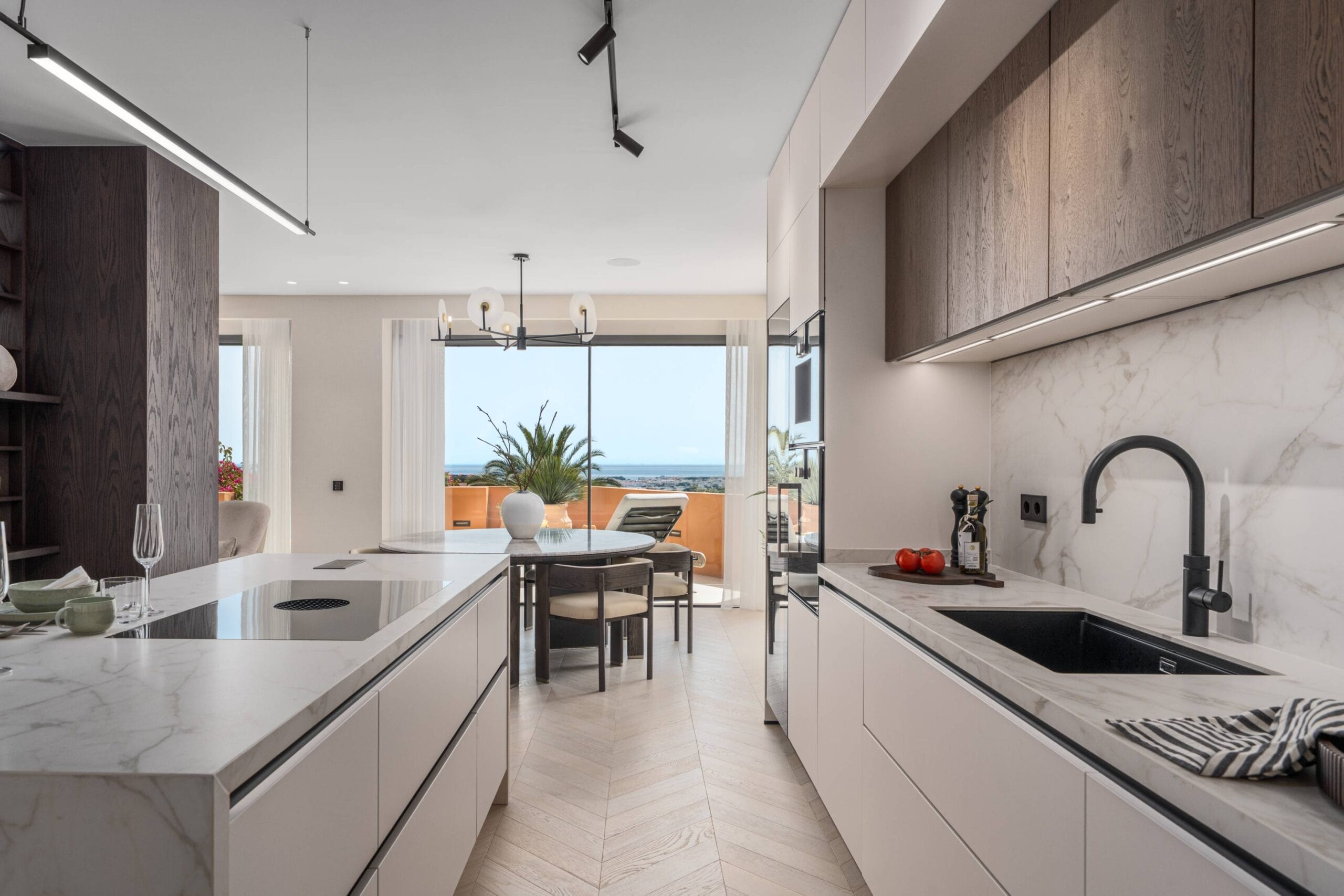 Elegant elevated ground floor apartment, an architectural gem located in the exclusive Les Belvederes development in La Cerquilla, at the heart of Marbella's Golf Valley. Recently renovated in 2024 with top-quality materials, this property offers panoramic views of the Mediterranean Sea, luxurious finishes, and an interior design that blends modern sophistication with timeless elegance.