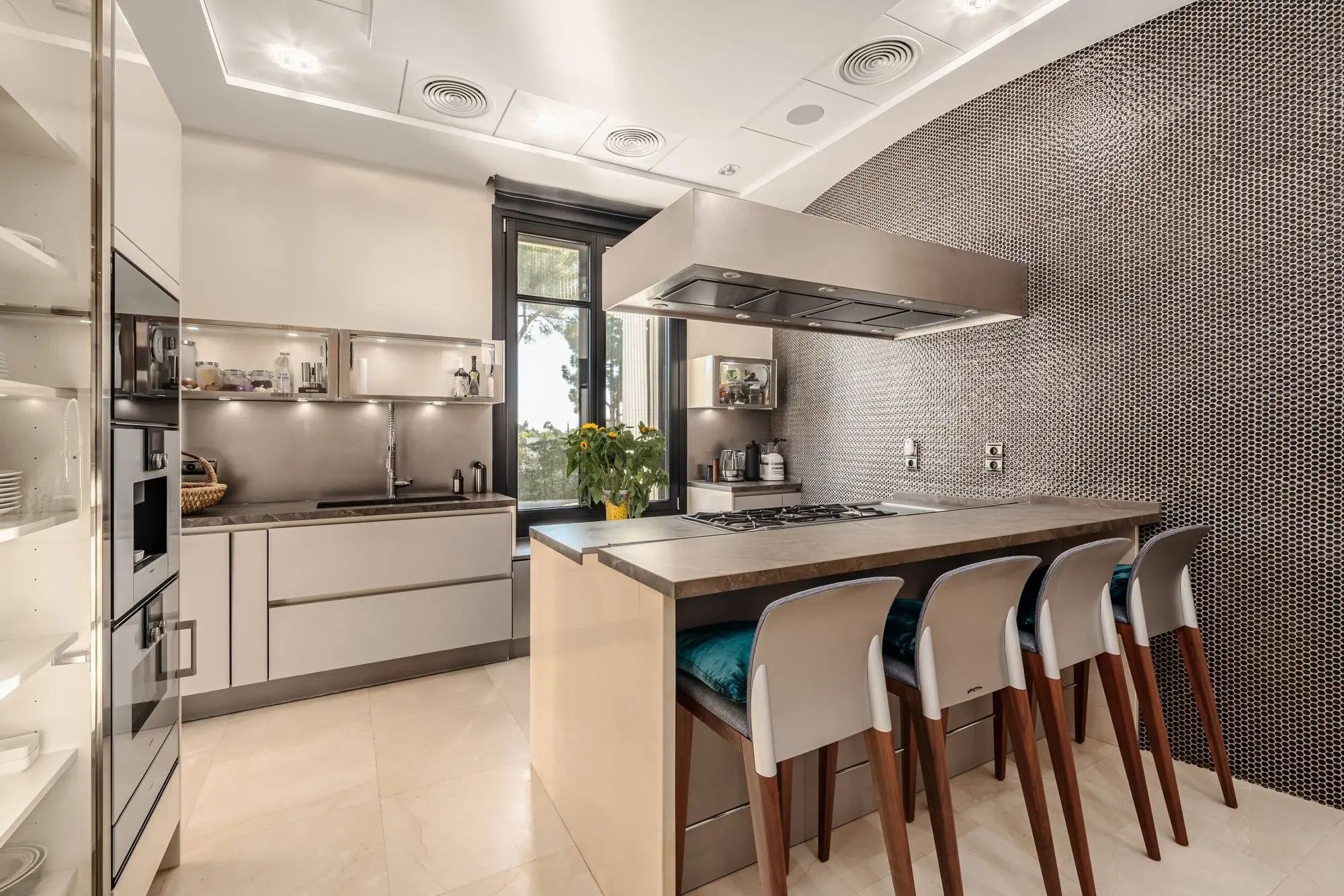 It is built to the highest standards and exhibits luxurious classical-Mediterranean architecture. A symbol of opulence and nobility, the impressive 3-level residence includes on the ground floor: a large and elegant living room with fireplace, an impressive dining room, a modern fully equipped kitchen, an office and a guest toilet. Upstairs, there are five remarkable en-suite bedrooms with direct access to large terraces. It has numerous comfort additions in terms of leisure and health areas.