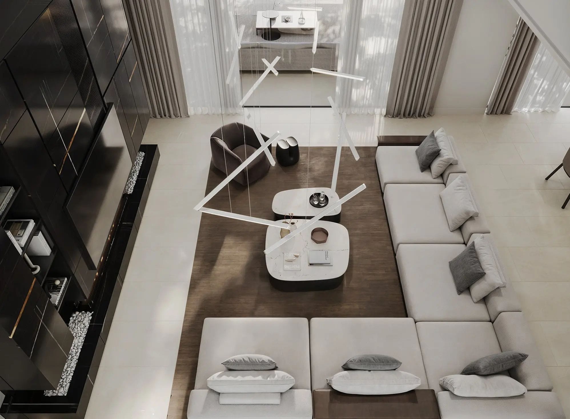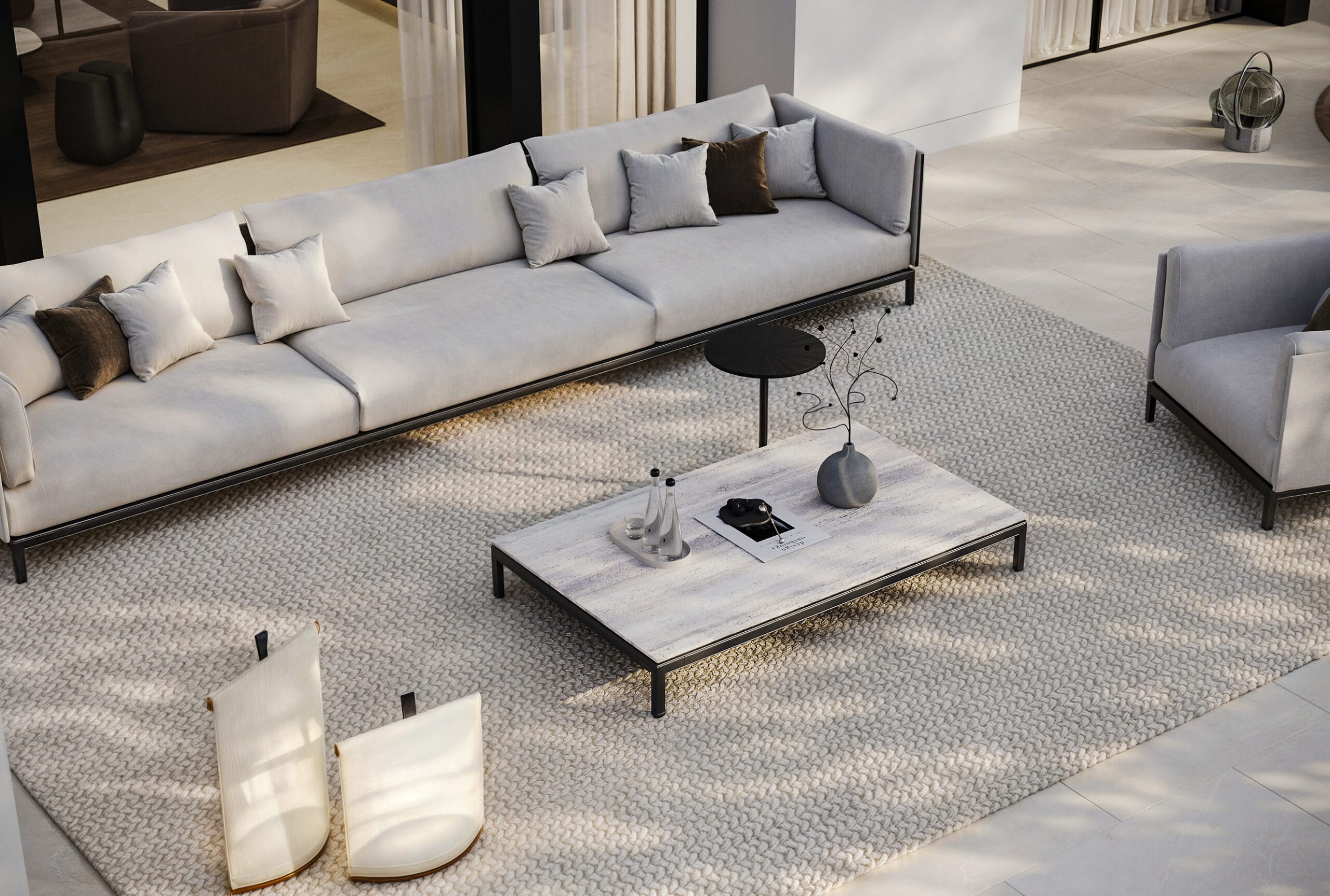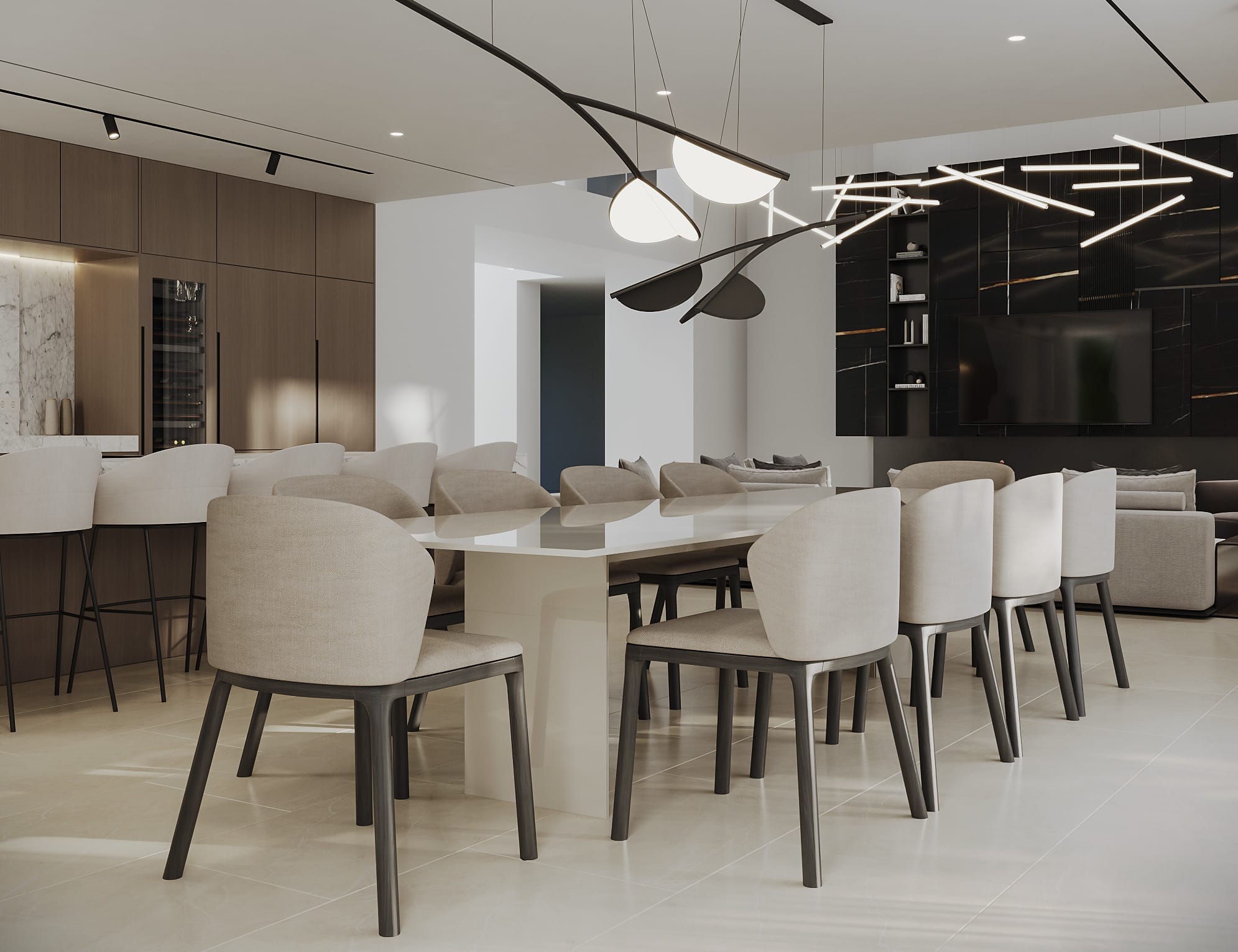 The interior of the villa has been designed to maximize light and spaciousness, with high ceilings and open spaces that allow natural light to flood every room. Luxury finishes, together with a layout that prioritizes comfort and functionality, make every corner a perfect place to relax and enjoy. The open-plan living room connects seamlessly with the modern kitchen, equipped with high-end appliances.