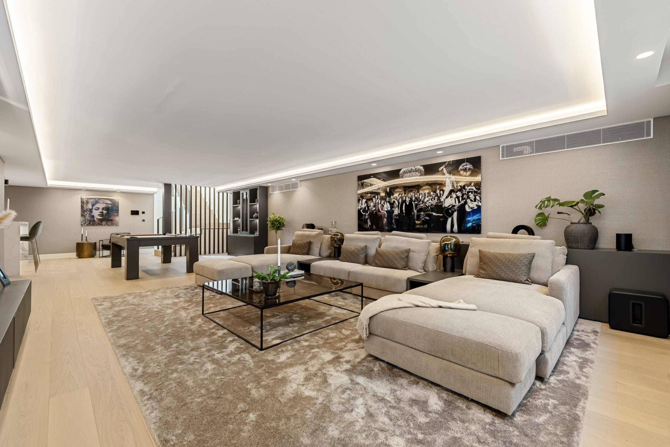 On the lower level, the villa impresses with a fully equipped entertainment area featuring a lounge with bar, glass-fronted wine cellar, billiards table, two guest WCs, and generous storage space. This floor transforms the property into the perfect setting for both family living and stylish entertaining.