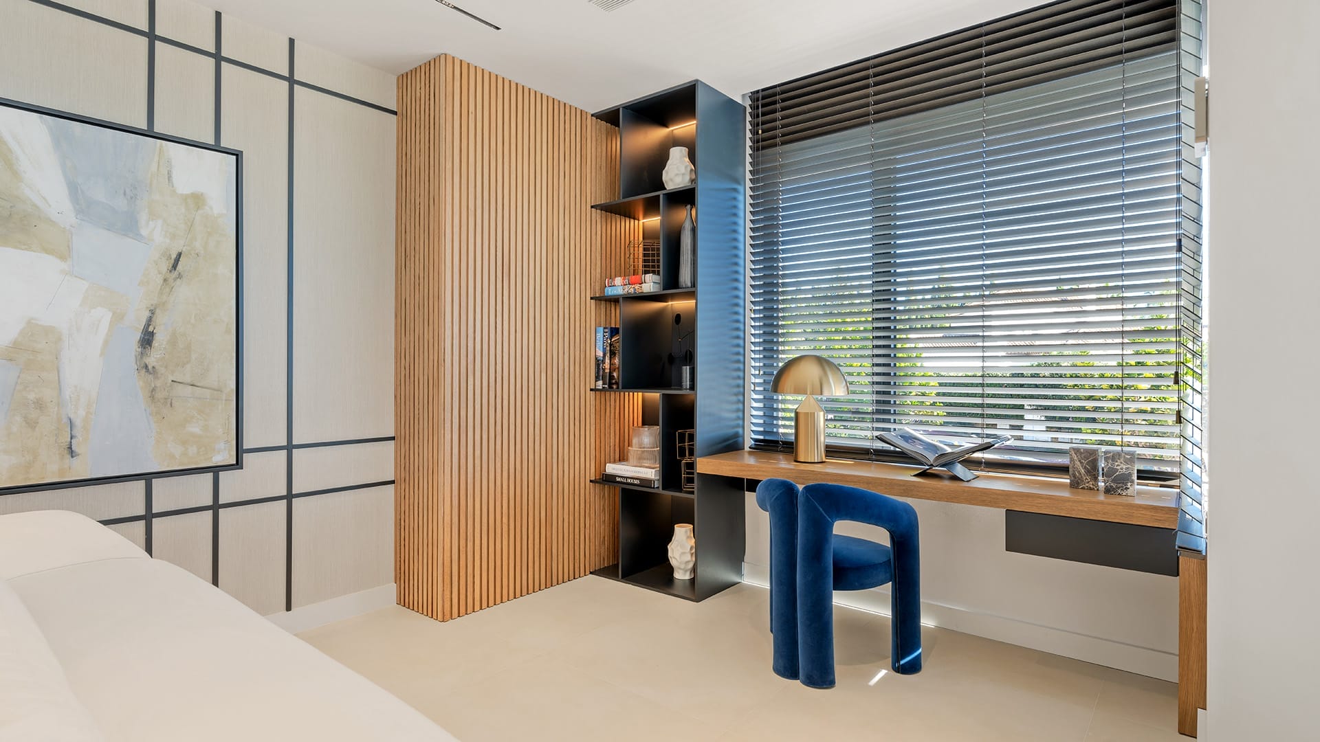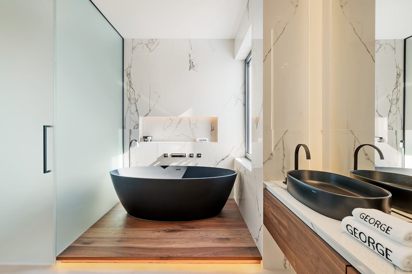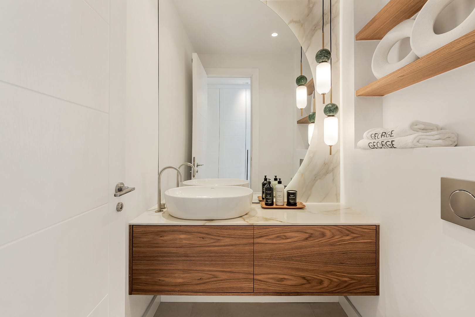 The master bedroom stands out in particular, featuring a private bathroom and an ambiance that blends luxury with warmth. All bathrooms are fitted with high-end materials and contemporary aesthetics.