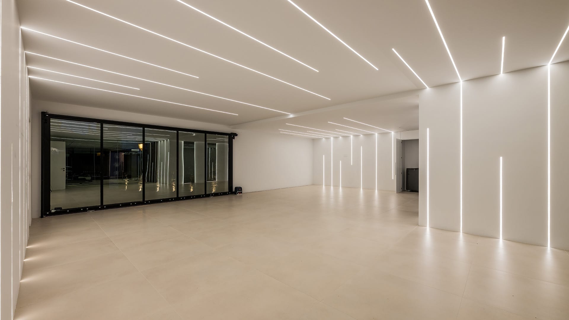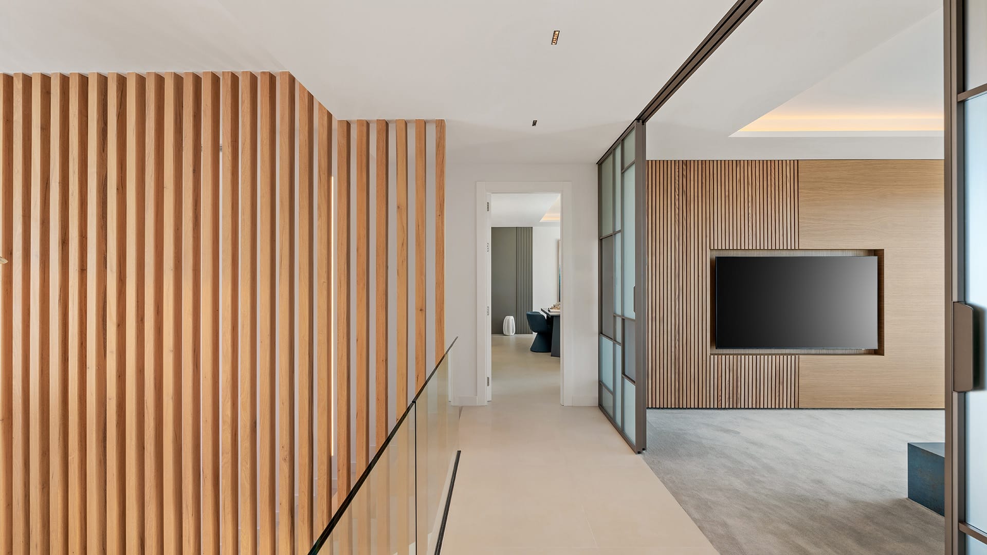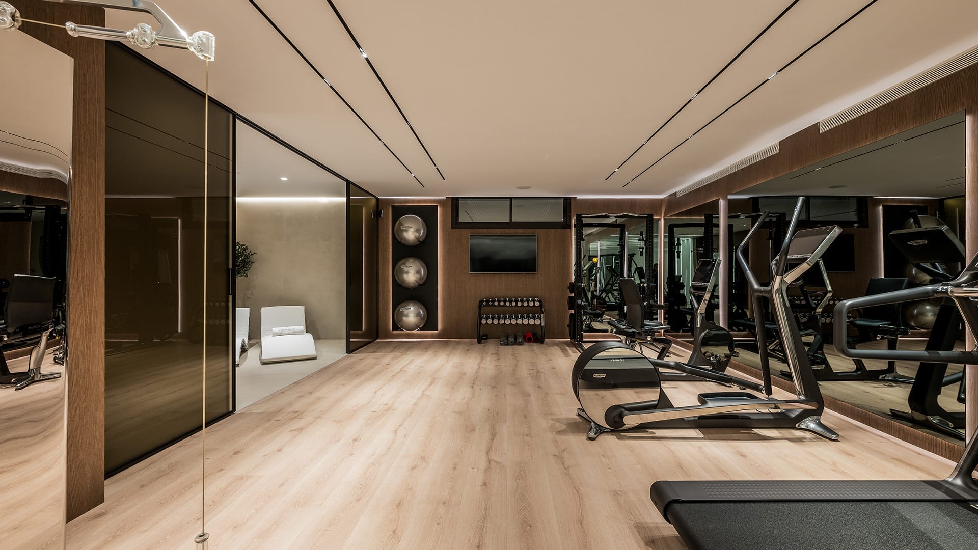 On the lower level, the villa offers additional spaces for relaxation and entertainment, including a sauna, hammam, gym, a small wine cellar, and a guest bedroom with a bathroom. The garage, with its glass door, is designed to let in natural light and maintain a sense of openness.