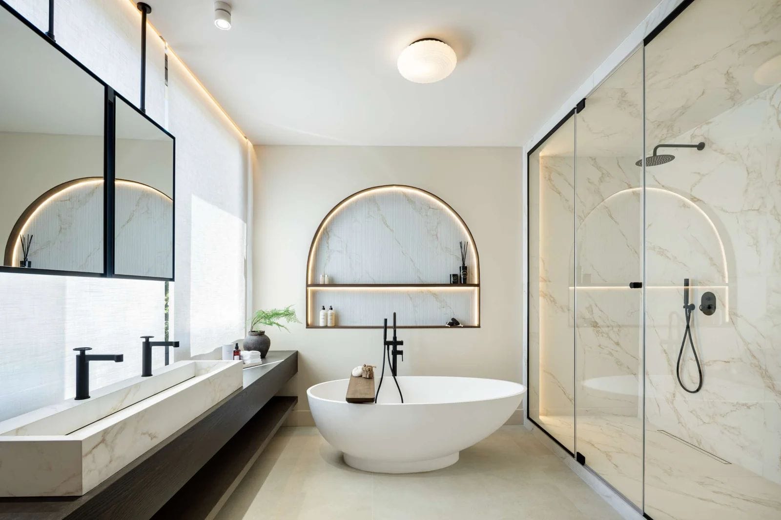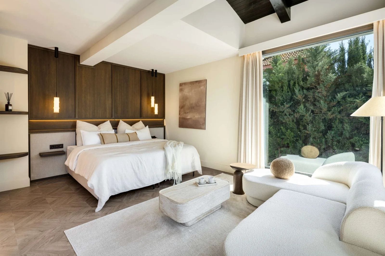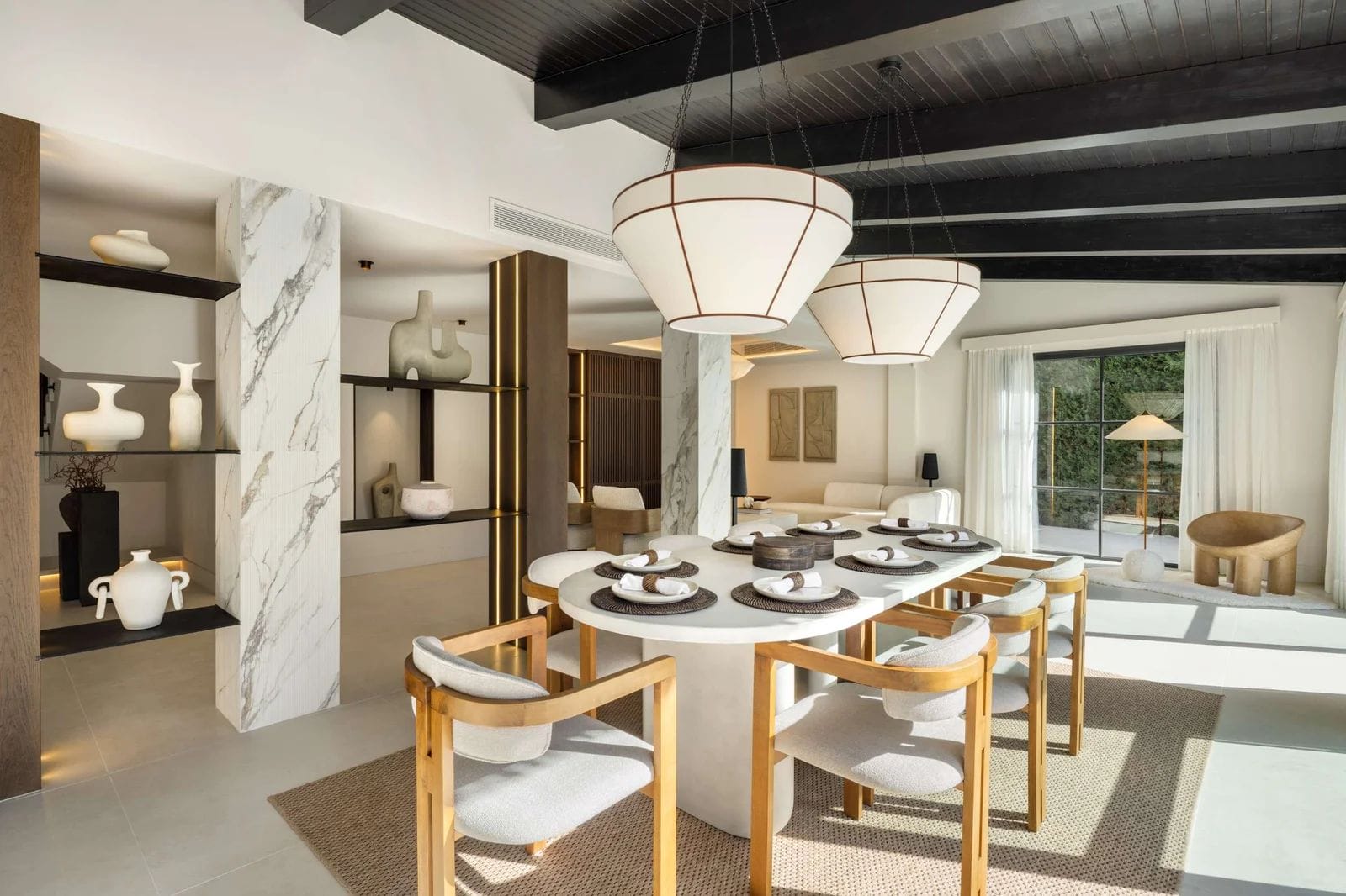 Redesigned with Scandinavian and Japandi influences, the home combines natural materials, warm tones, and open-plan living. floor-to-ceiling glass creates a seamless indoor–outdoor flow, connecting the main living areas to landscaped gardens, terraces, and the pool.