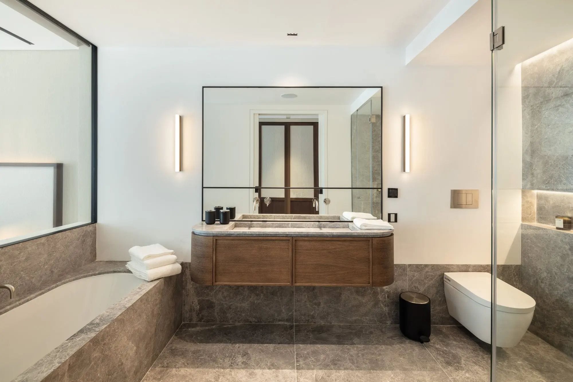 The modern and sophisticated interior design can be seen in each room, from the open kitchen, to the dining-living room and in the bathrooms. It is designed to be comfortable and aesthetically beautiful. The appliances are high-end and hidden and the storage areas are abundant. The balance has been achieved with a carefully crafted color palette in its interior design.
