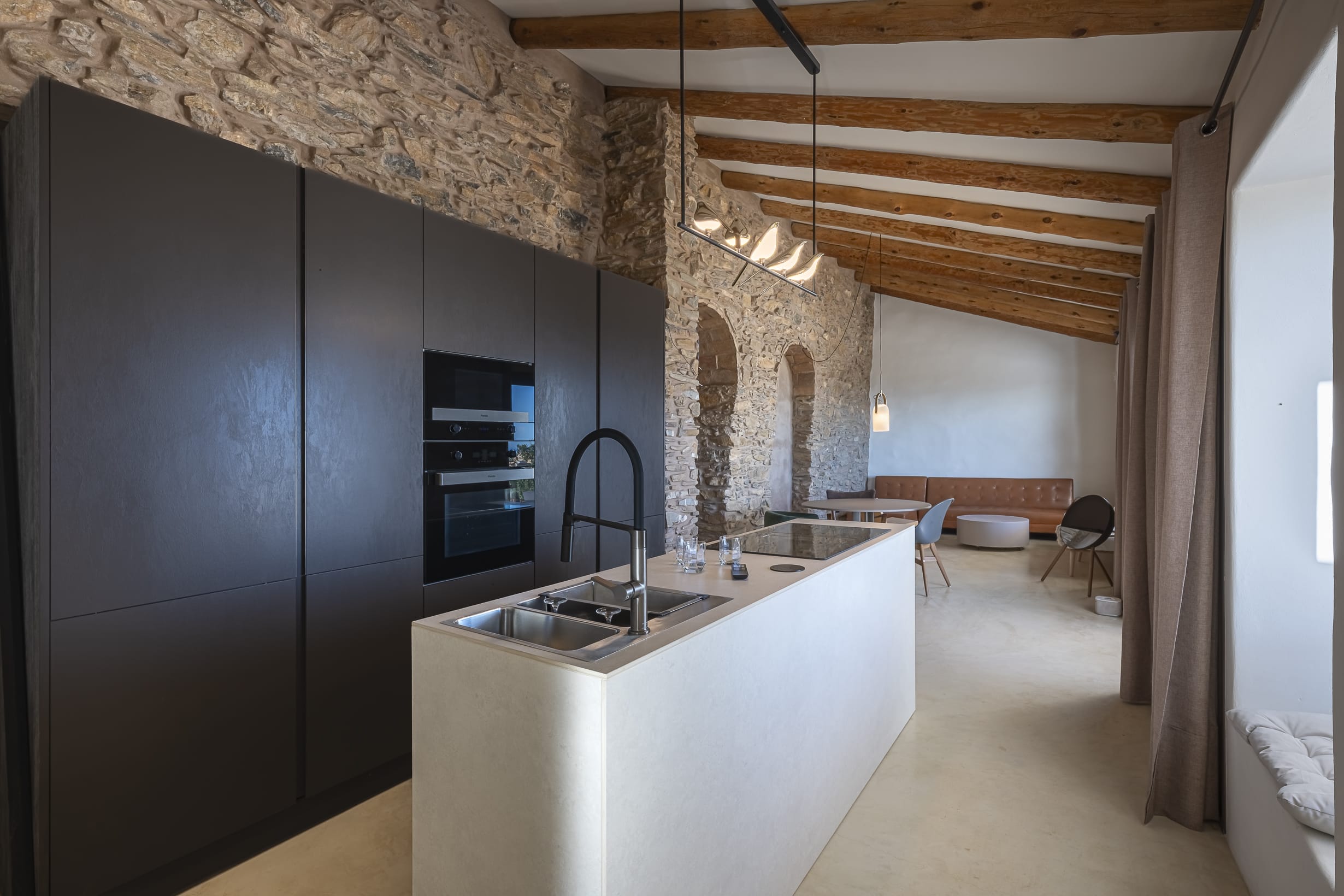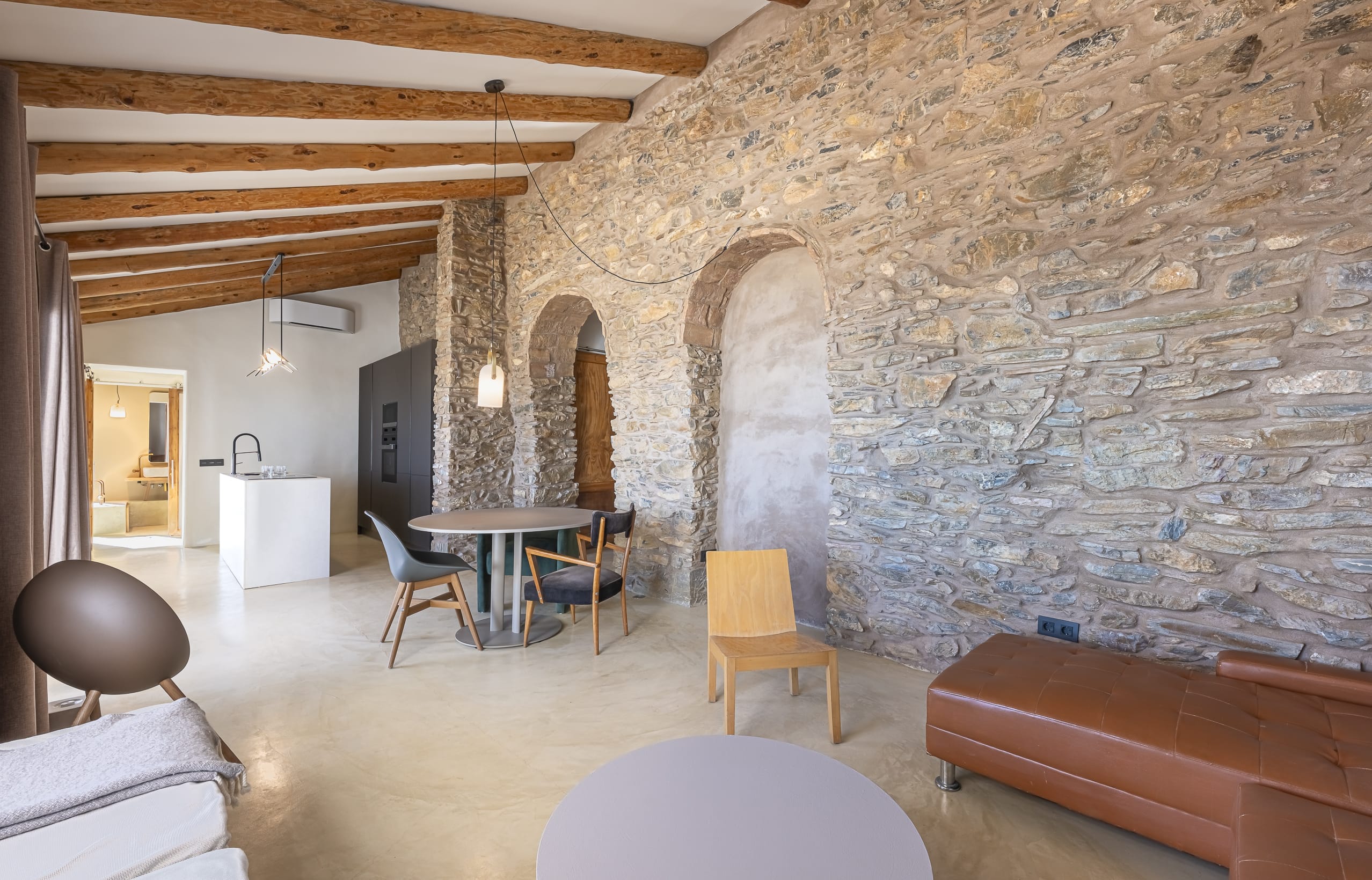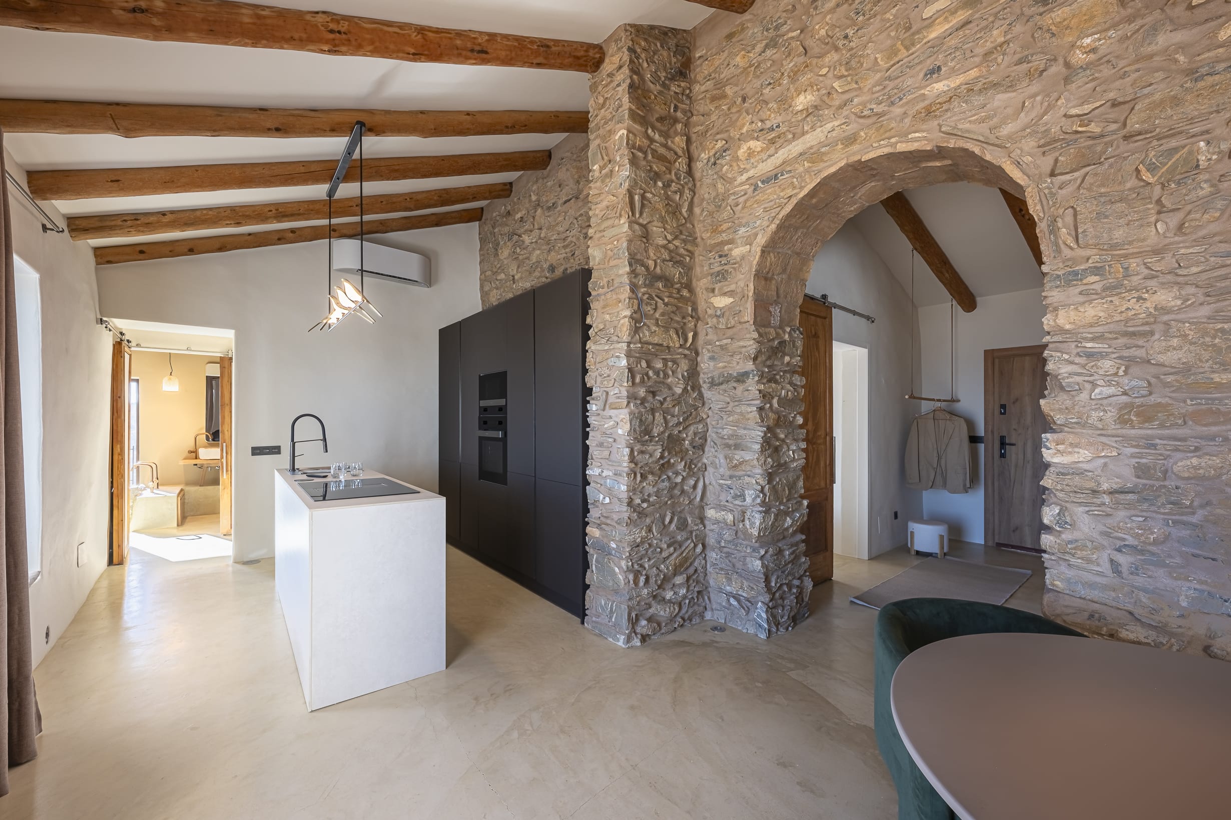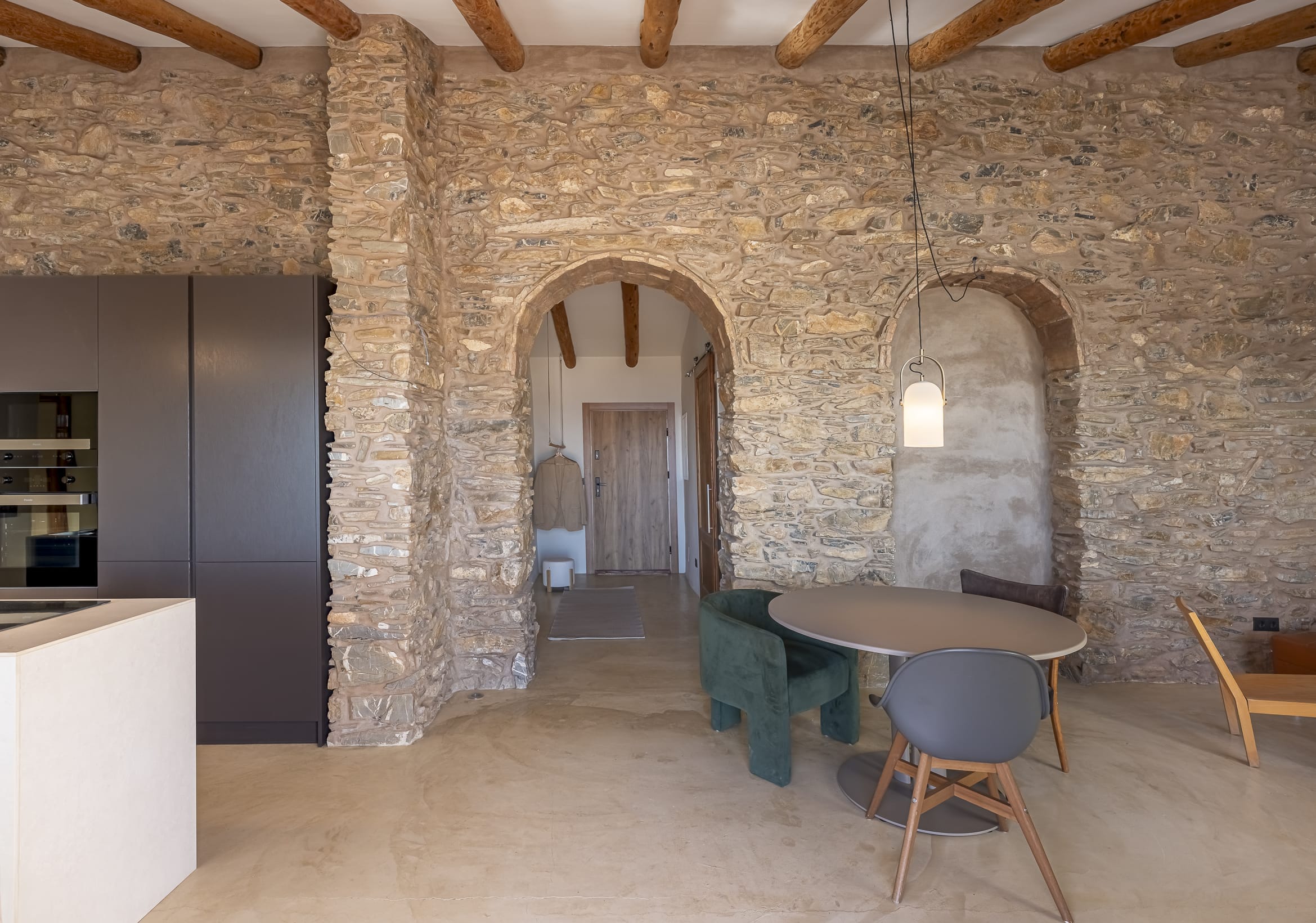The house has been renovated while preserving the thick walls typical of stone homes with over 100 years of history. Its rustic style is modern and minimalist. The flooring is cement, and the high quality windows and frames are made of aluminum with large security glass panels, resistant to noise and heat. The central wall of the house is stone, featuring an original arch that has been restored to its original state.