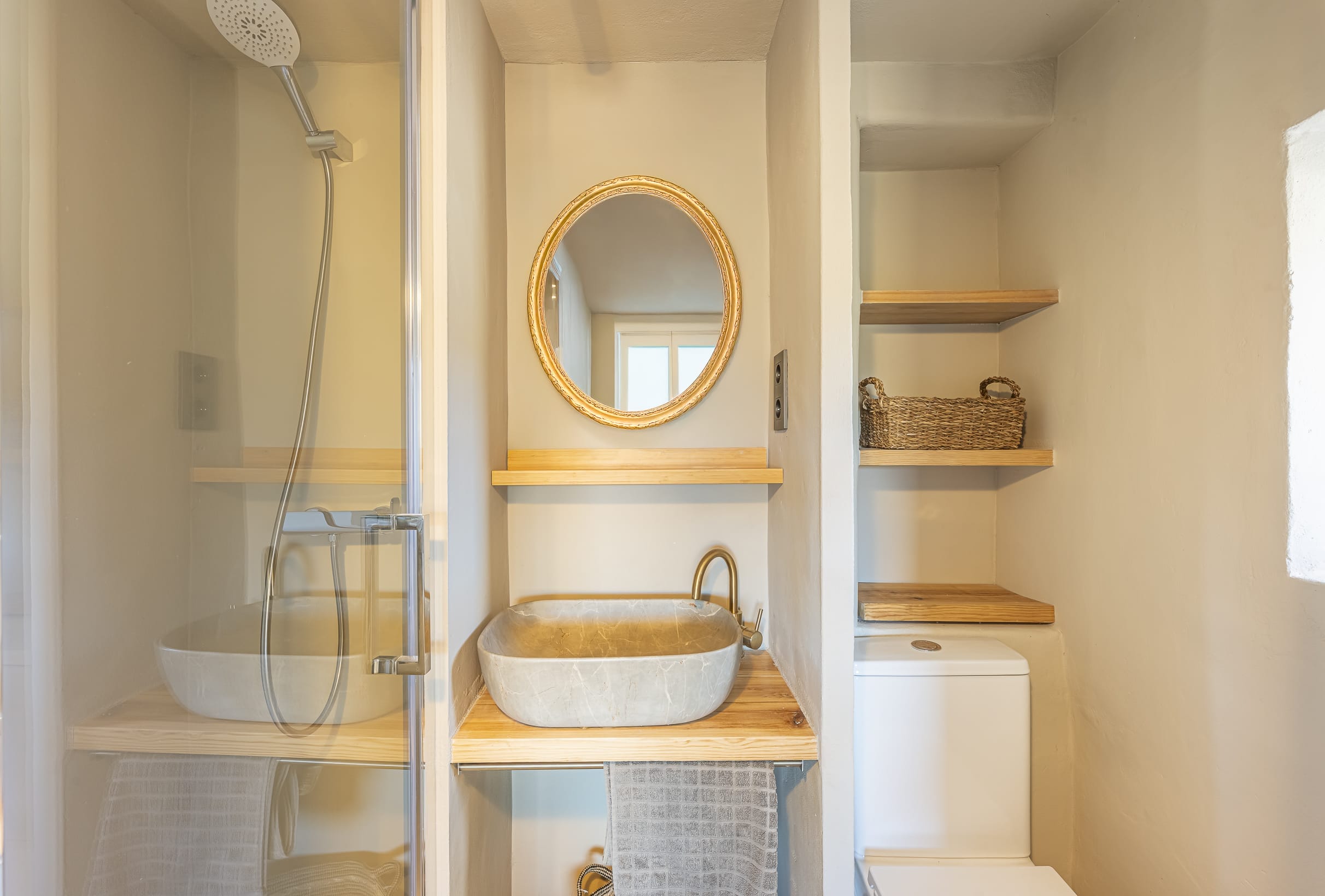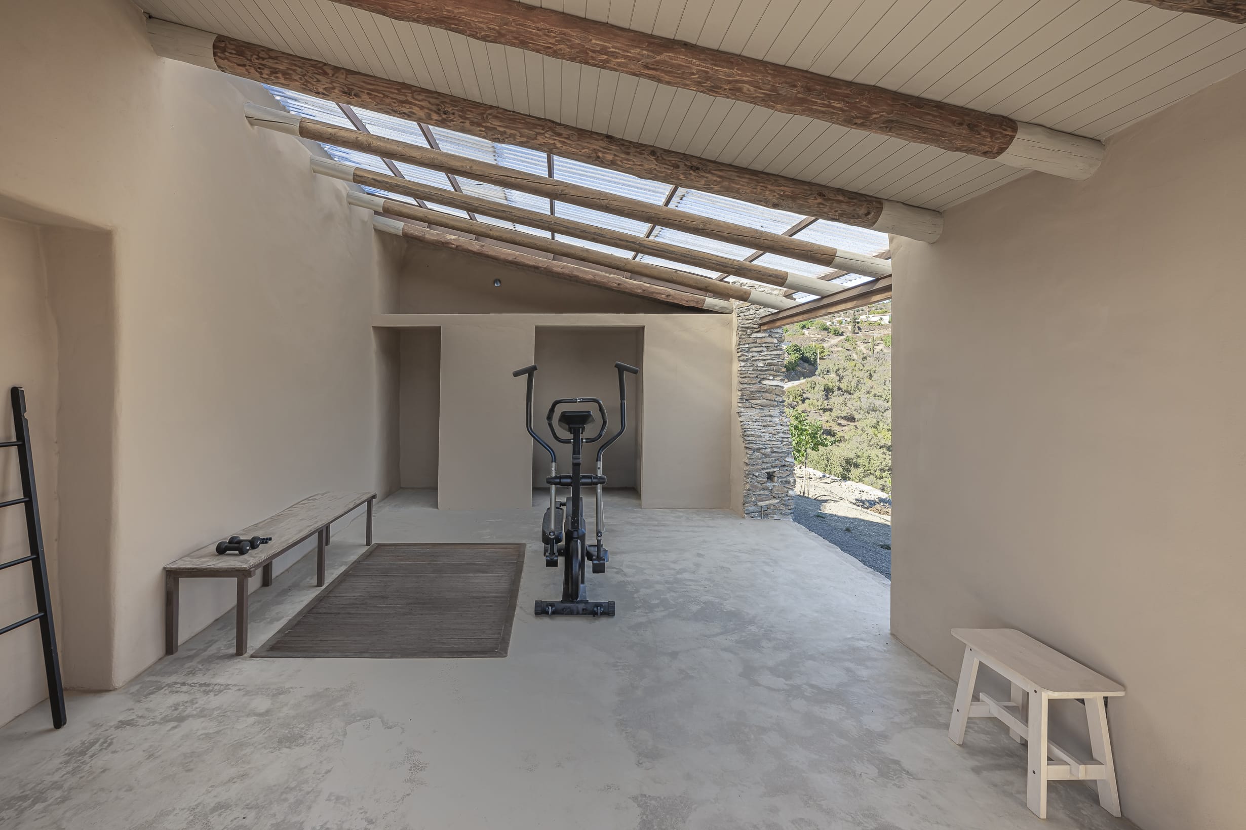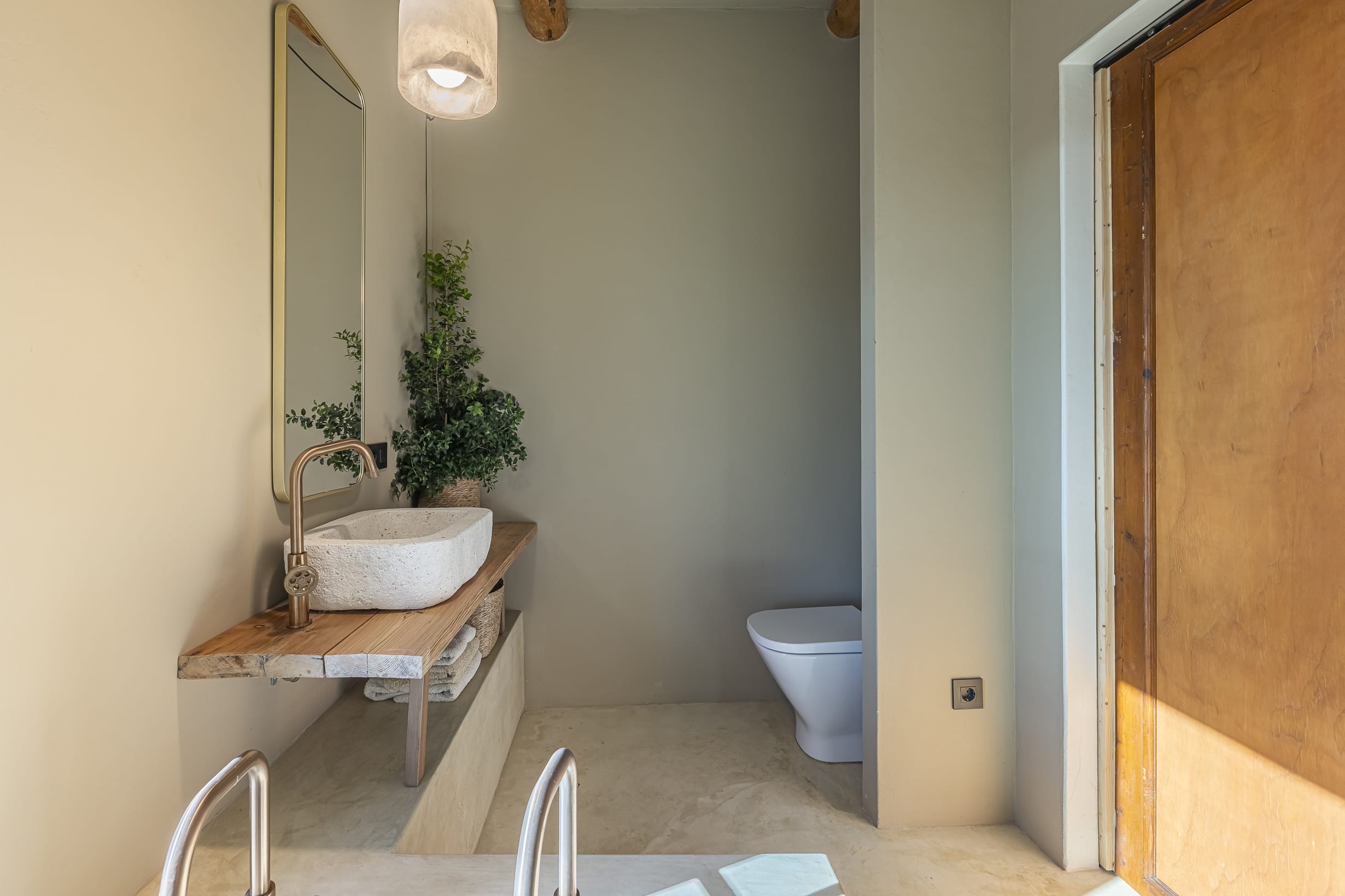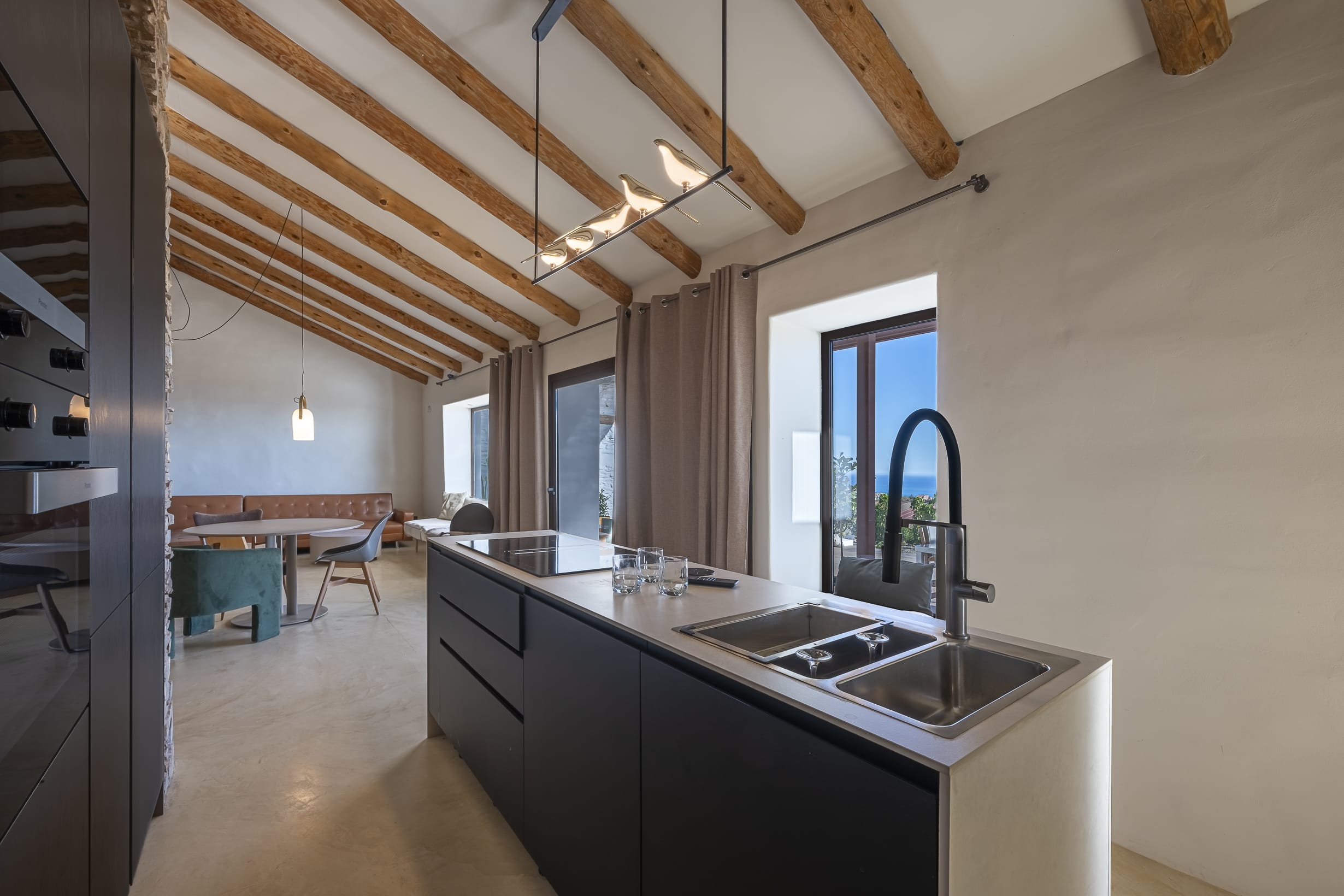 The house has been renovated while preserving the thick walls typical of stone homes with over 100 years of history. Its rustic style is modern and minimalist. The flooring is cement, and the high quality windows and frames are made of aluminum with large security glass panels, resistant to noise and heat. The central wall of the house is stone, featuring an original arch that has been restored to its original state.