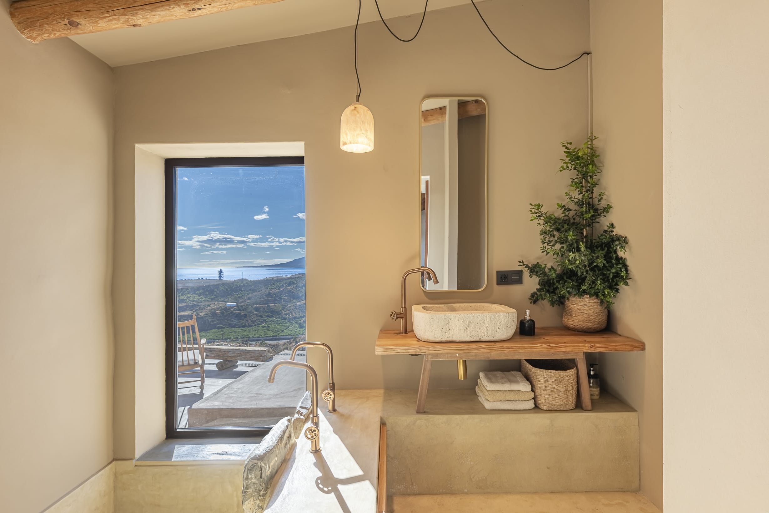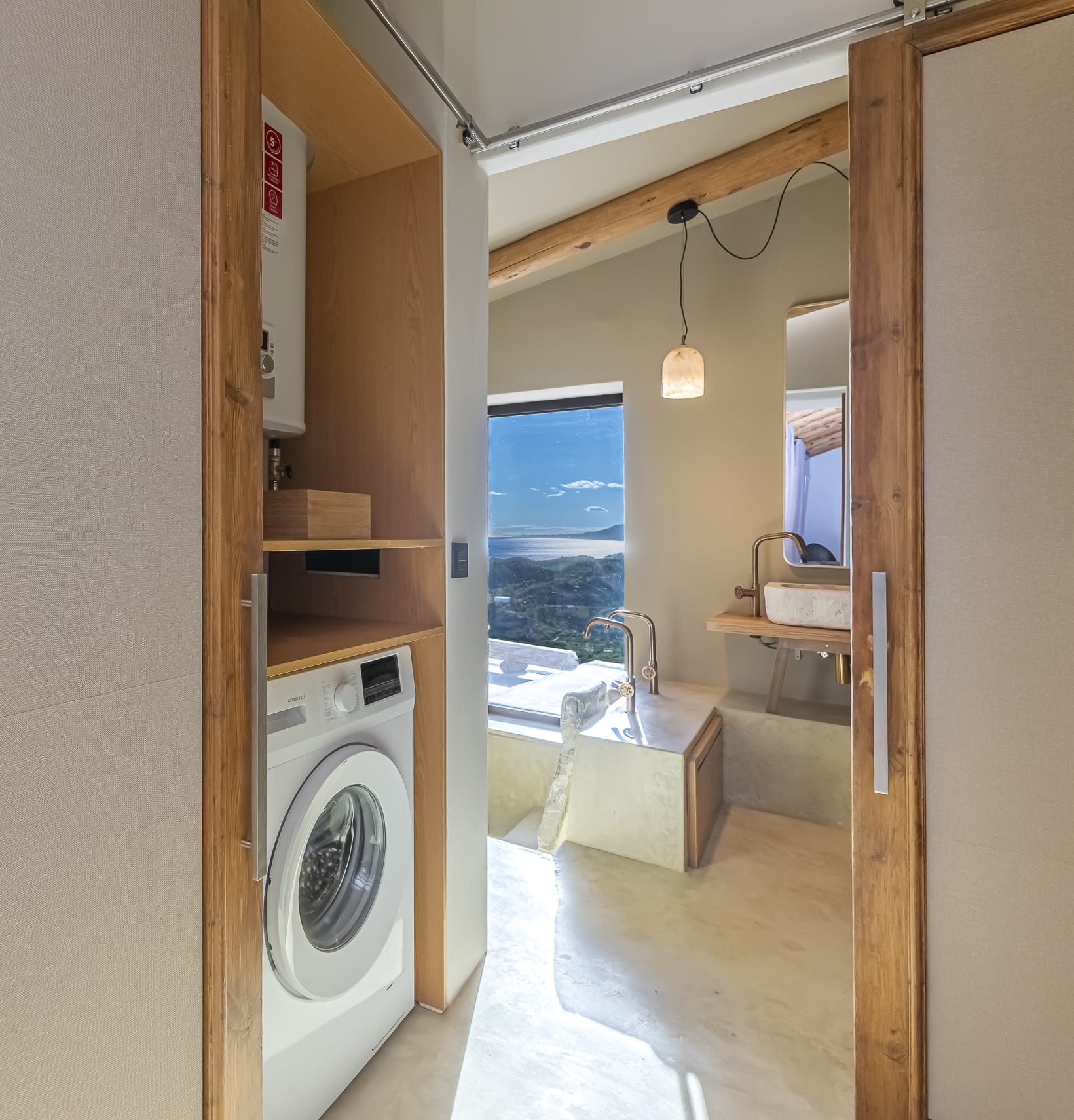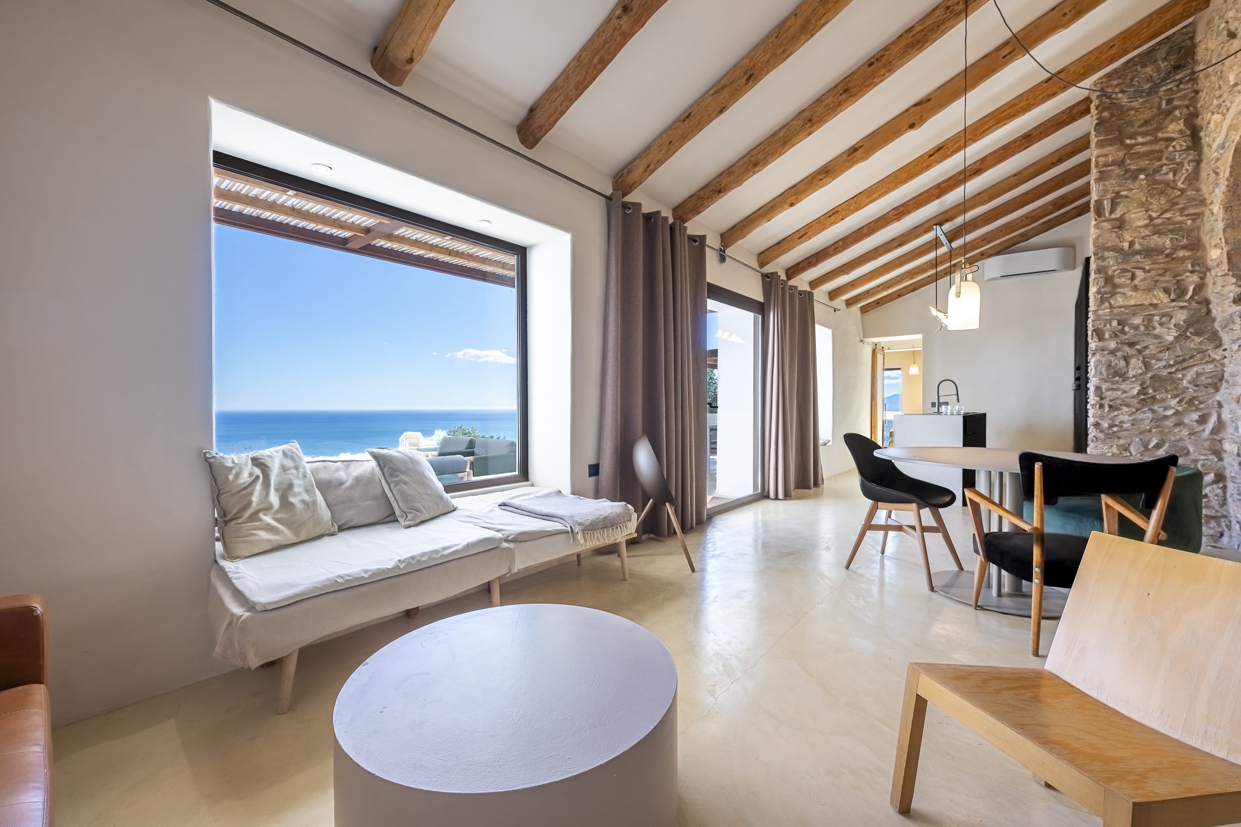 The open-plan living room includes a modern kitchen with an island, allowing you to cook while enjoying sea views. All rooms are bright and offer views. There are two porches with sea views. The property features two bedrooms, one with an integrated toilet and shower, and another larger bathroom with a custom-made bathtub, including hot stones designed to support your back once the water heats them.