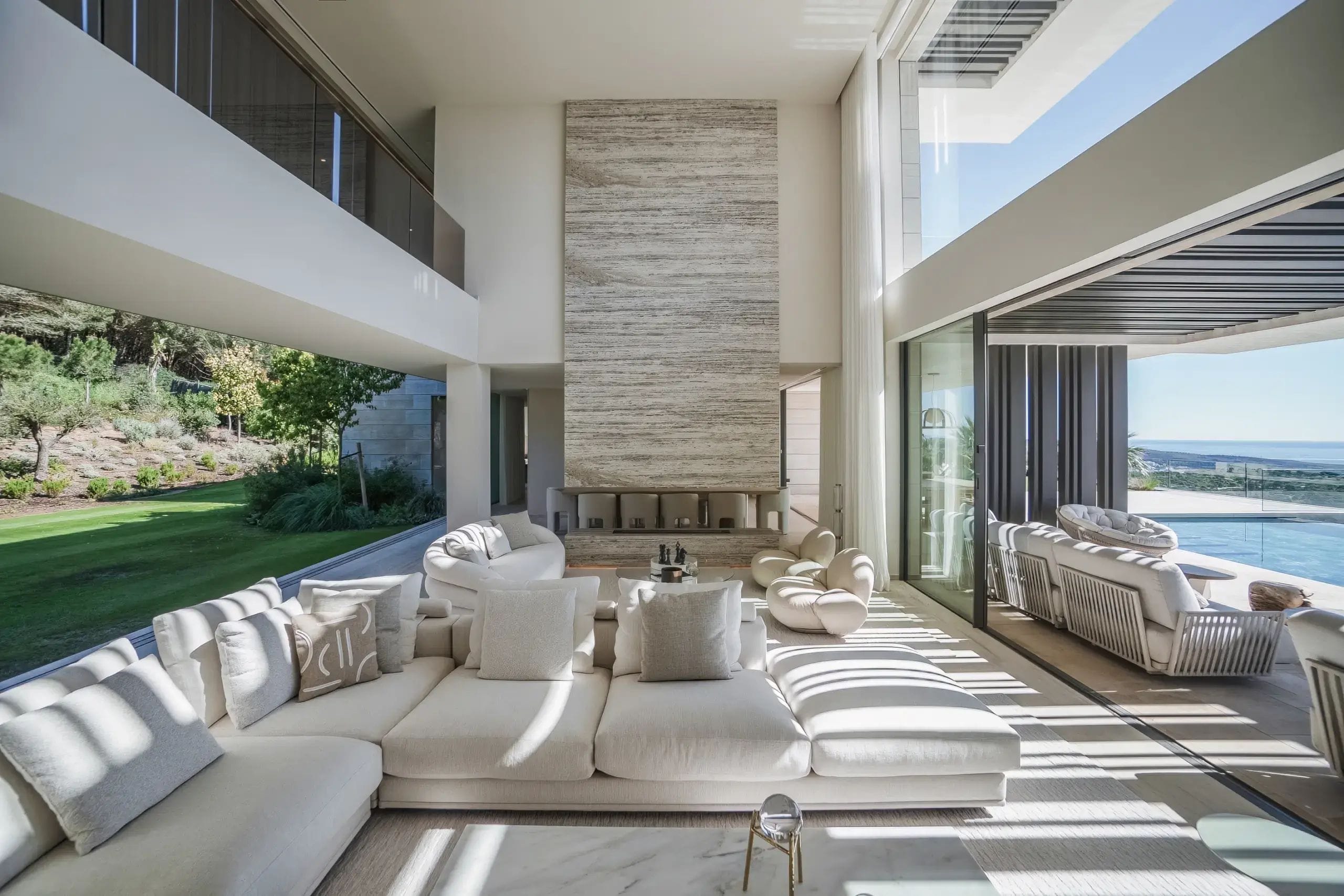The interior of the villa stands out for its modern and sophisticated design, with spacious and bright areas that open up to the most impressive views of Sotogrande. The villa features 5 bedrooms, all oriented toward the landscape. The main living room, study, TV room, and staff bedroom, along with a gym, cinema, and wine cellar, provide a total comfort experience. The open-plan layout and high-end finishes, along with marble and wood elements, add warmth and elegance to every corner.